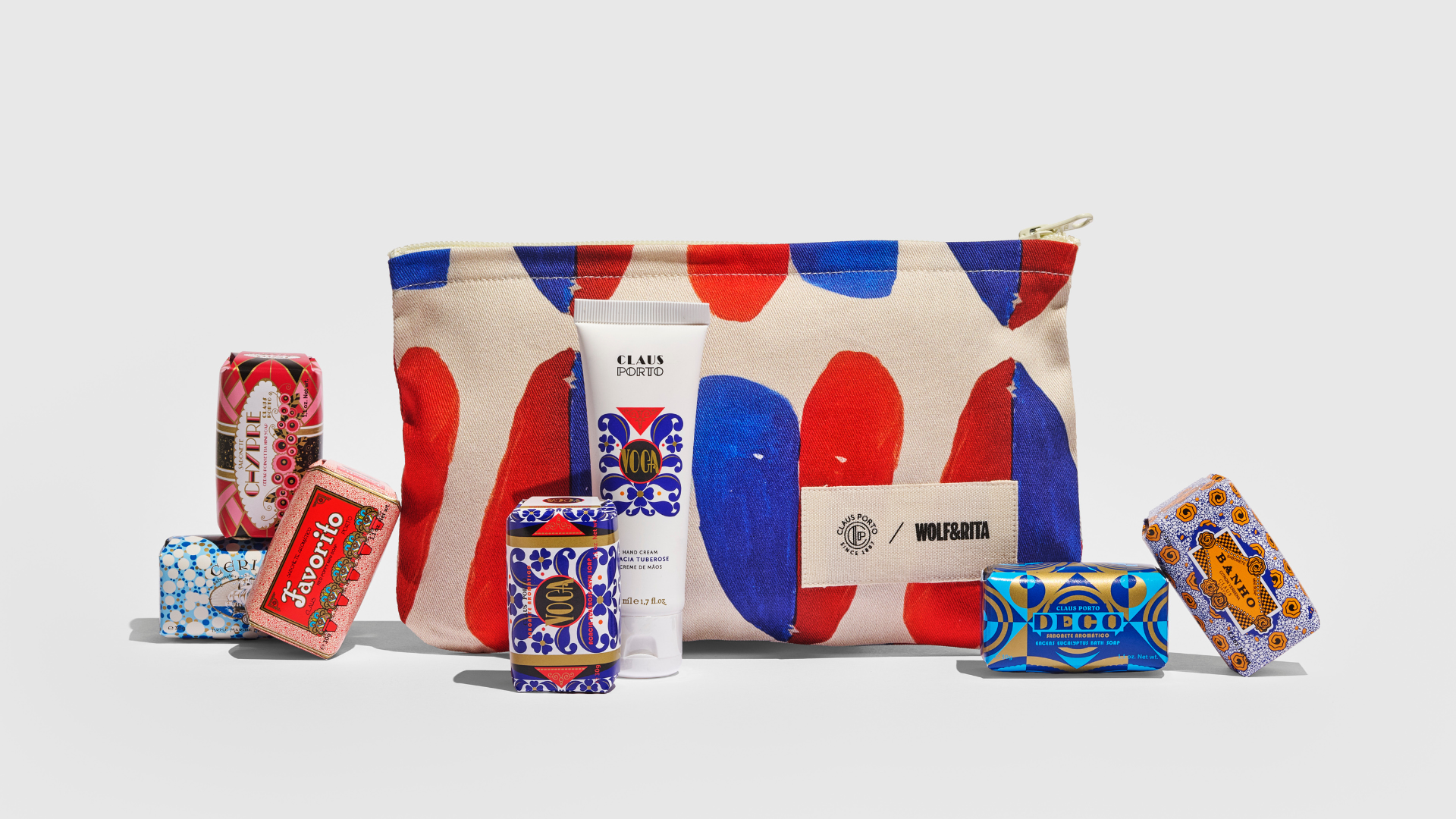 From Northern Portugal, where craftsmanship and authenticity run deep, two family-born brands gather in a cheerful, sustainable way. We blended worlds with Claus Porto to create a necessaire made from repurposed fabric and inside, their iconic mini soaps and a nourishing hand cream.