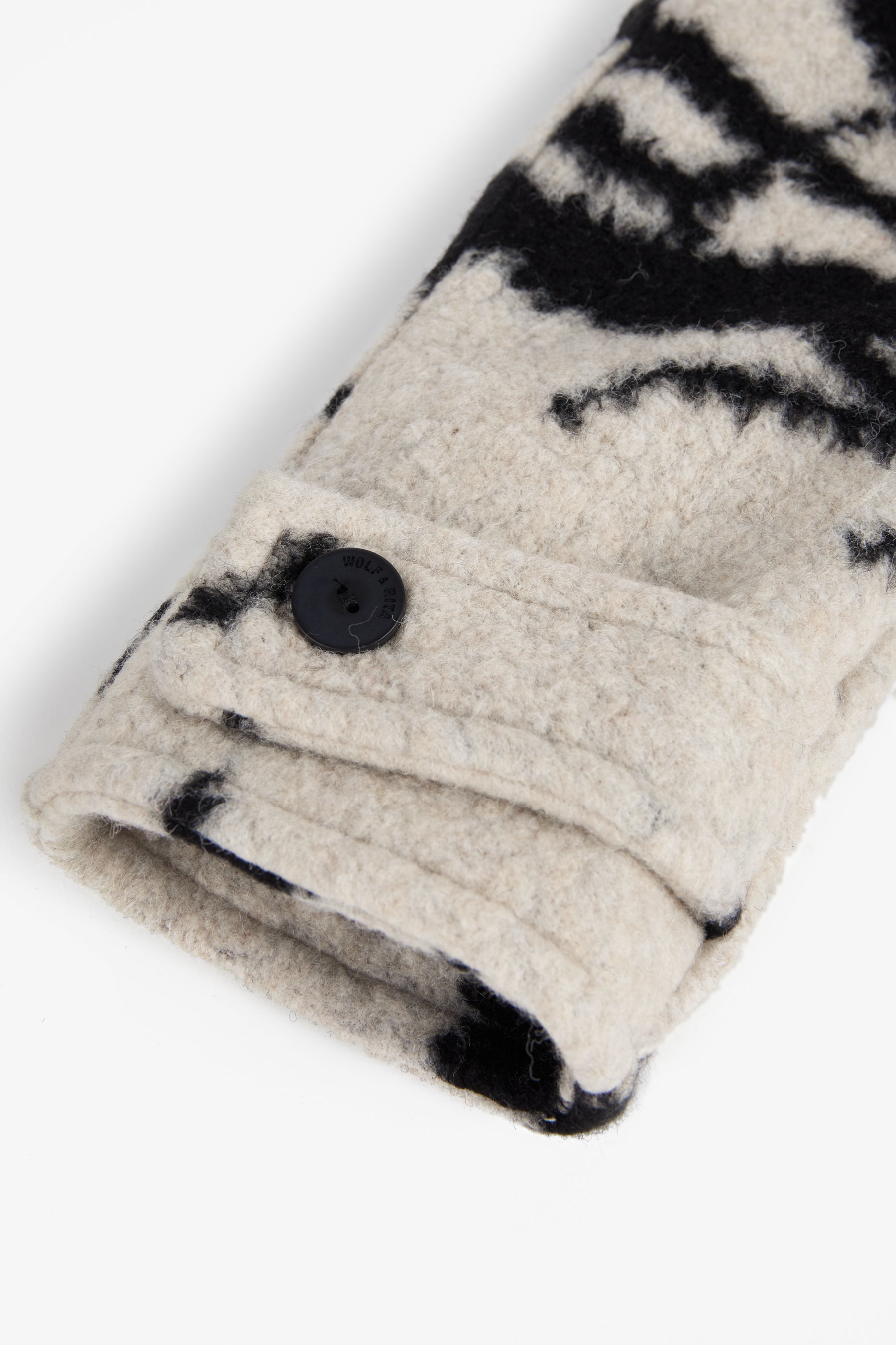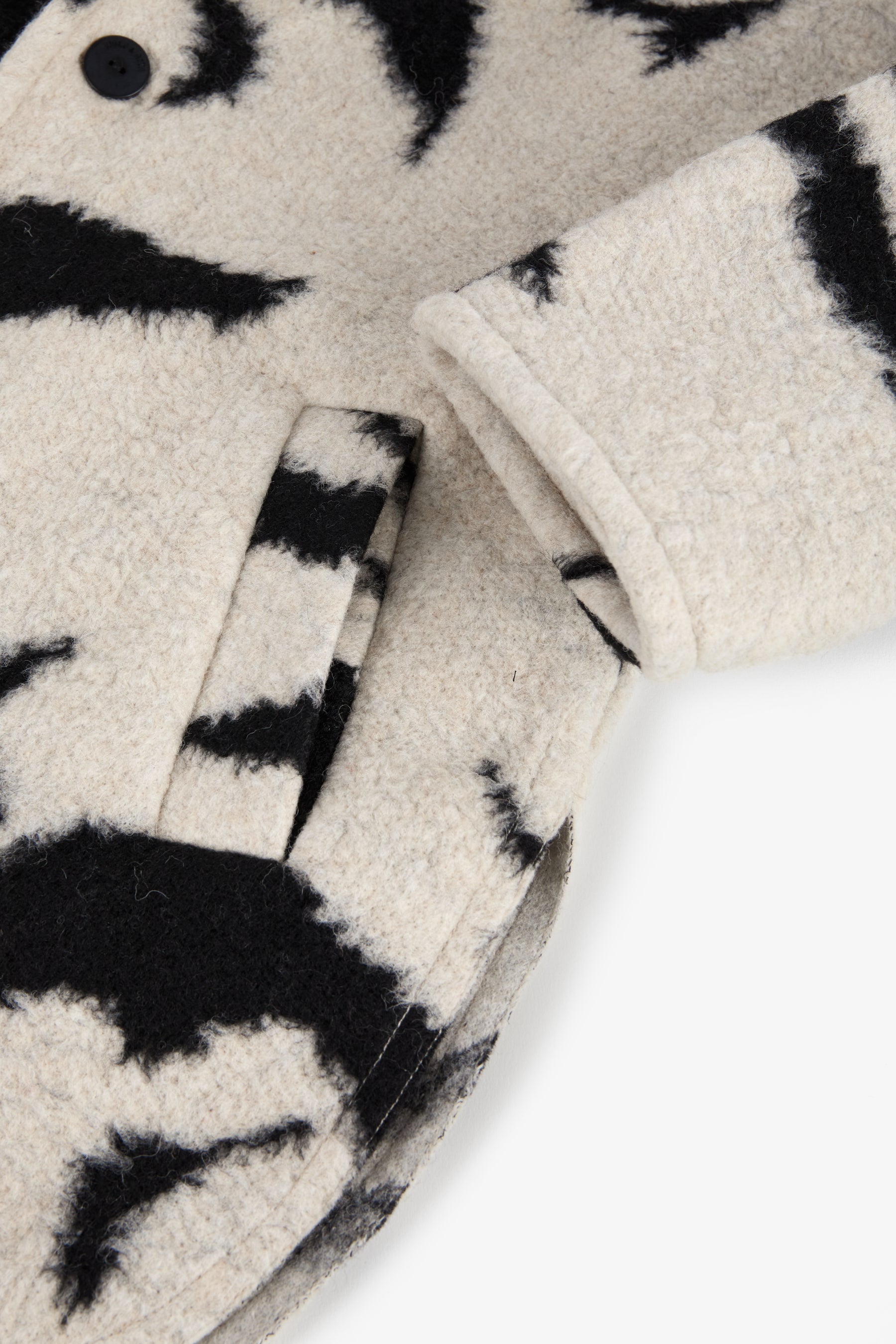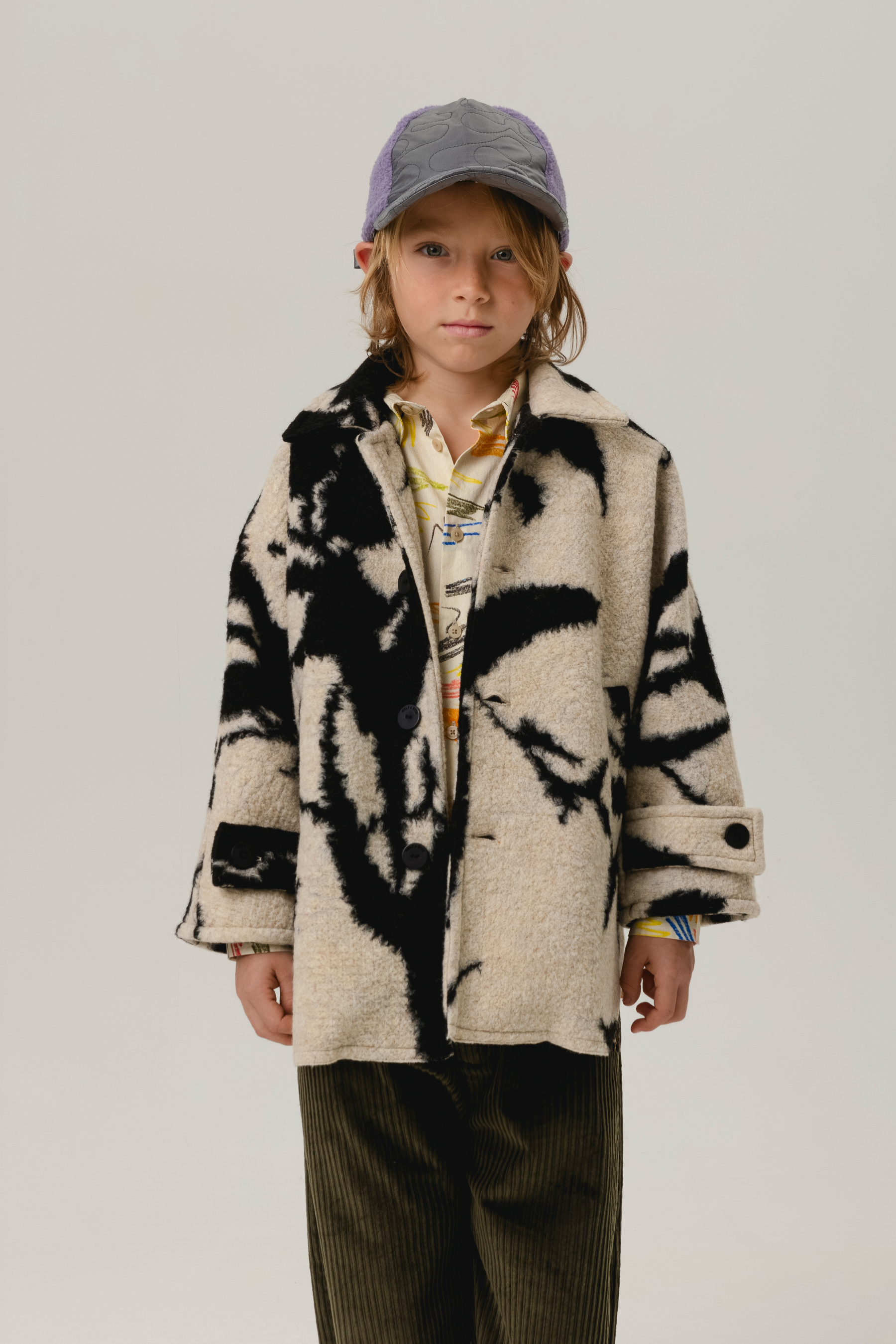 Button-up oversized coat with baseball hem and side welt pockets, regular shirt collar, dolman sleeves, and tab cuffs