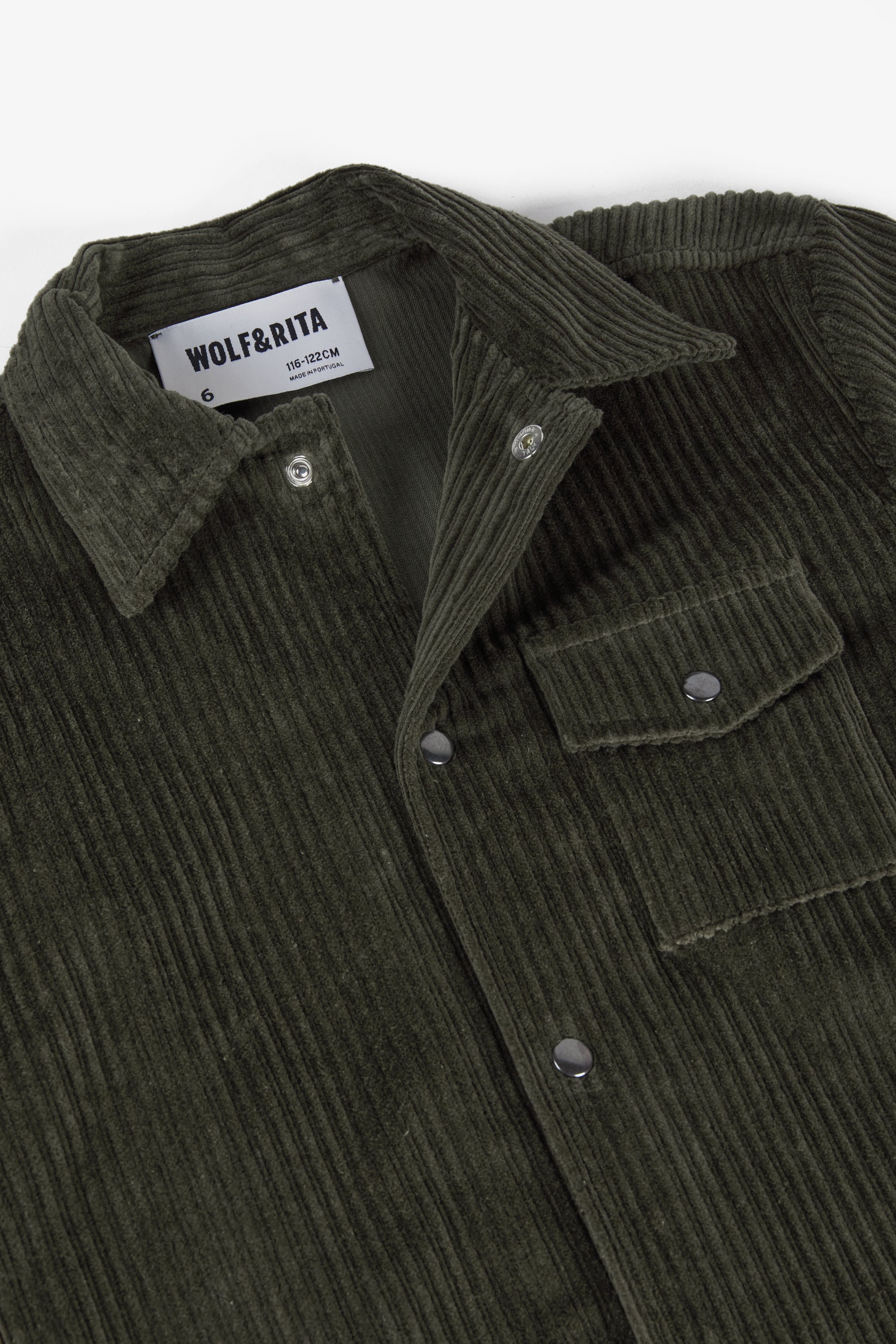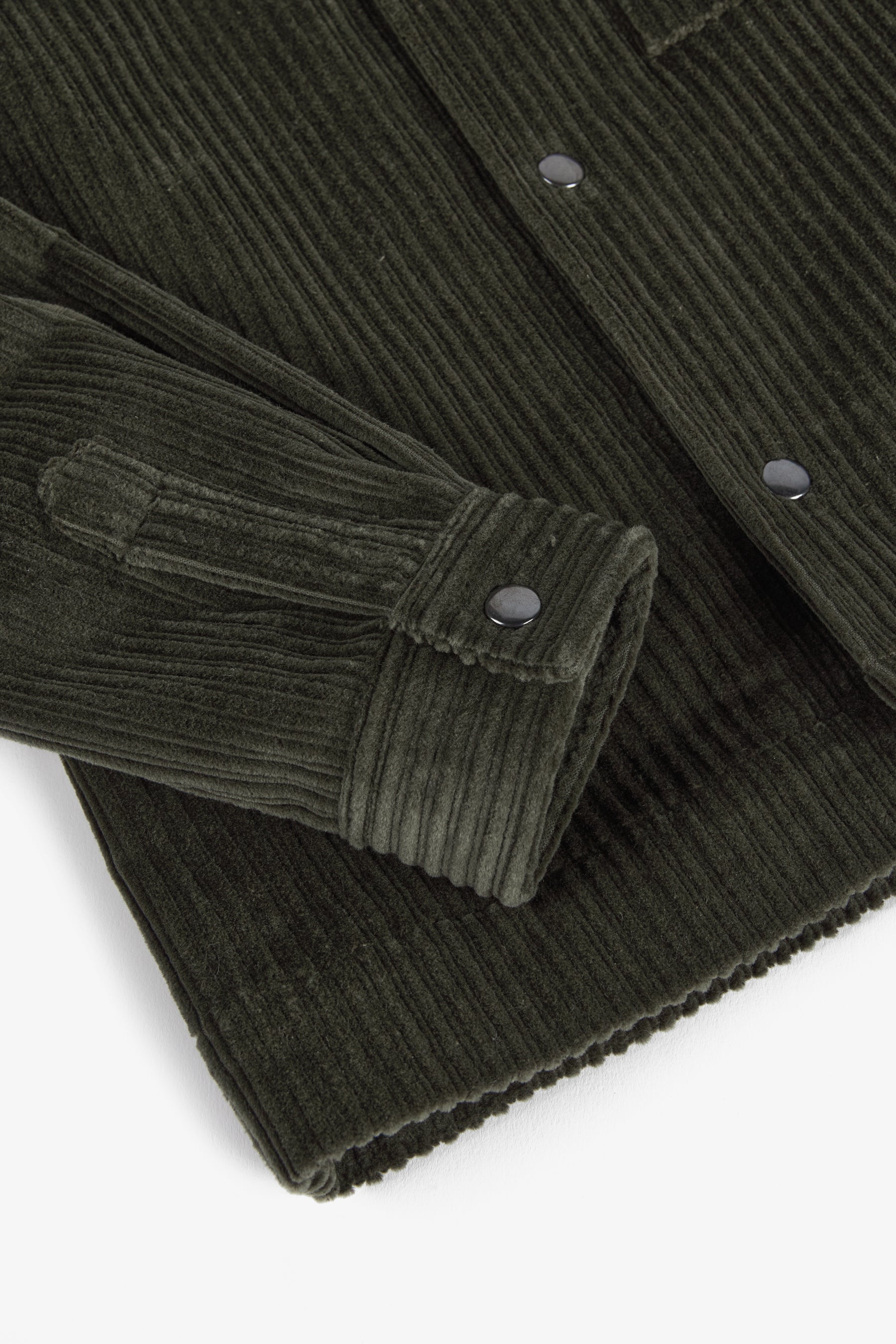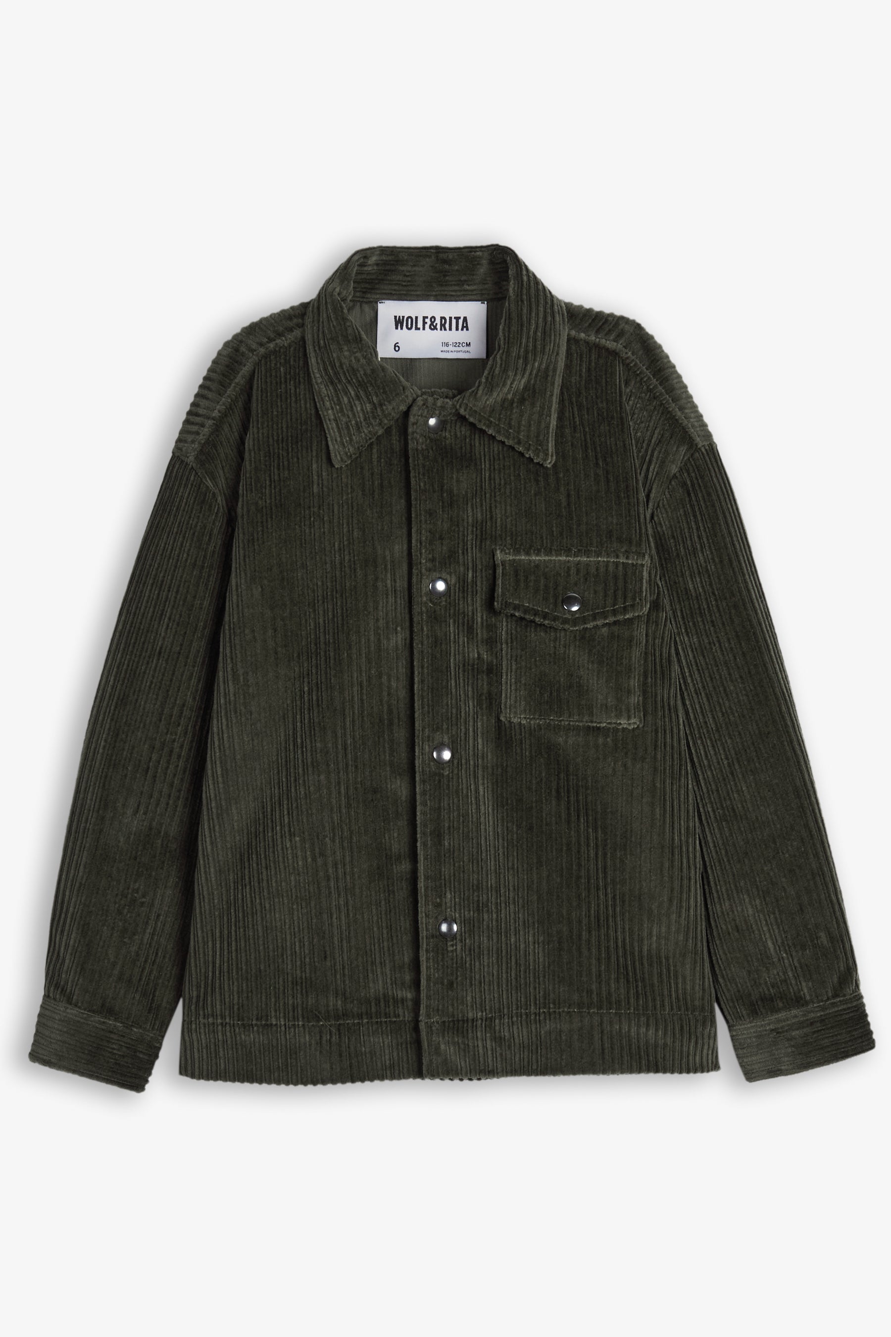 Long sleeved button-up overshirt, regular collar, metallic front and cuff buttons, patch pocket with flap, loose fit