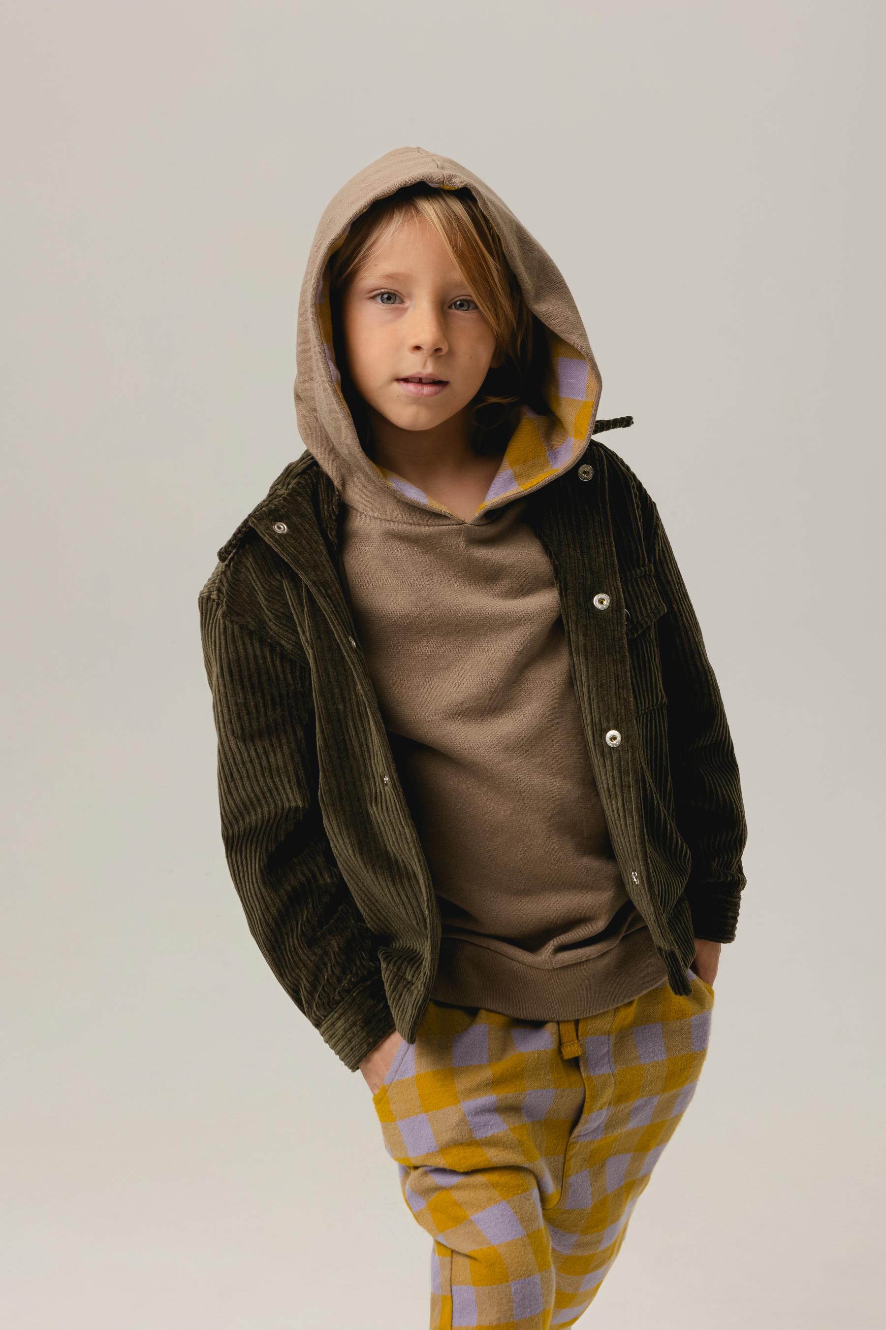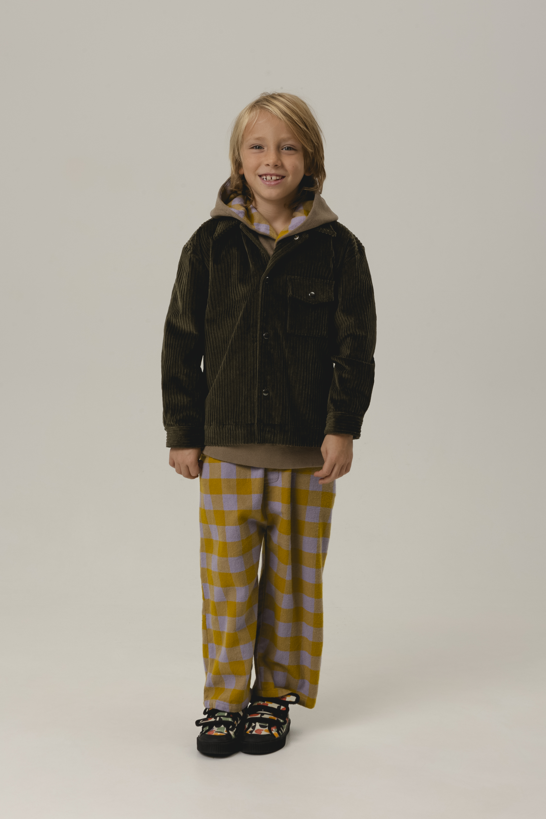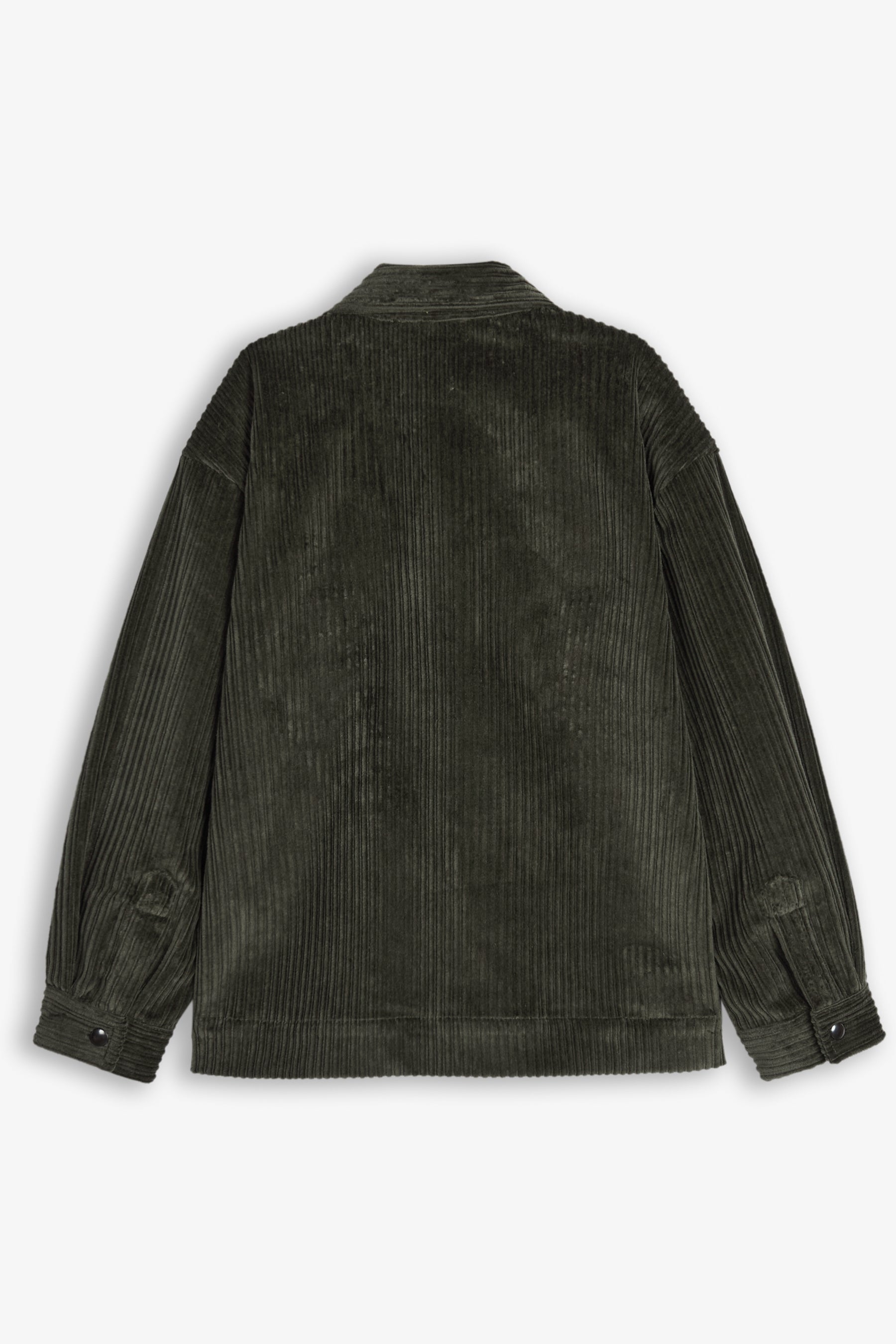 Long sleeved button-up overshirt, regular collar, metallic front and cuff buttons, patch pocket with flap, loose fit