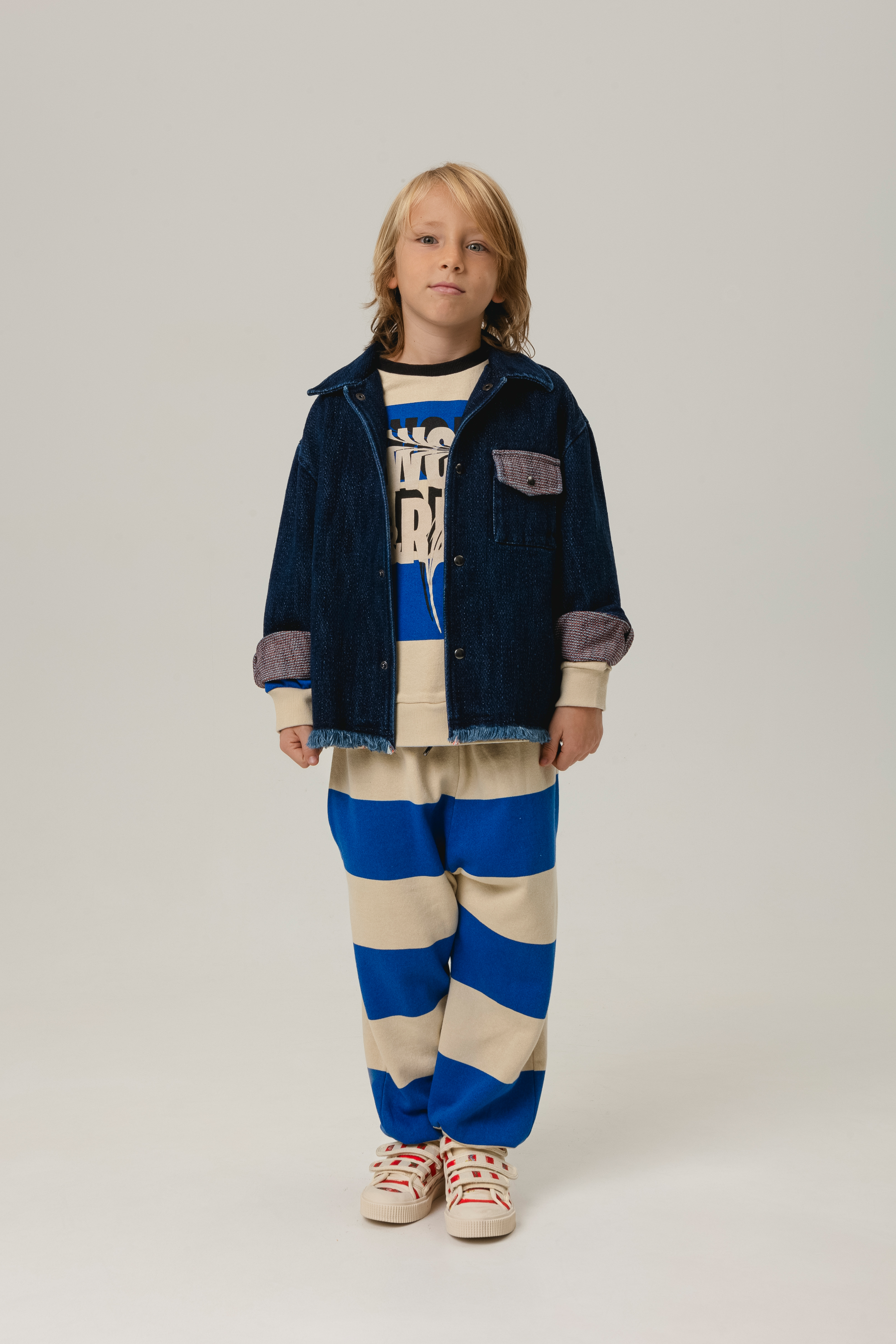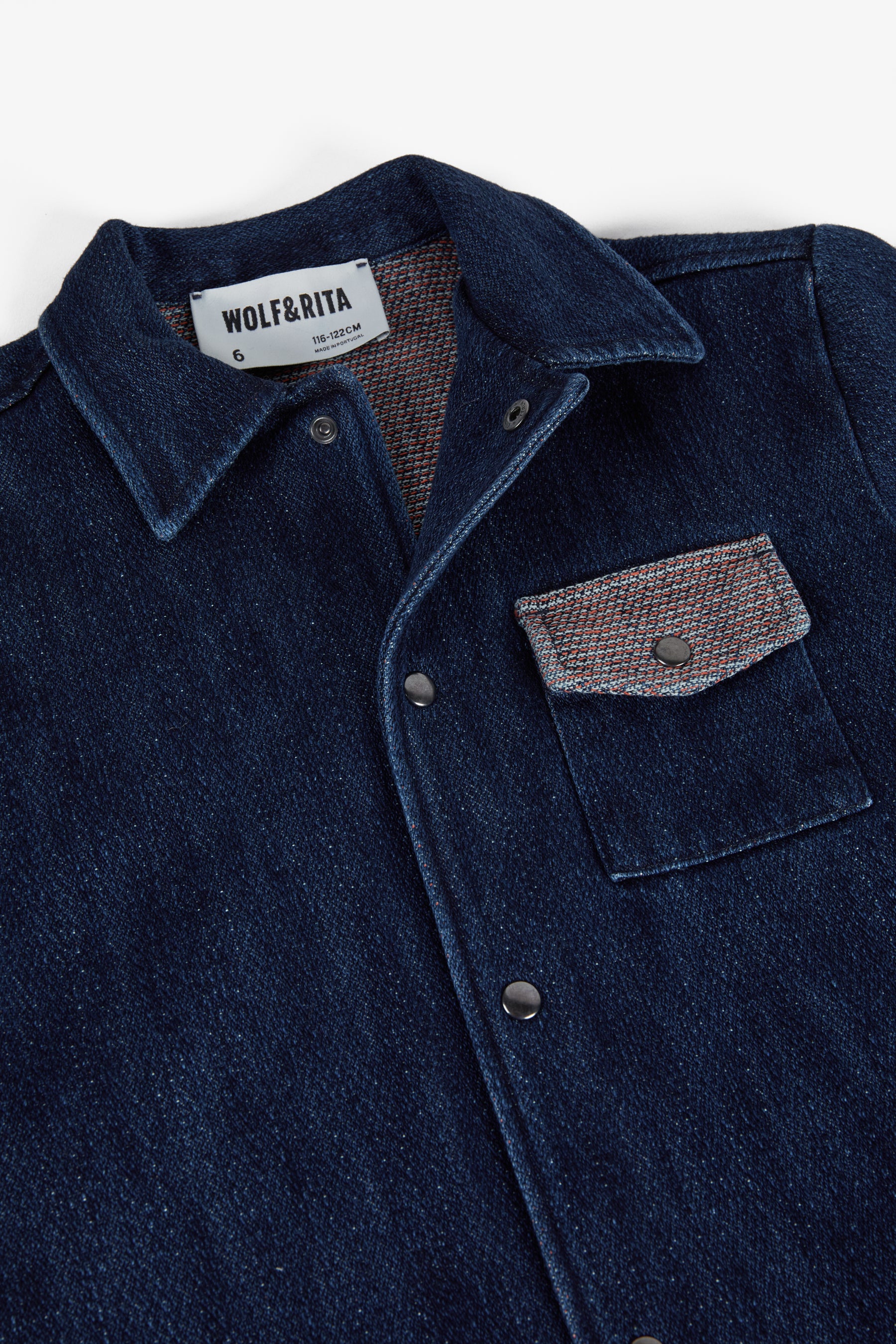 Long sleeved button-up overshirt, regular collar, metallic front and cuff buttons, patch pocket with contrasted flap, raw hem, loose fit