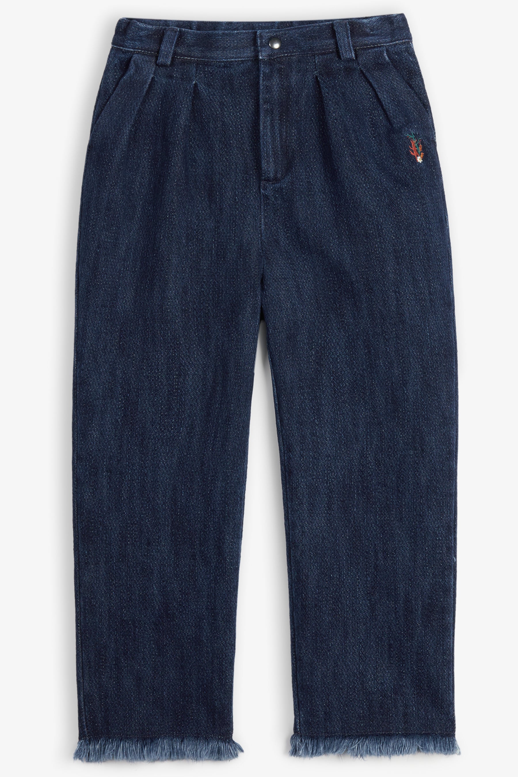 Pleated trousers, slashed pockets, raw hem, small embroidery