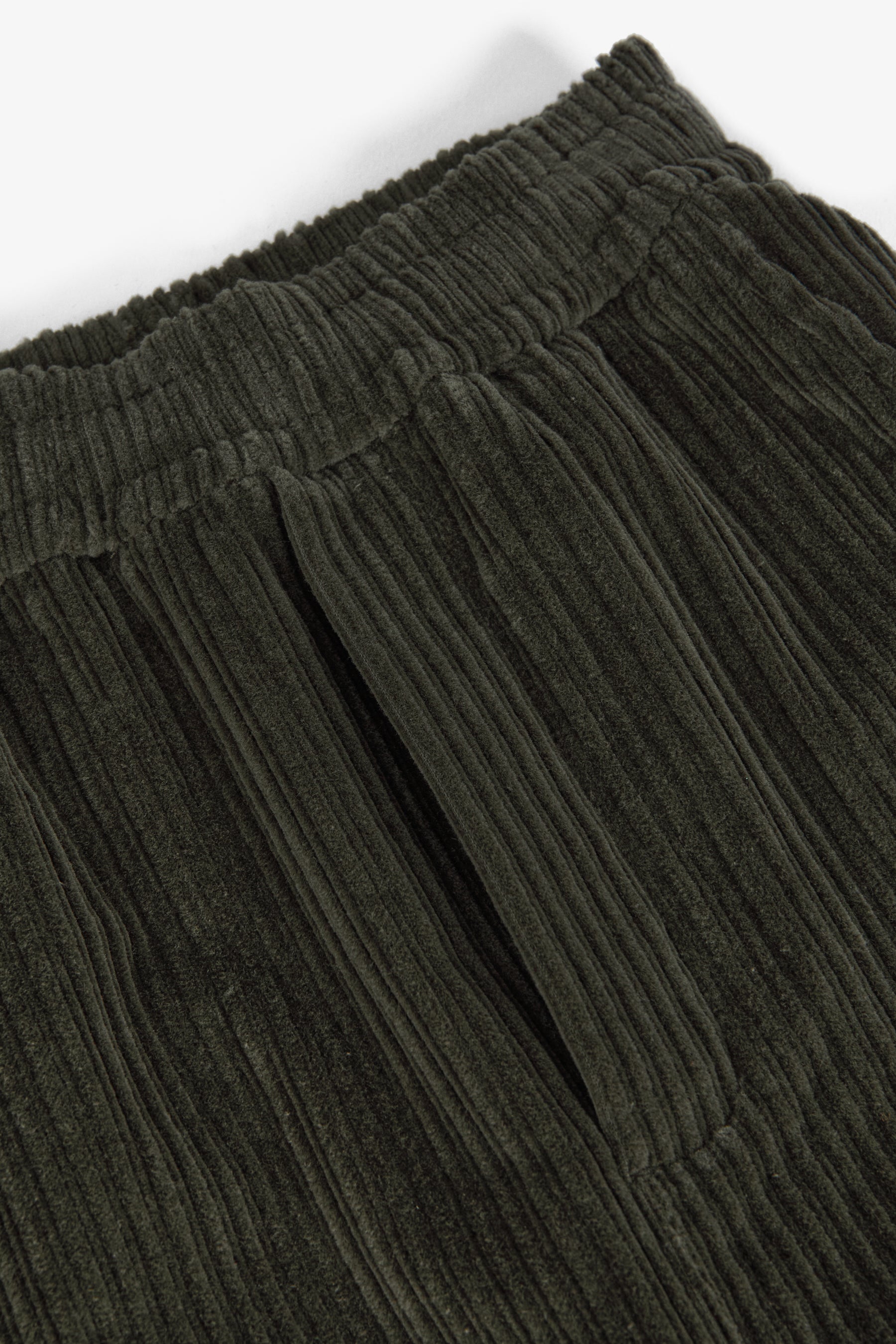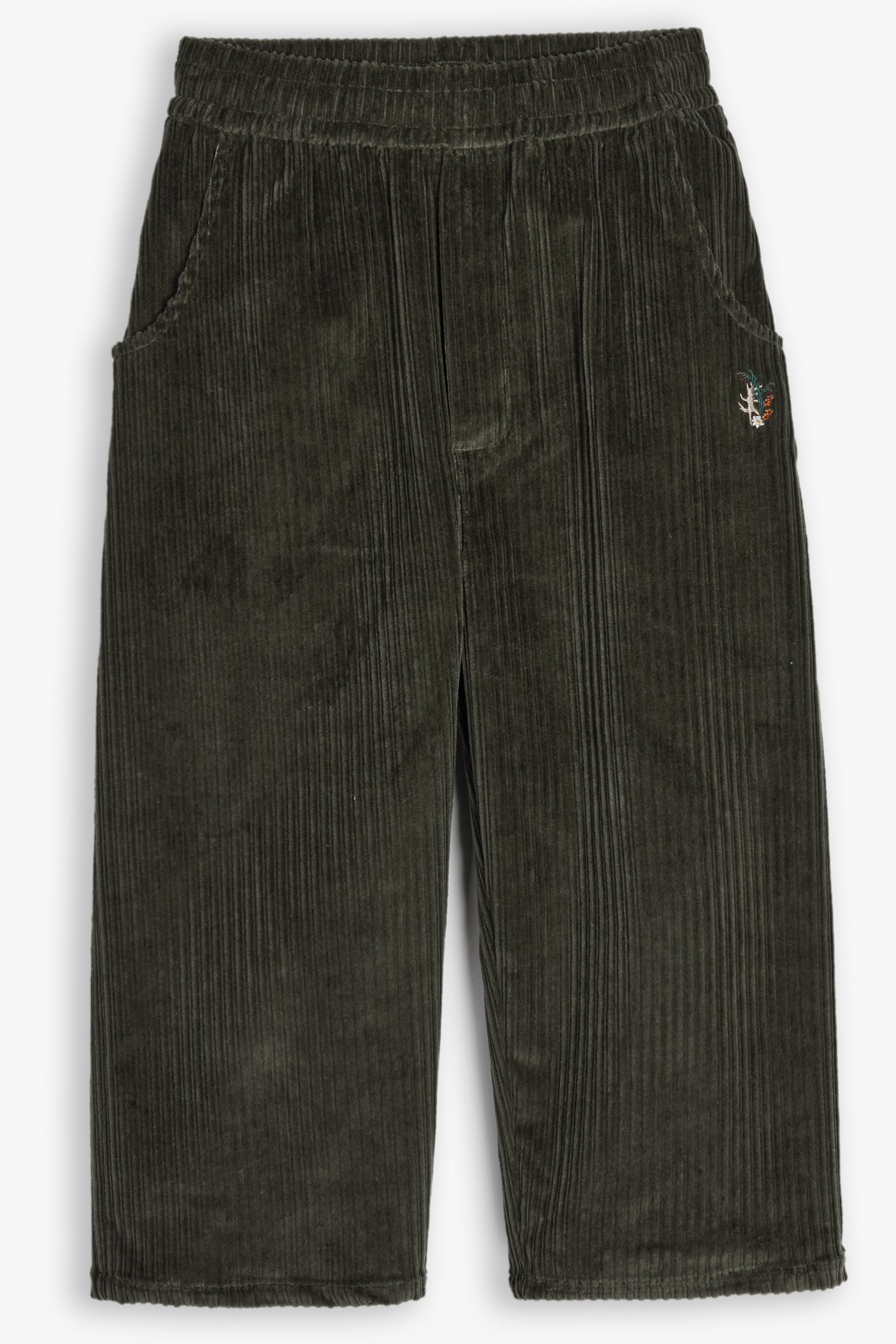 Straight wide corduroy trousers, curved side pockets, elastic waist, small embroidery