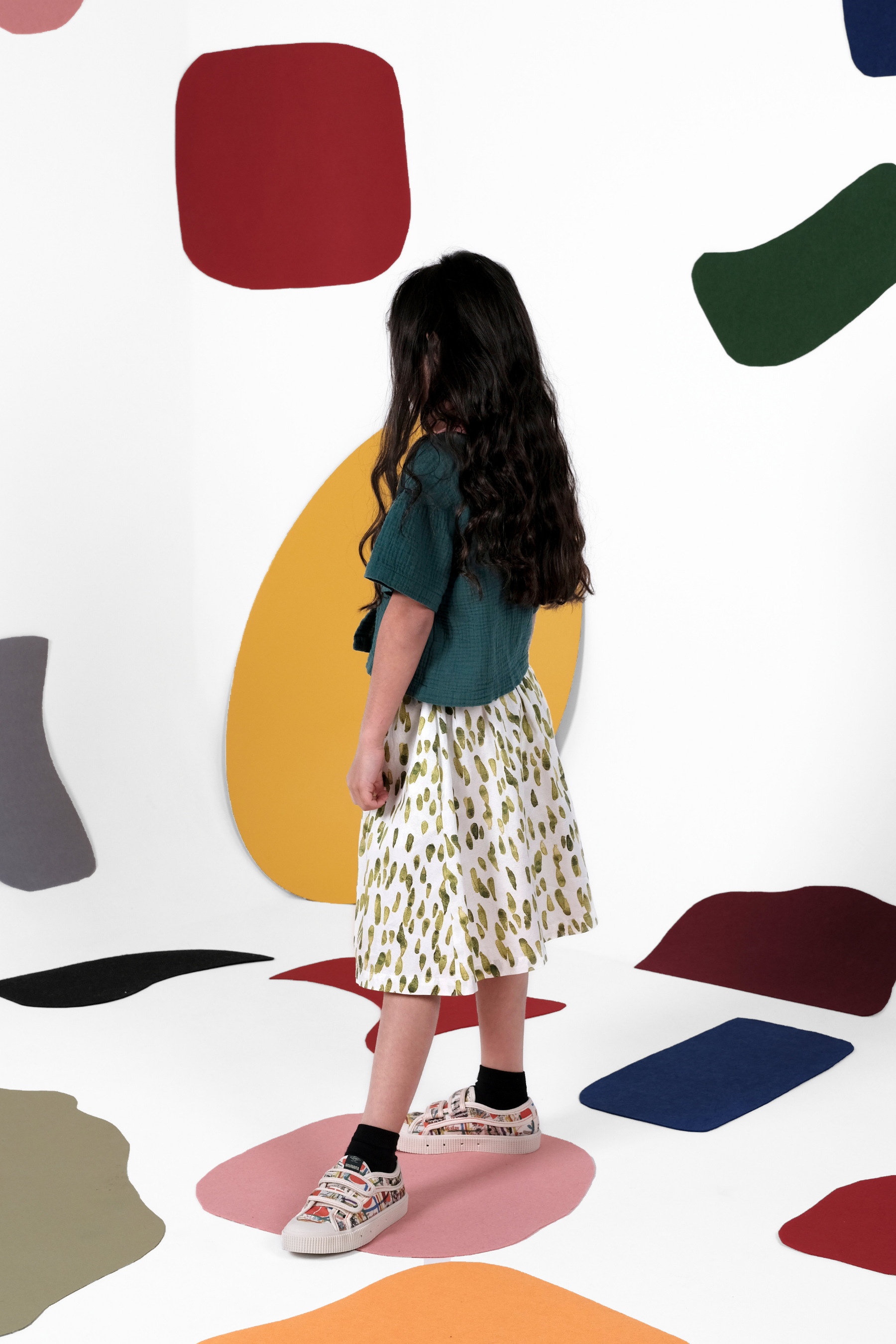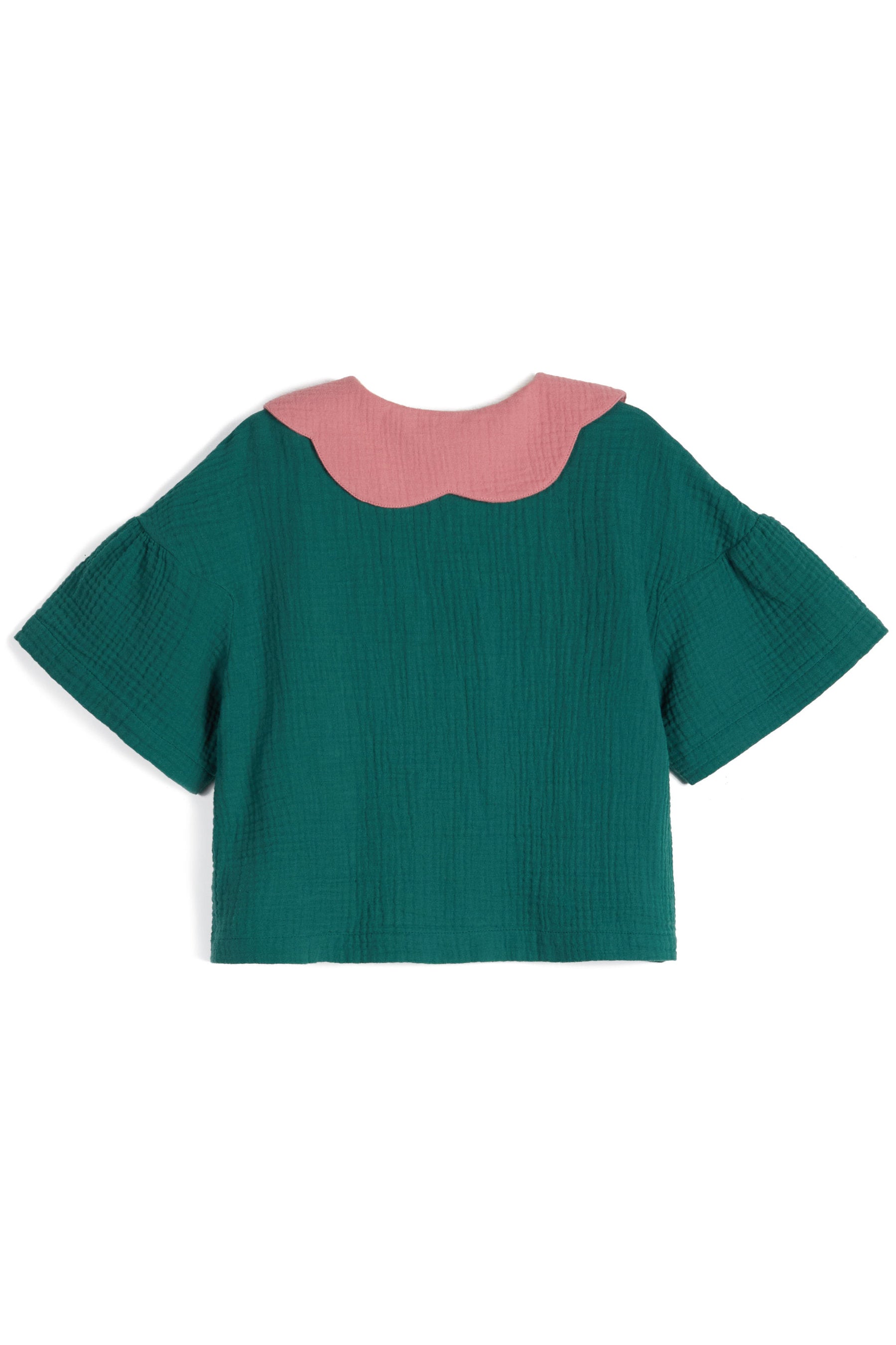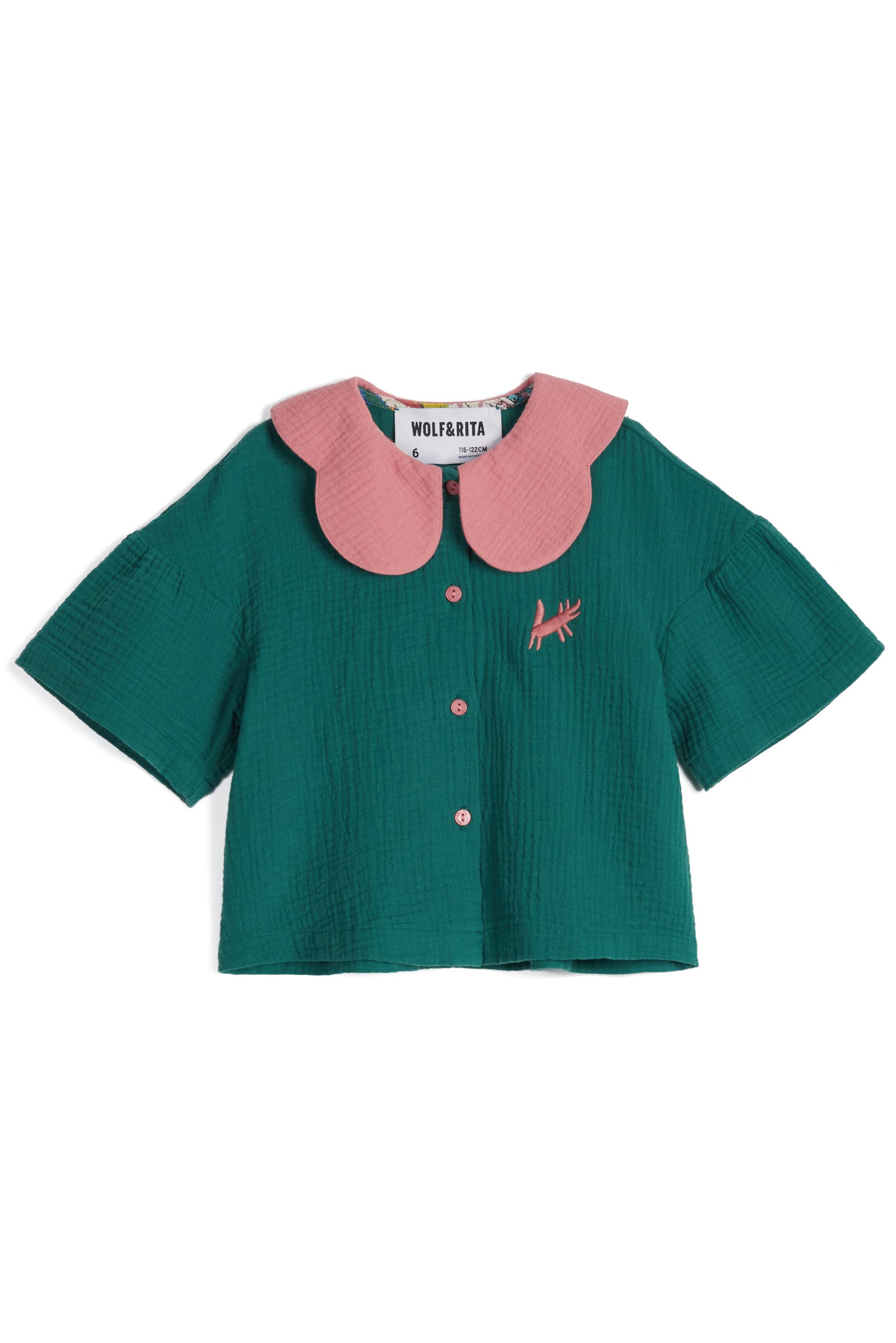 Short sleeved cropped blouse with front buttons, contrasted scalloped collar and small mascot embroidery