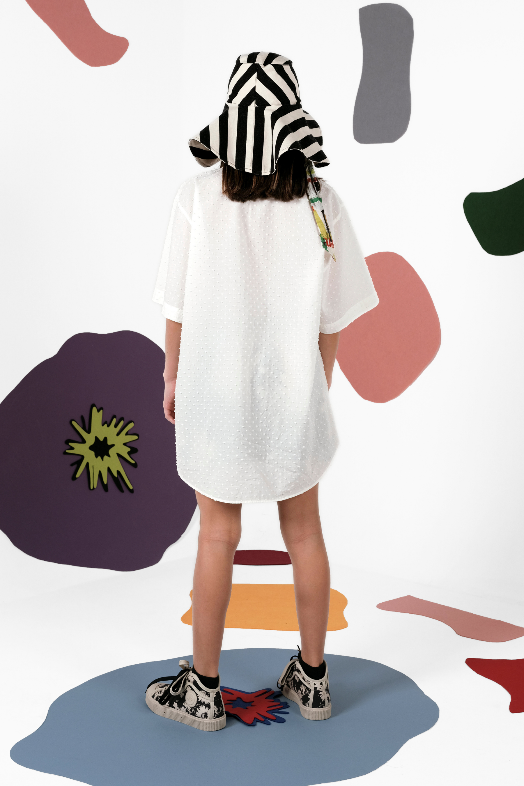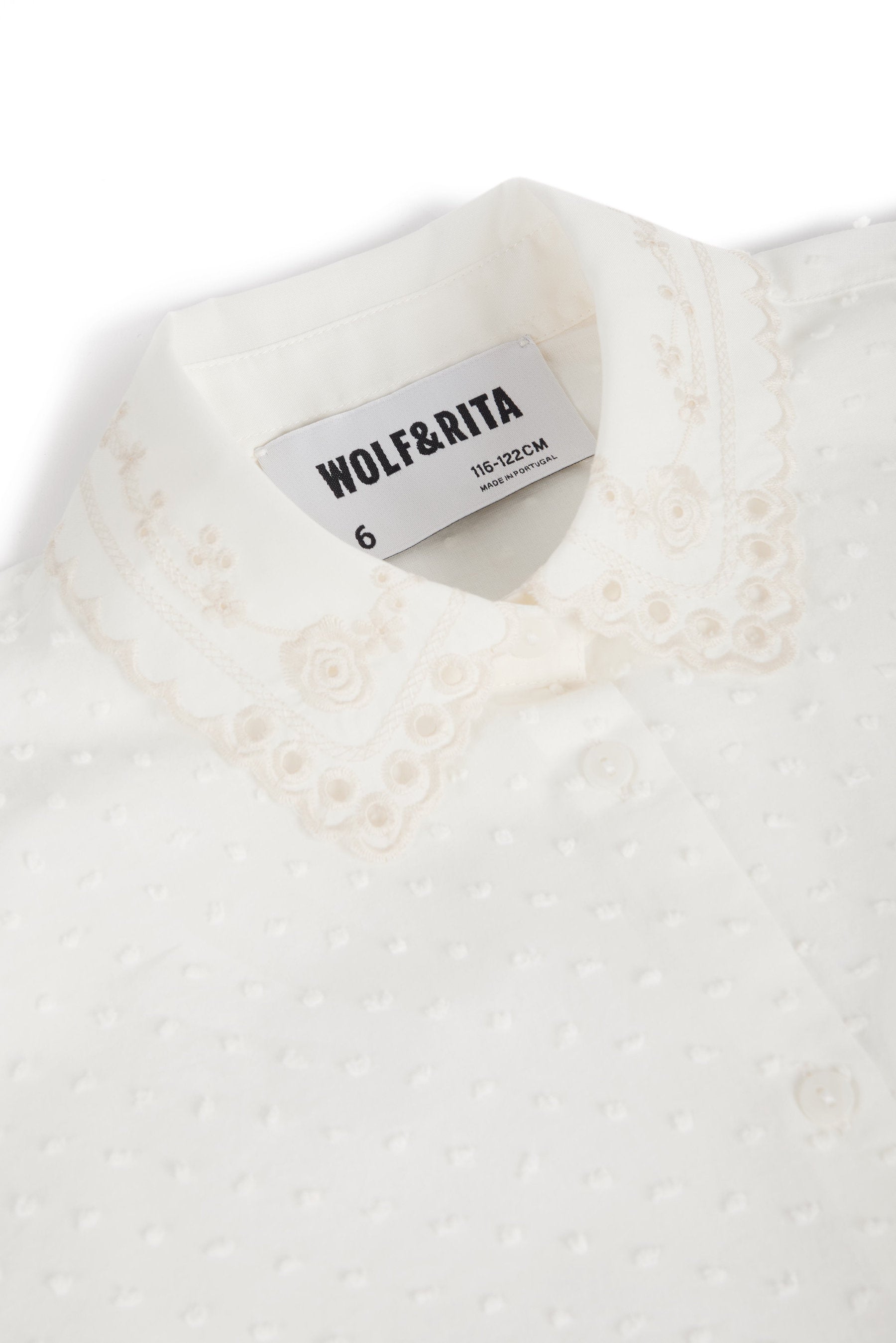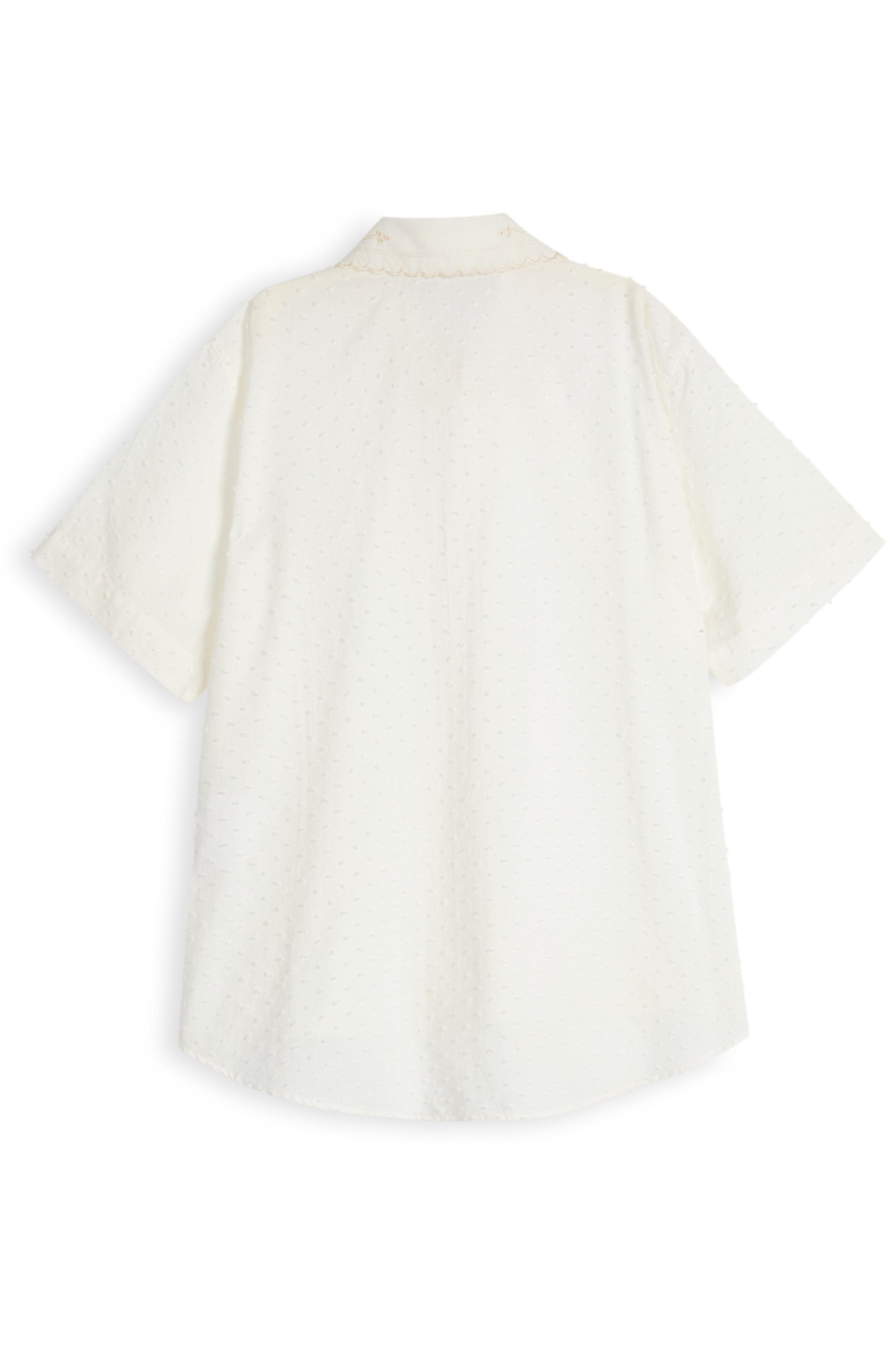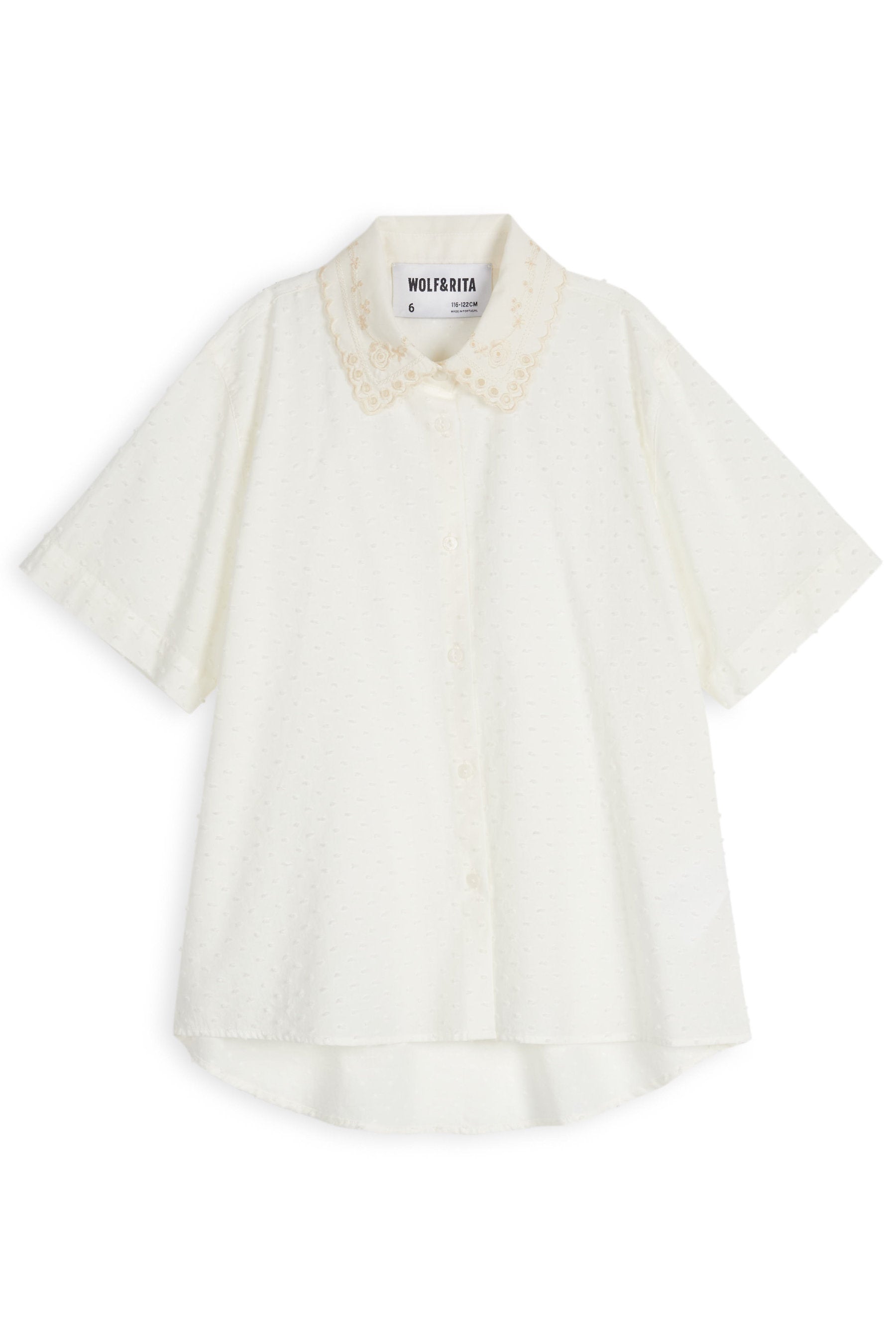 Short sleeved button-up blouse with contrasted embroidered collar and longer back