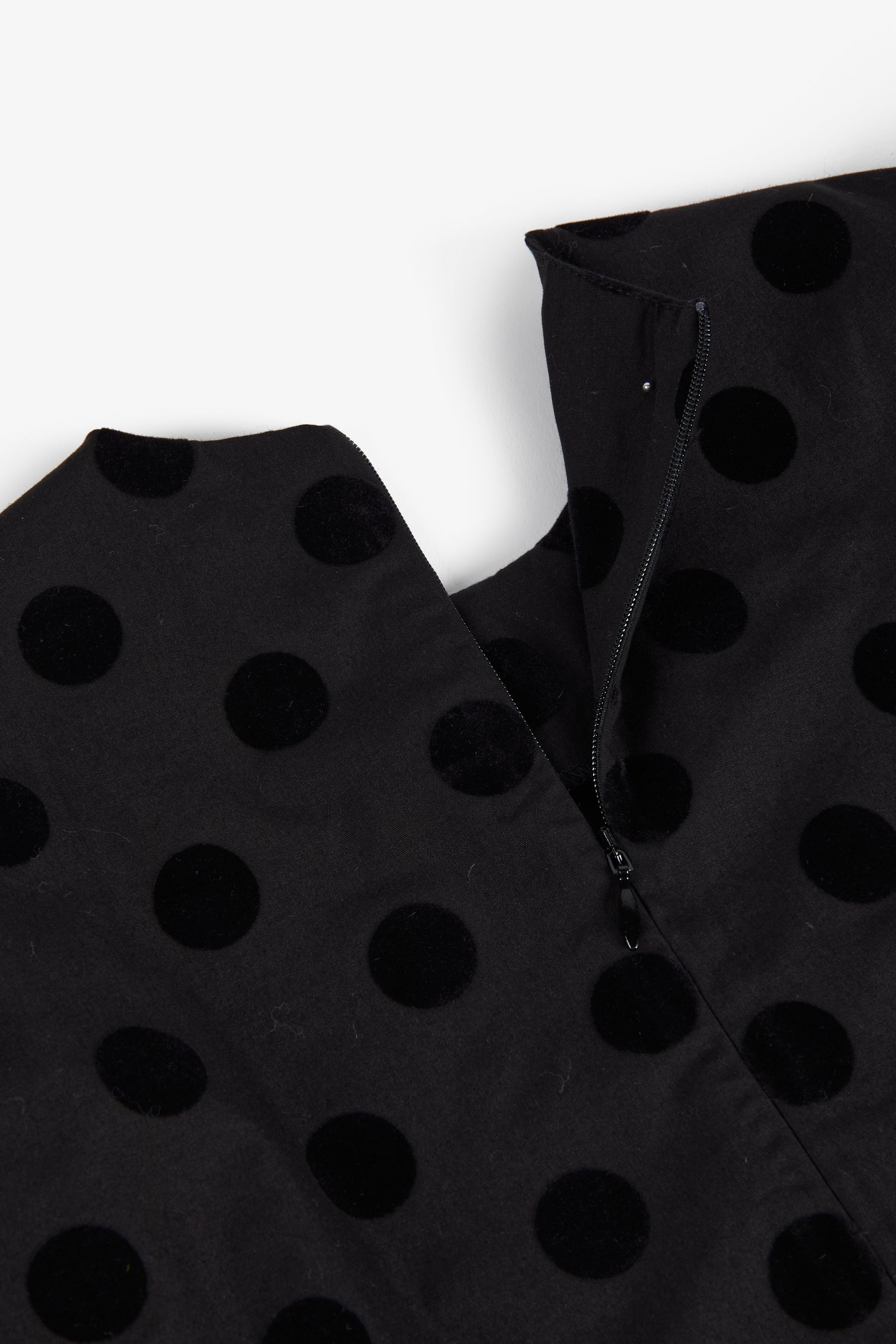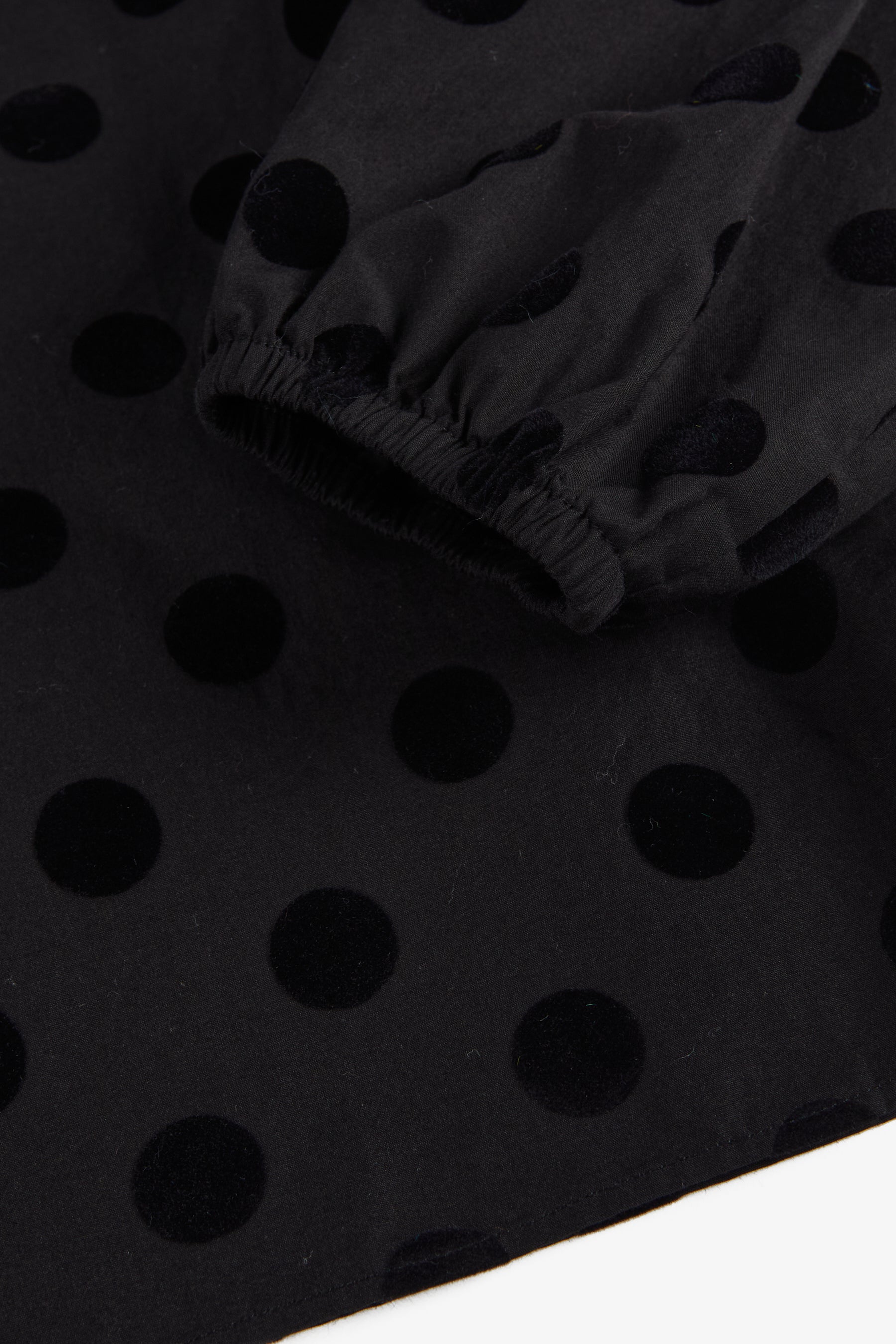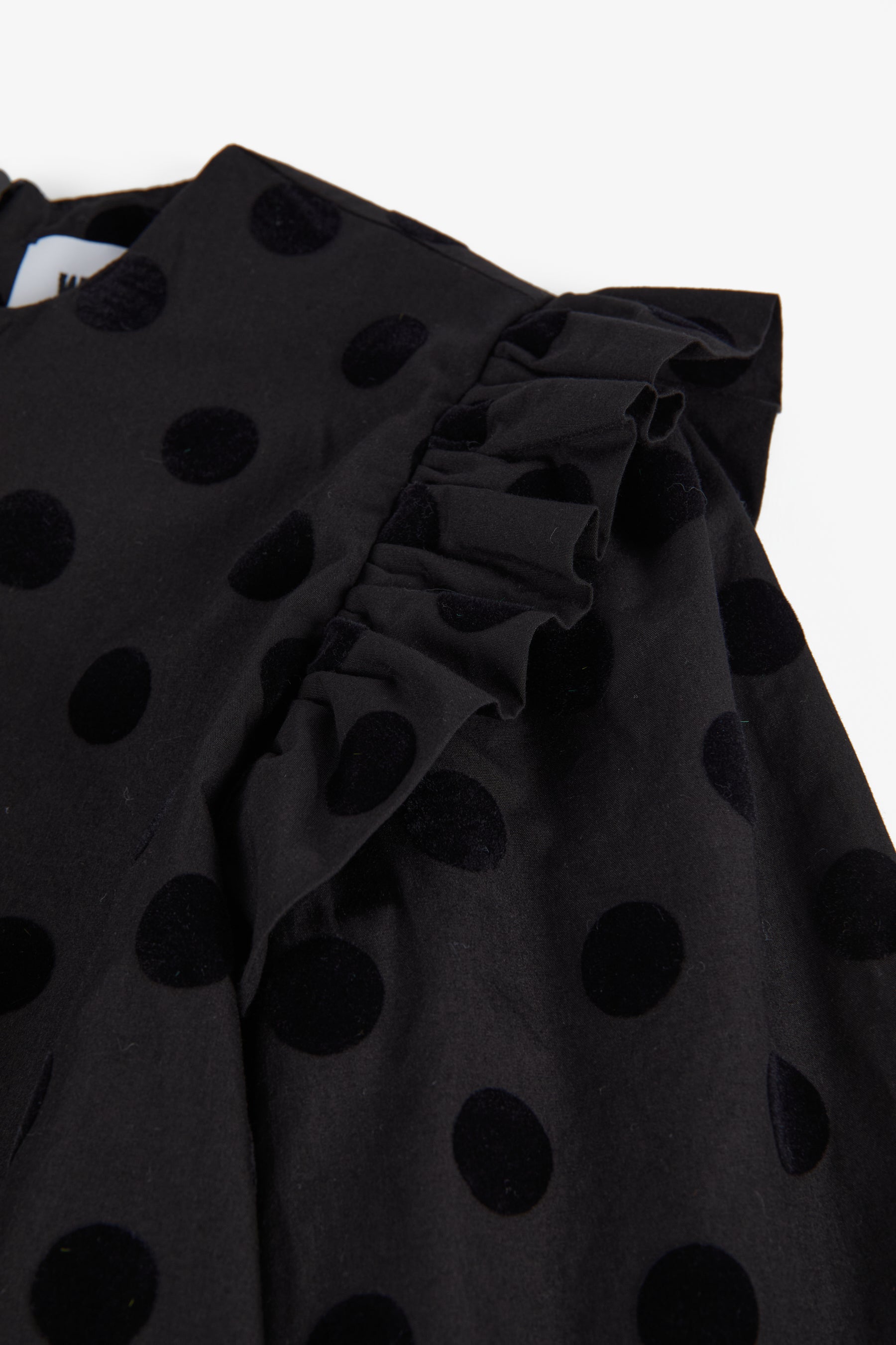 Long sleeved blouse, zip closure (back), frill on shoulders, and elastic cuffs