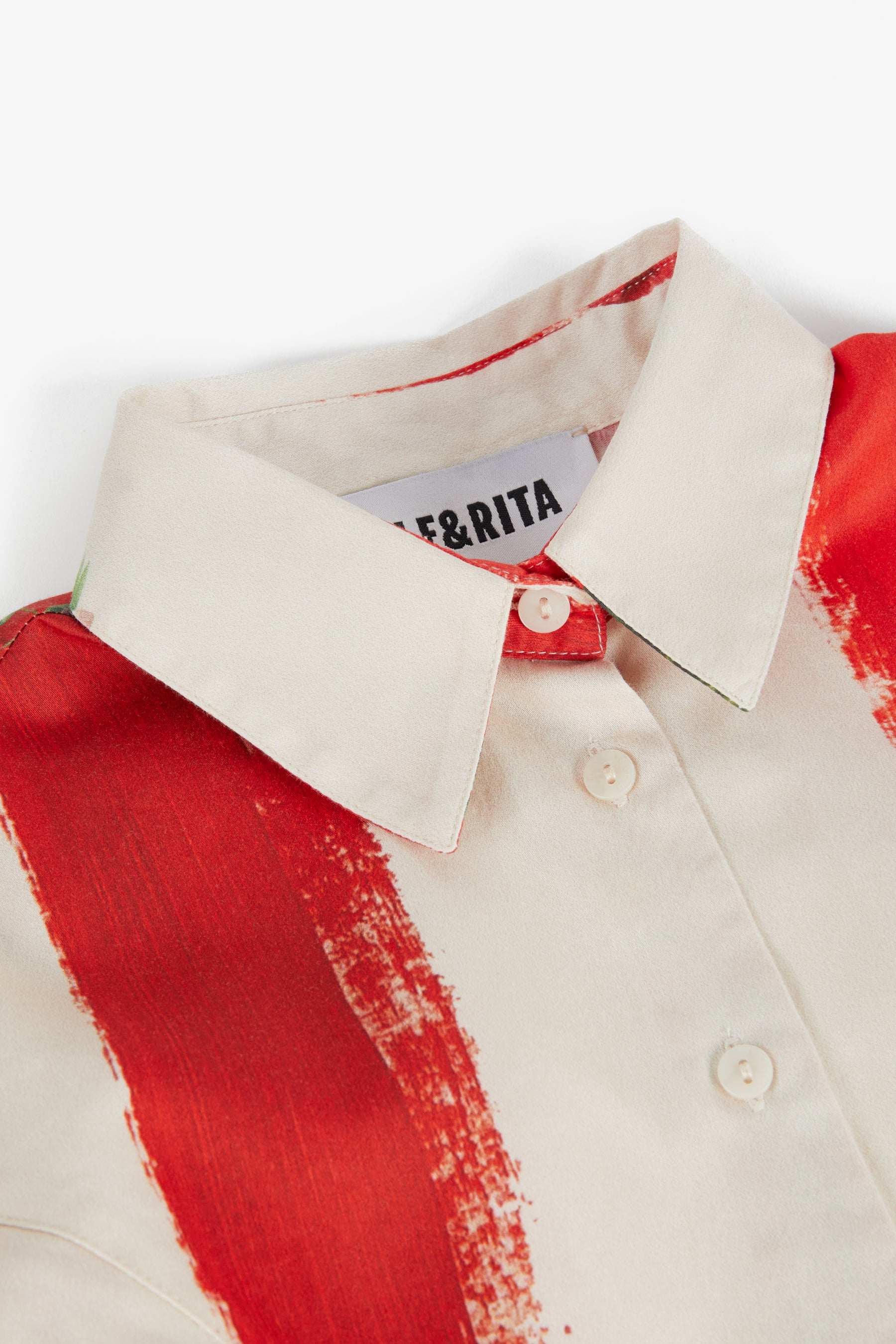 Long sleeved blouse, front buttons, shirt collar, square cuff with buttons, and frill detail