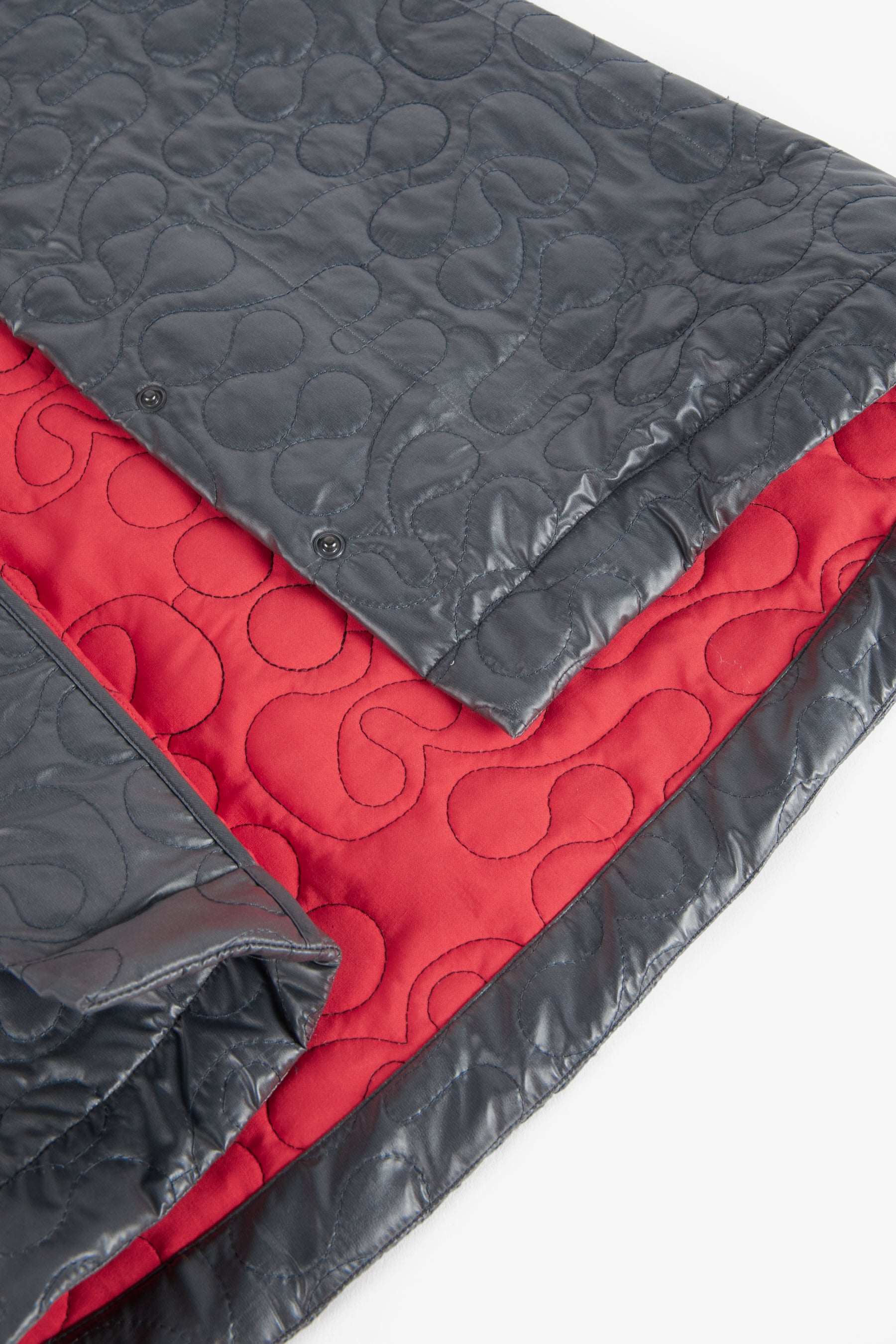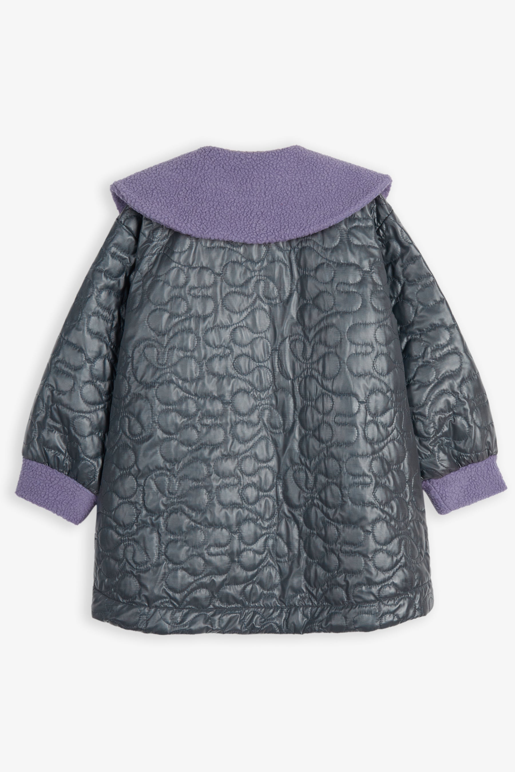Ballooned coat with long sleeves, front buttons, sherpa fleece contrasted cuffs and round oversized collar, padded, with custom WR pattern and contrasted lining