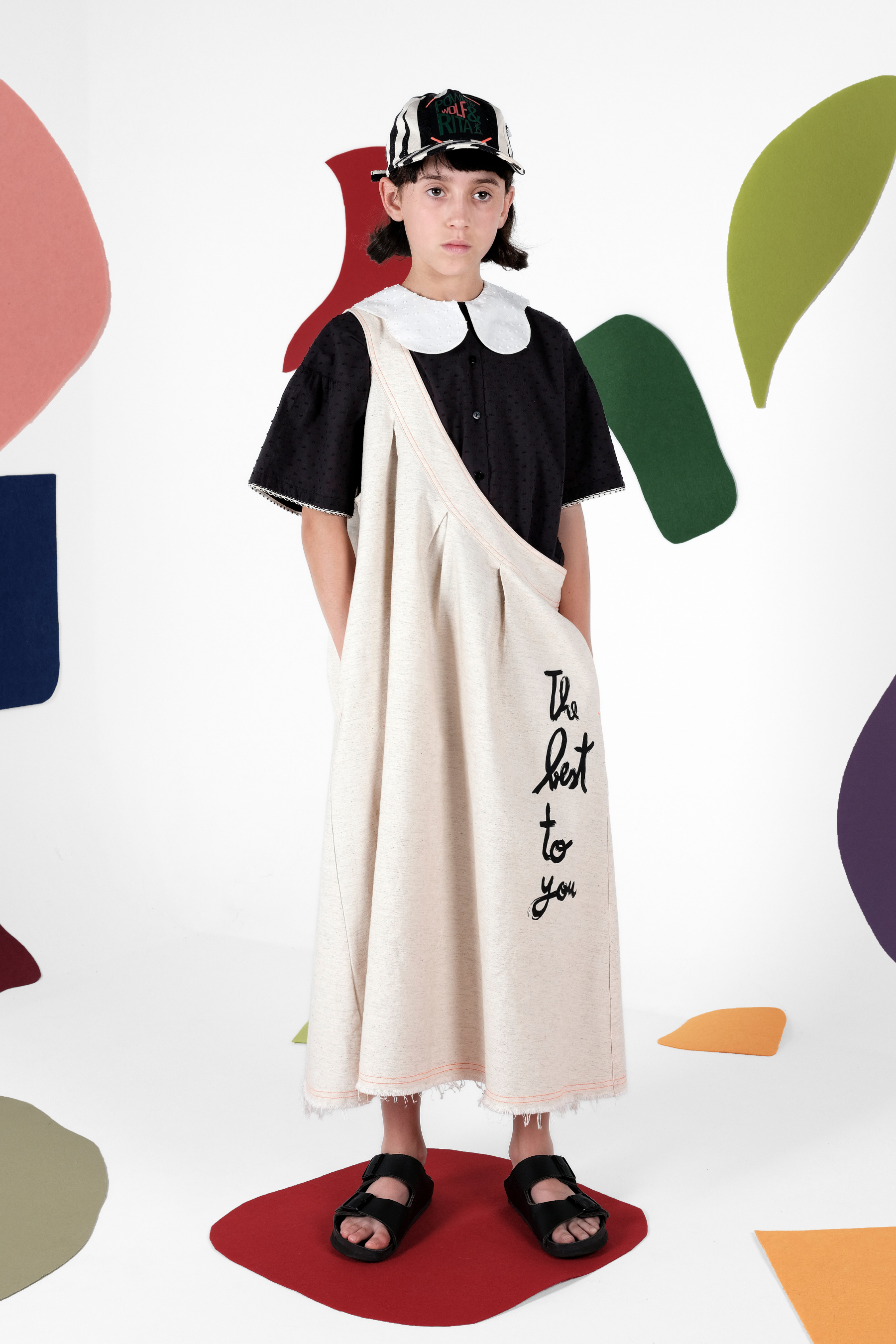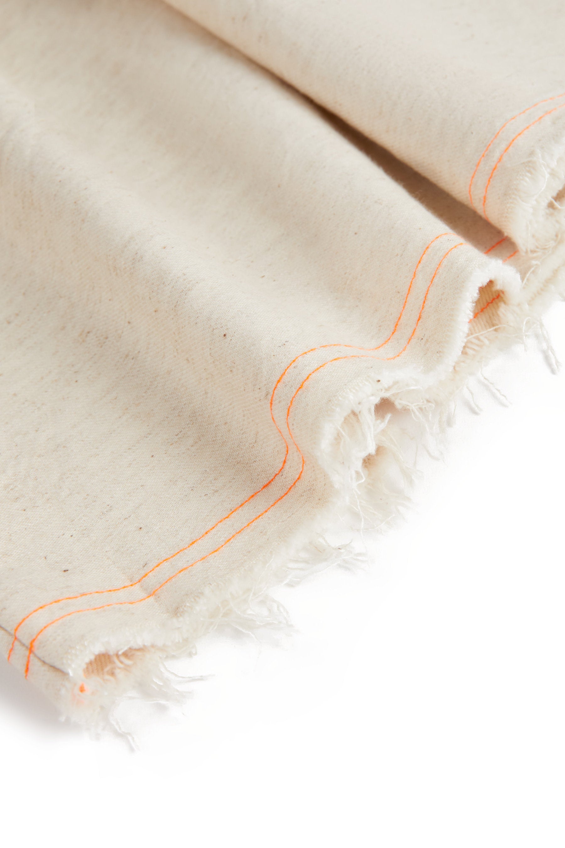 A-line skirt, asymmetric (over one shoulder), with print, contrasted stitches, raw hem and inner side pockets
