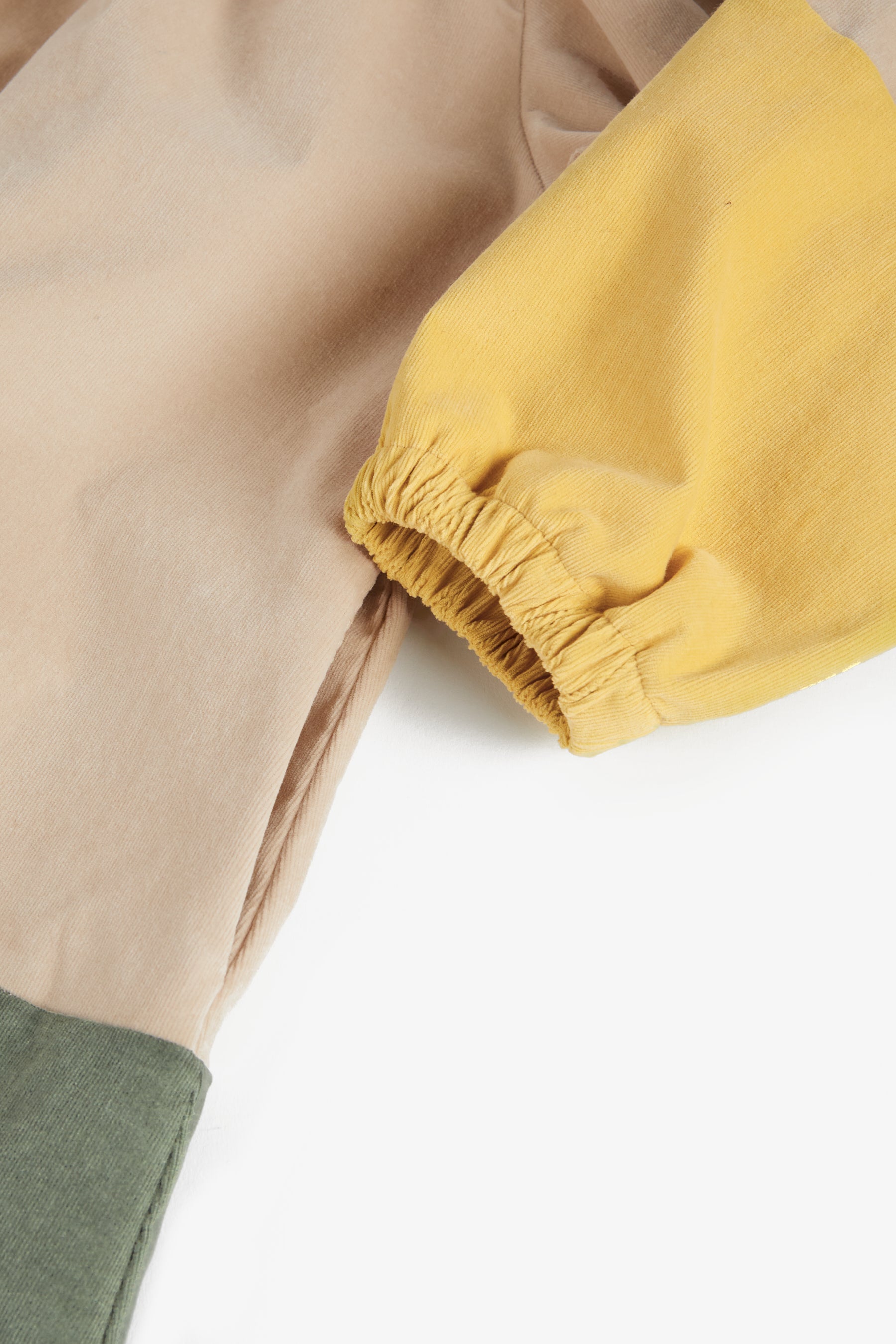 Long sleeved trapeze dress, oversized, gathered detail on shoulders, front buttons, seam pockets, contrasted round collar, elastic cuffs, and contrasted details