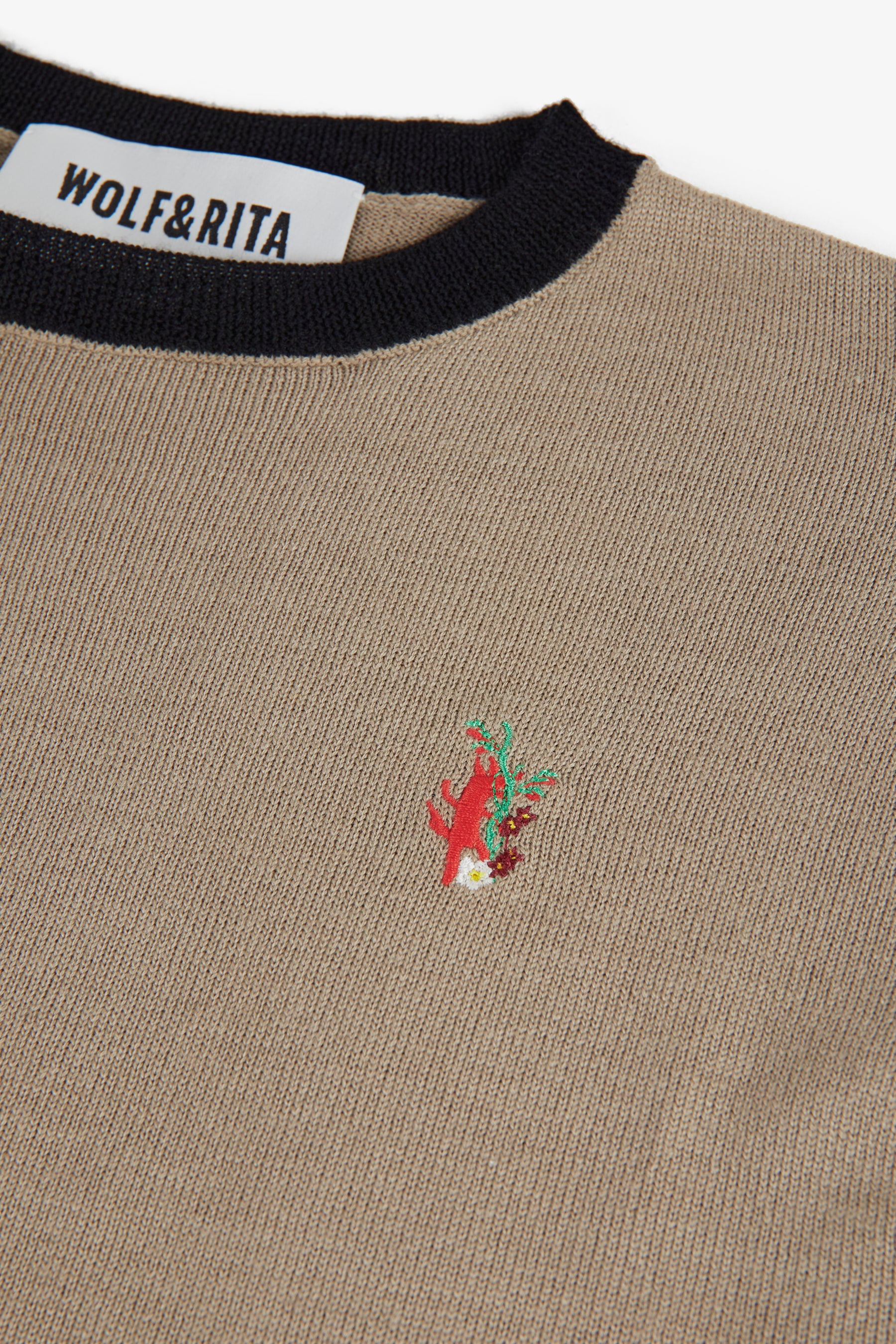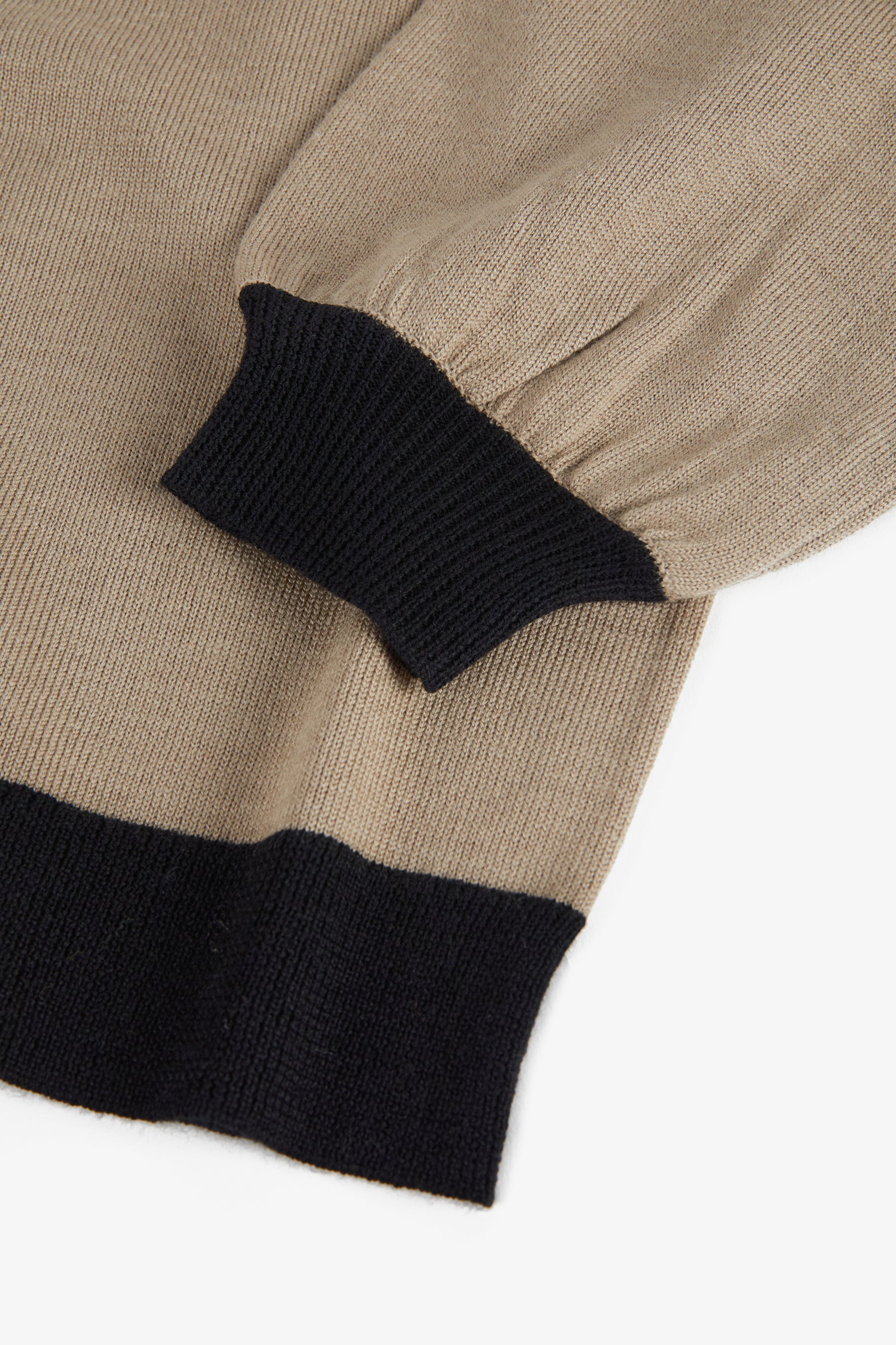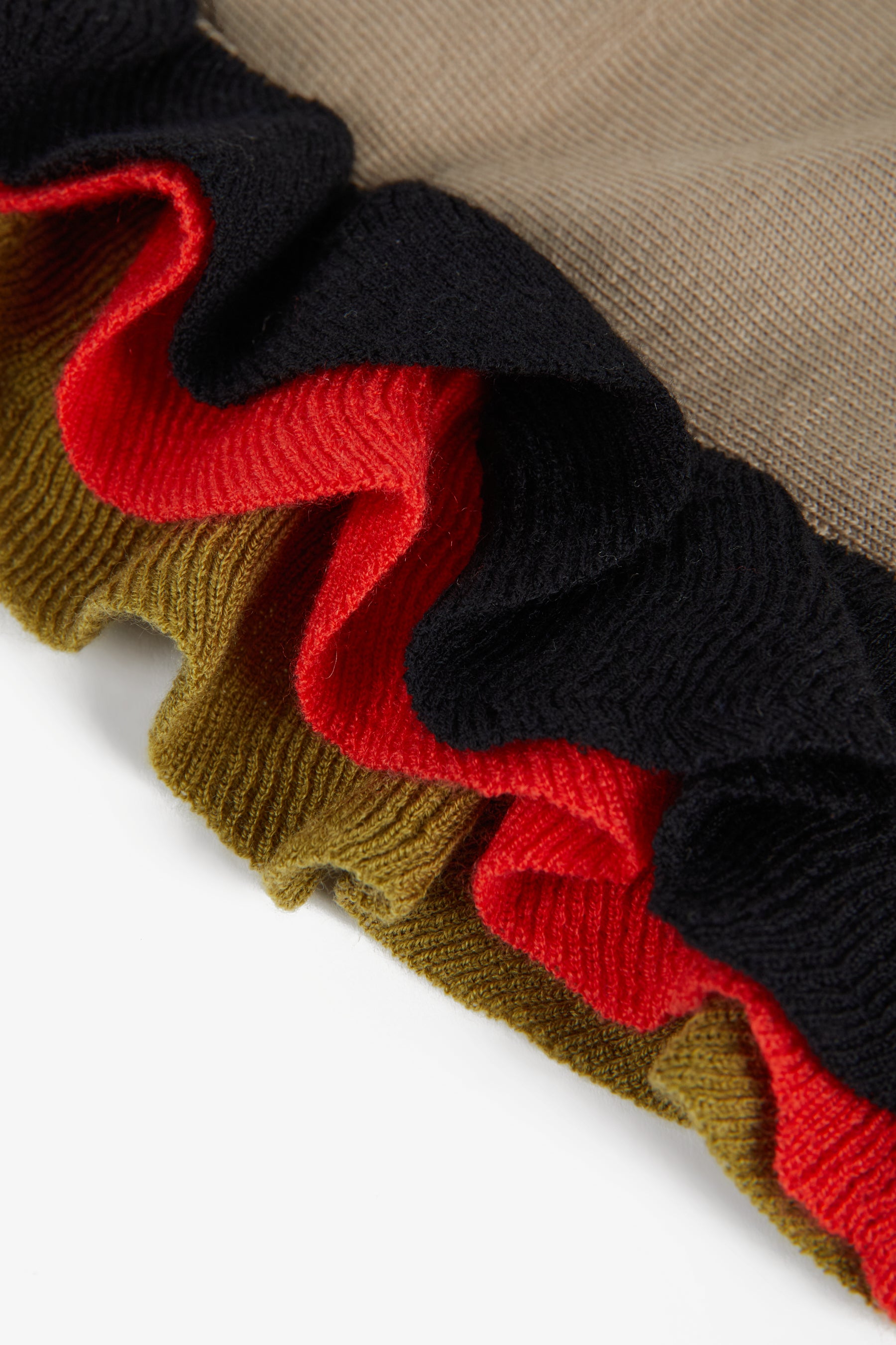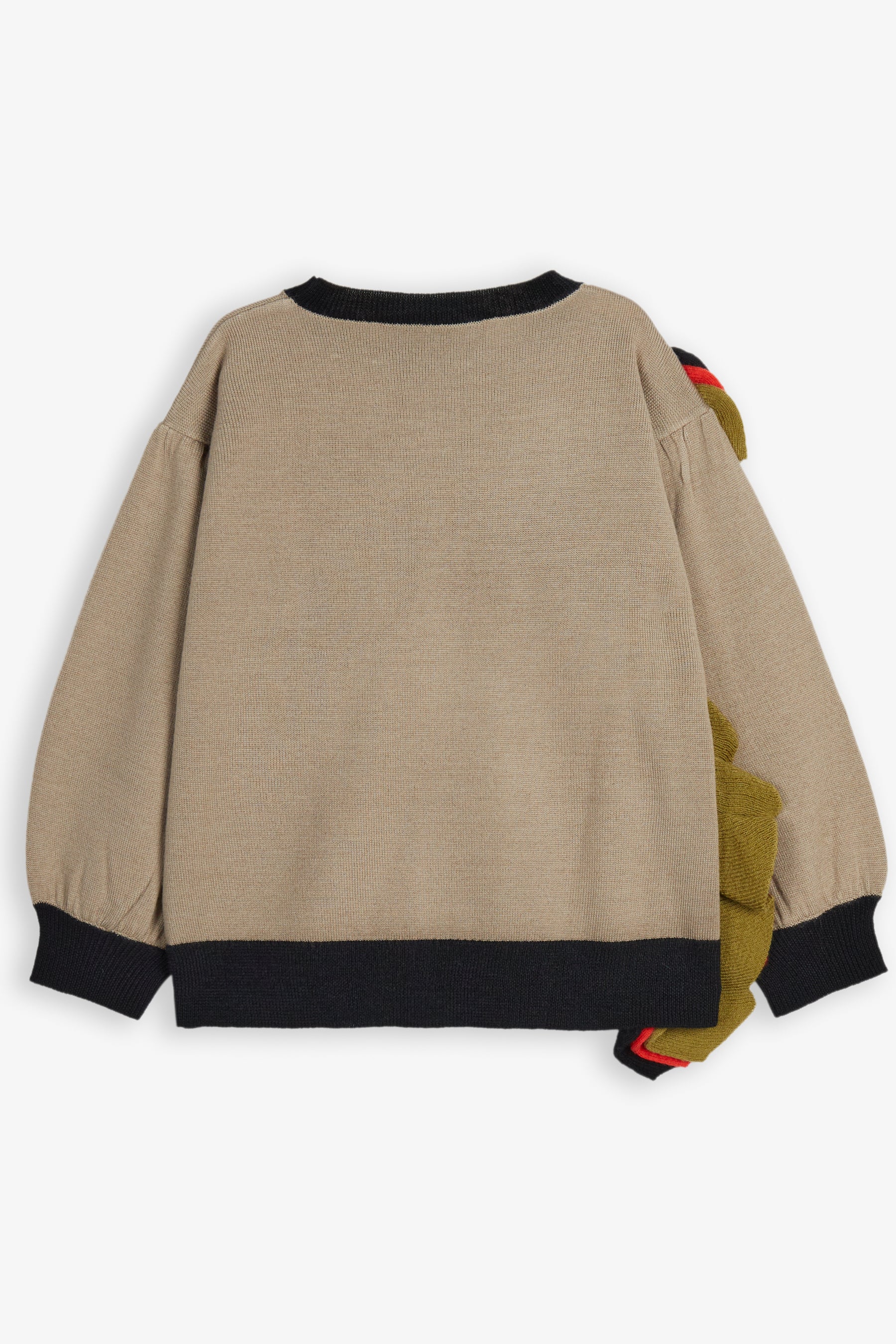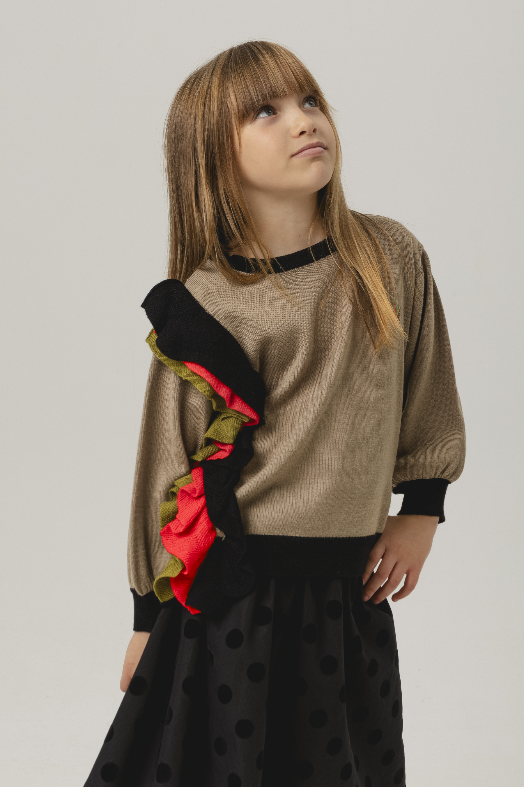 Long sleeved knitted jumper, ballooned sleeves, layered contrasted frill from shoulder, contrasted cuffs and collar, small embroidery