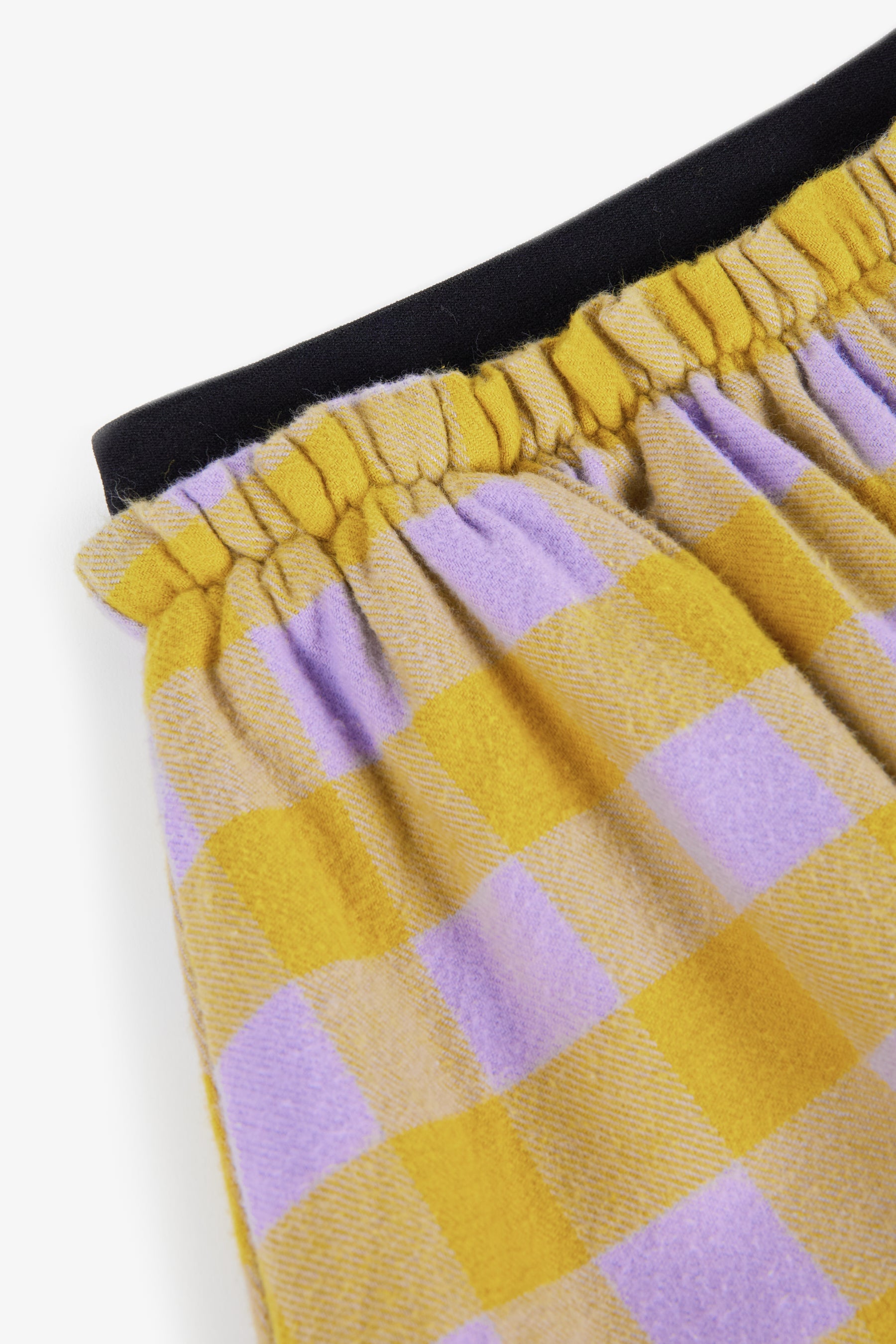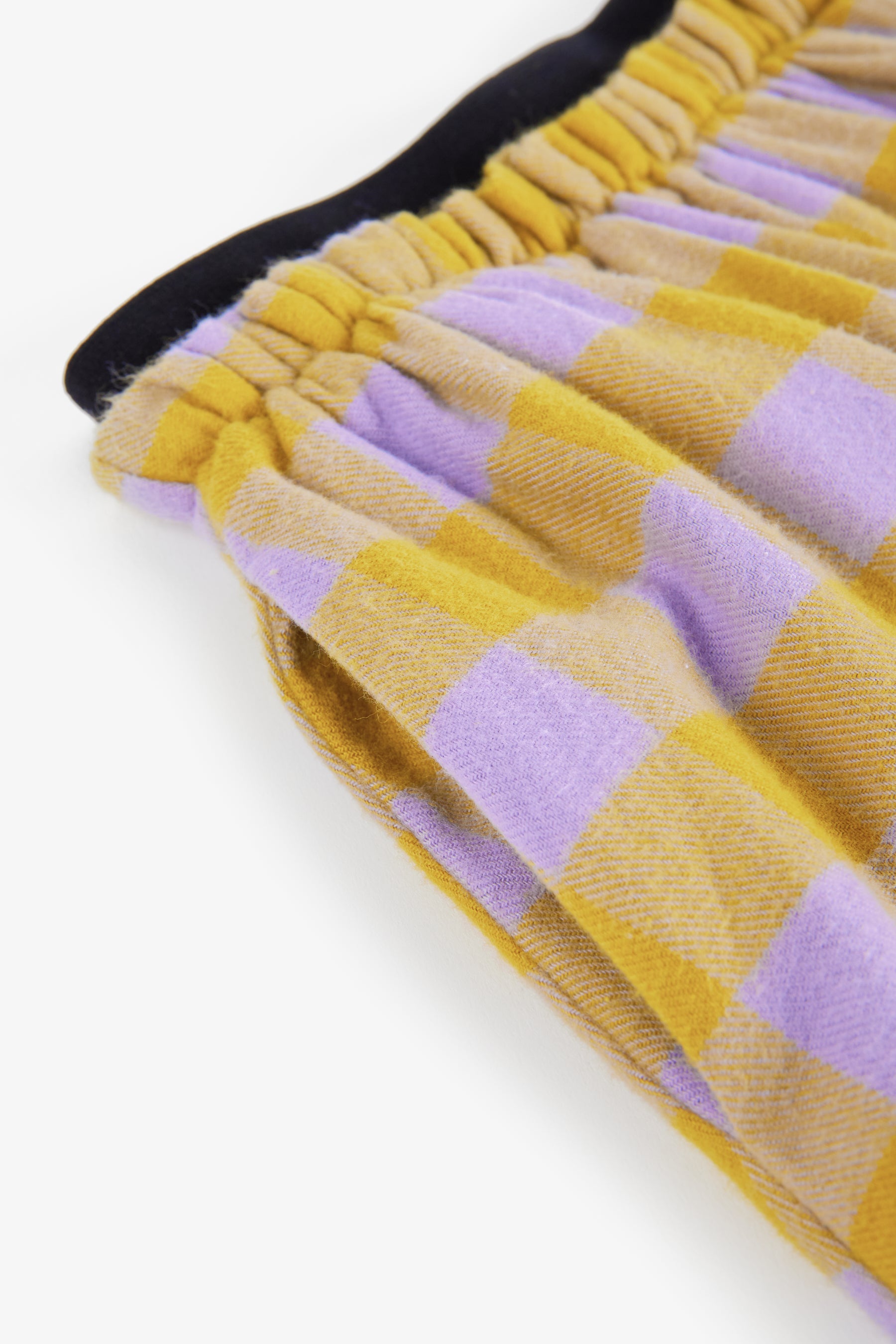 Below the knee flared skirt, gathered detail and contrast elastic waist, seam pockets
