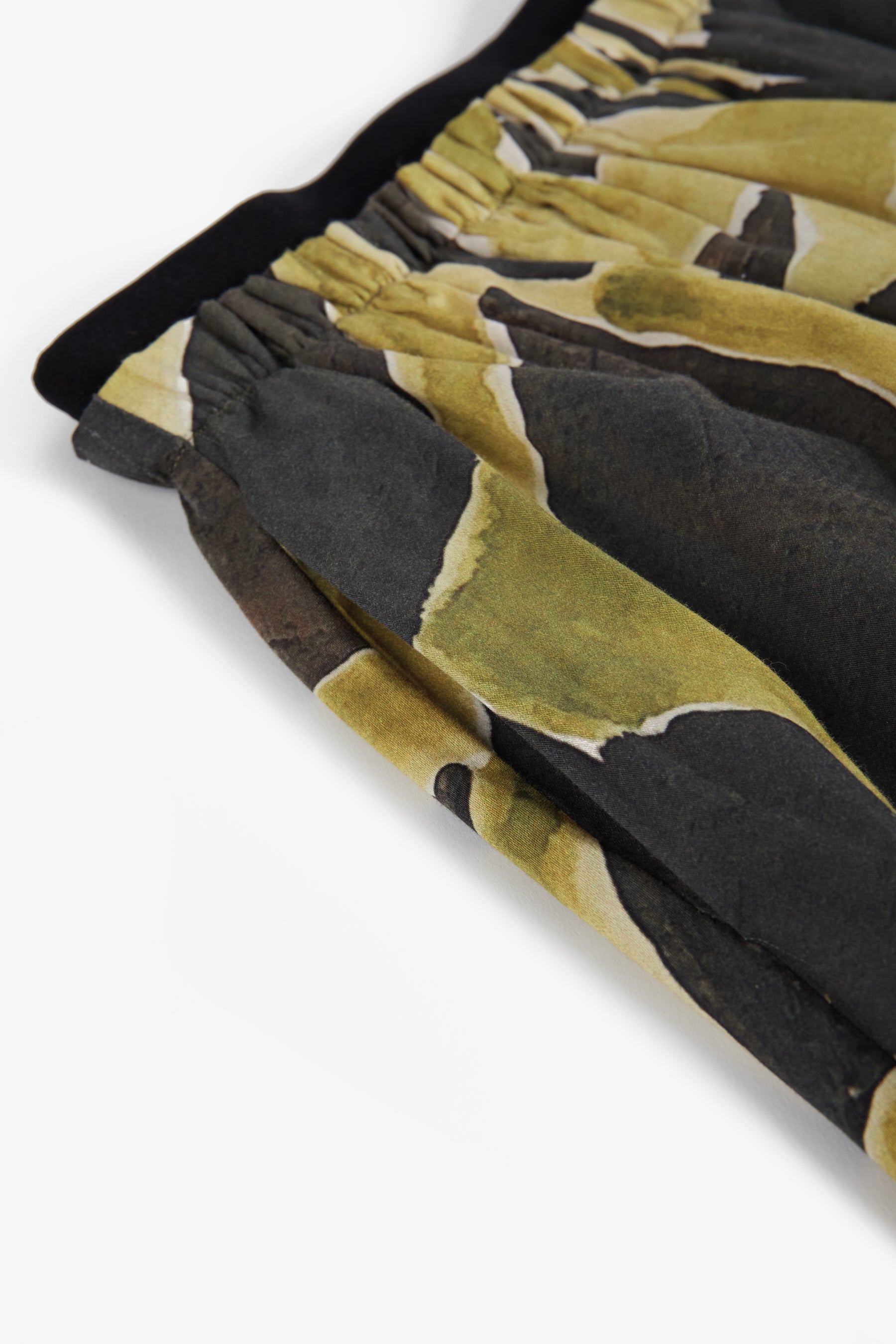 Below the knee flared skirt, gathered detail and contrast elastic waist, seam pockets