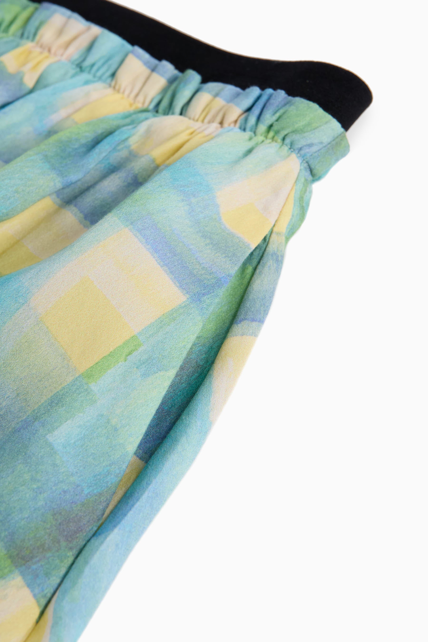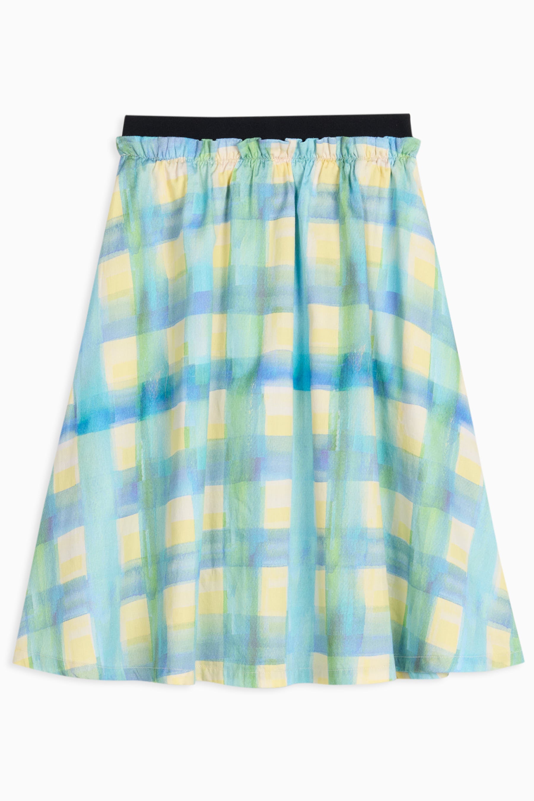 Below the knee flared skirt, gathered detail and contrast elastic waist, seam pockets