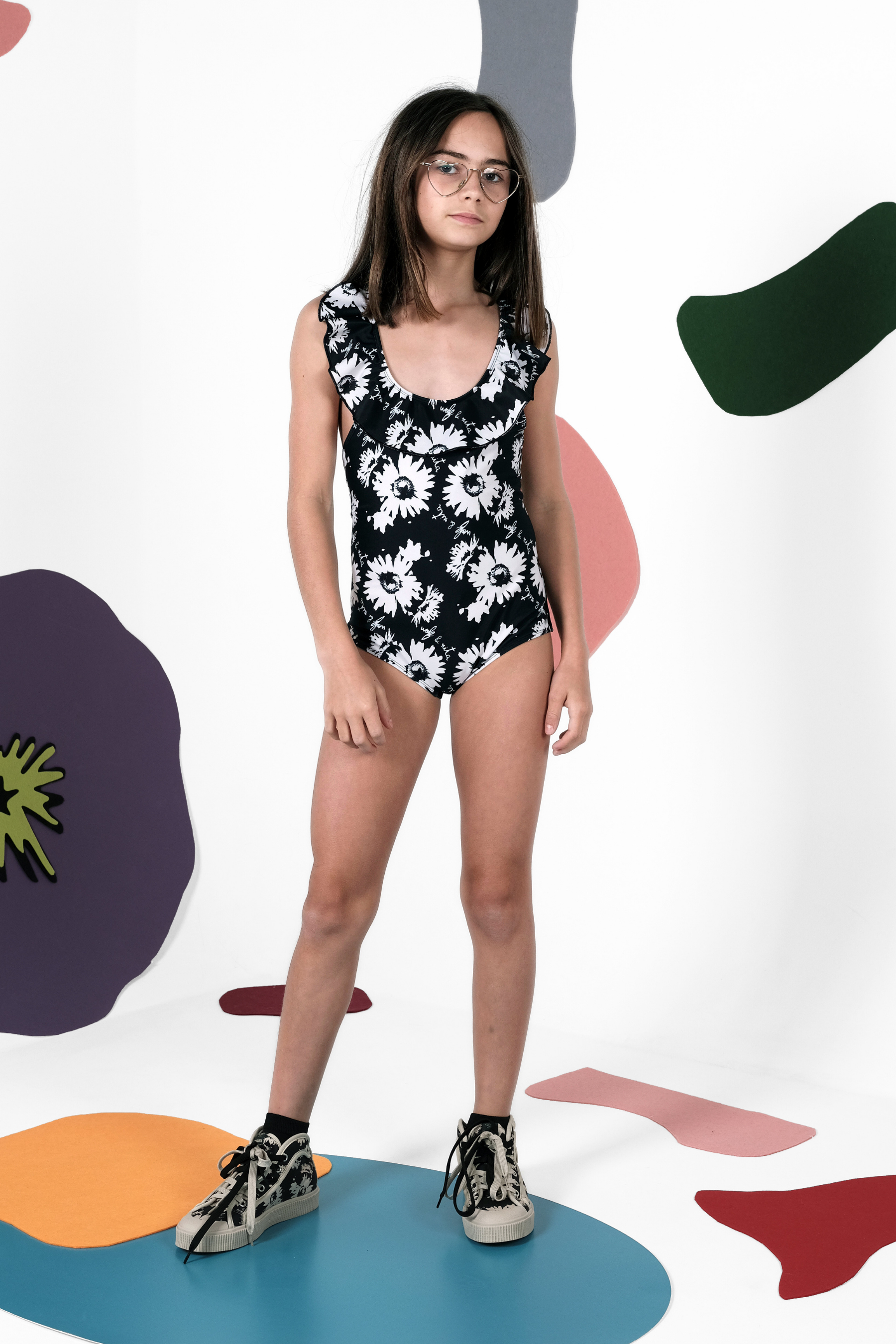 Swimsuit with crossed back straps and frill, UV protection 50+