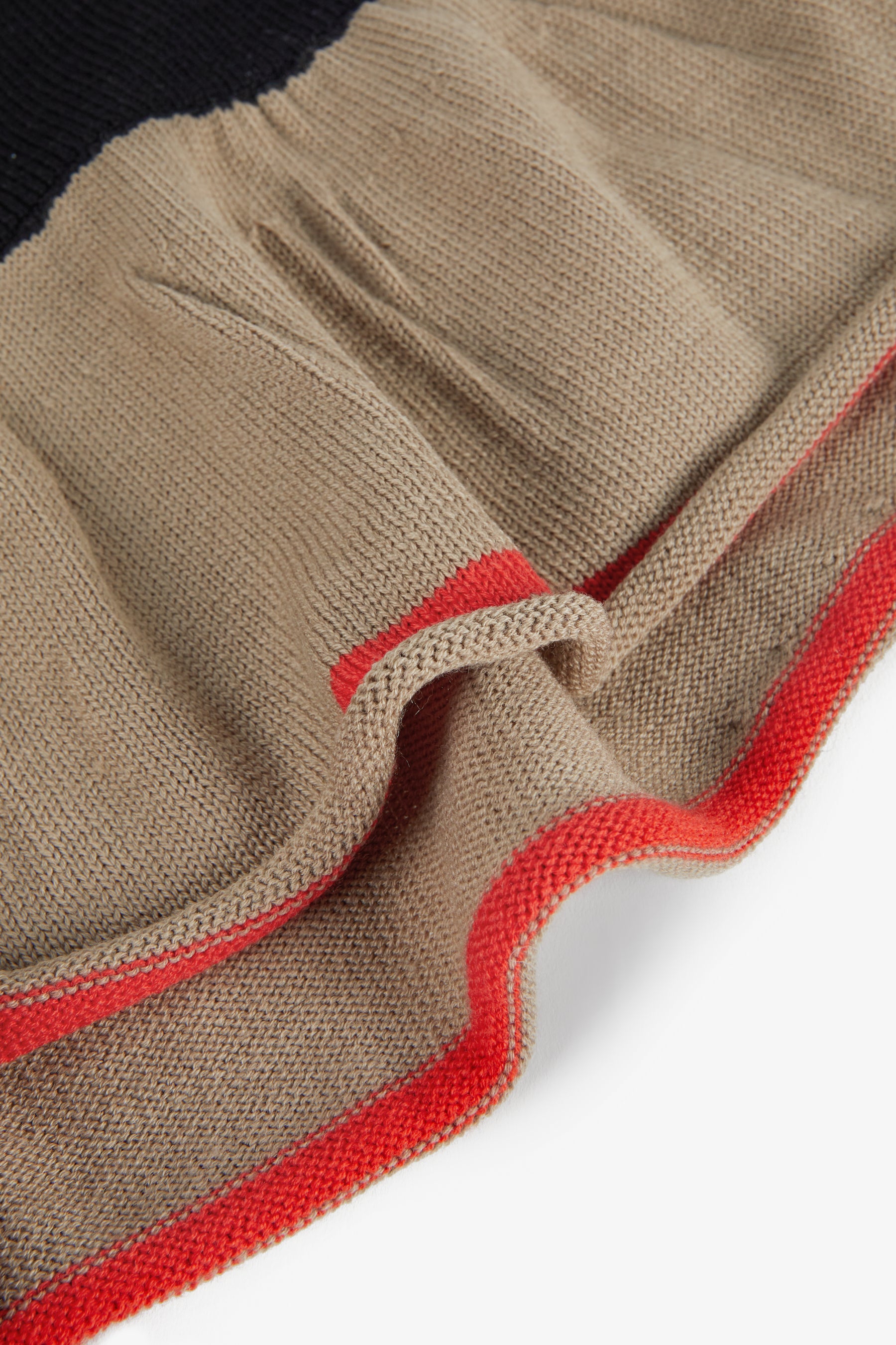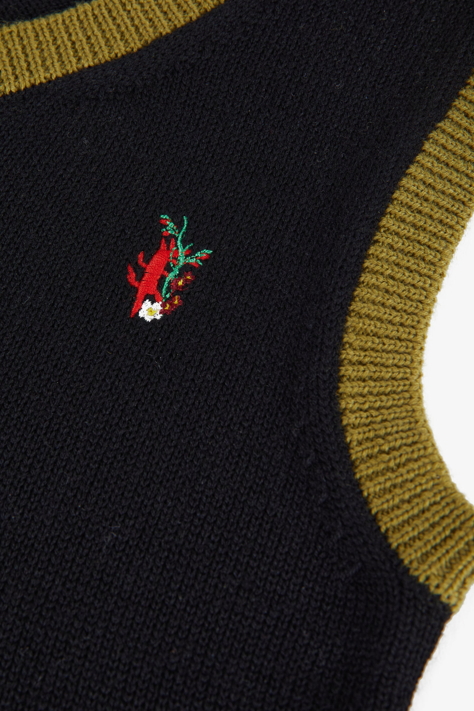 Knitted pullover vest, v-neckline, contrasted gathered bottom, contrasted collar and armscye, small embroidery