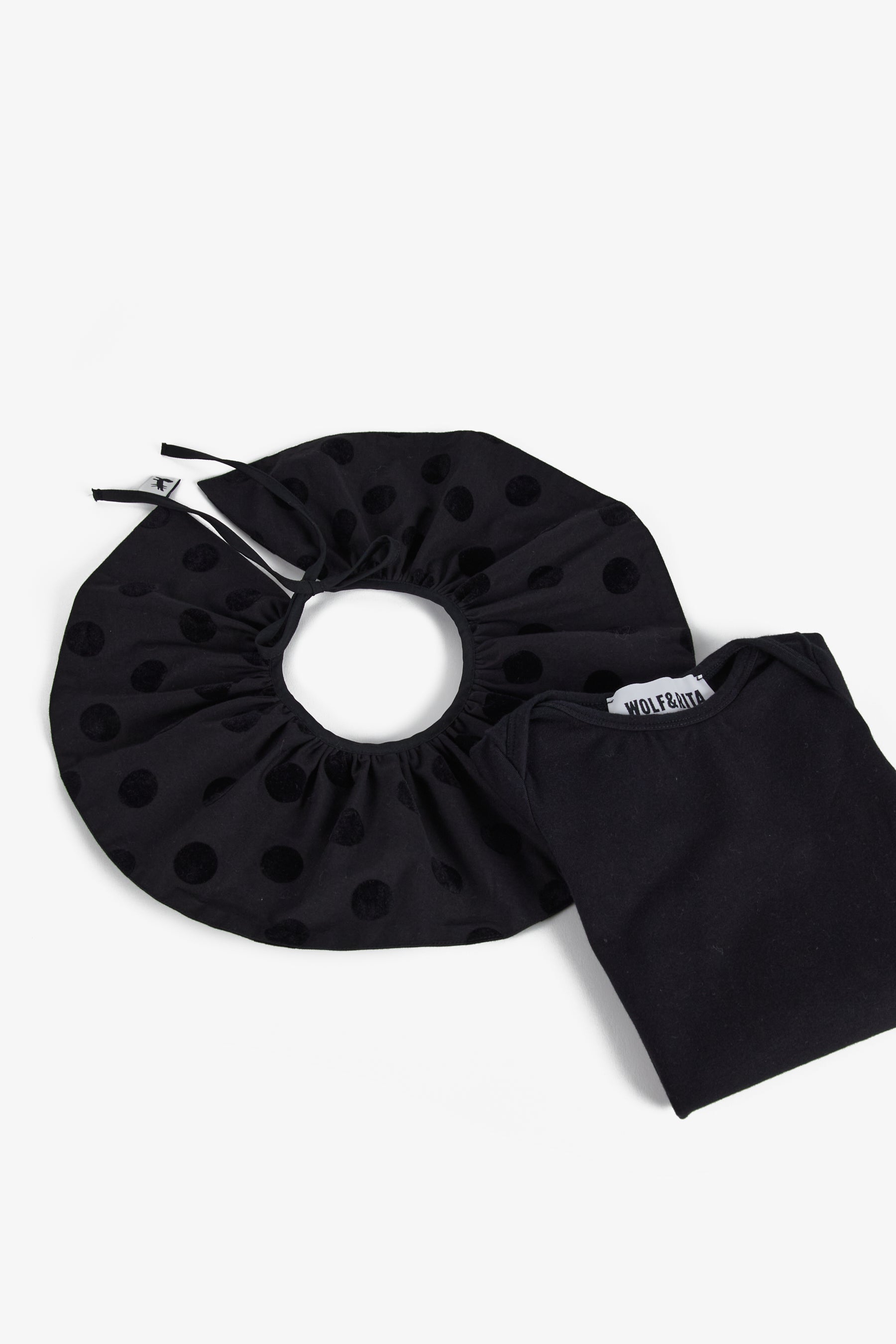 Long sleeved bodysuit with lap shoulders, snap buttons between the legs and removable collar