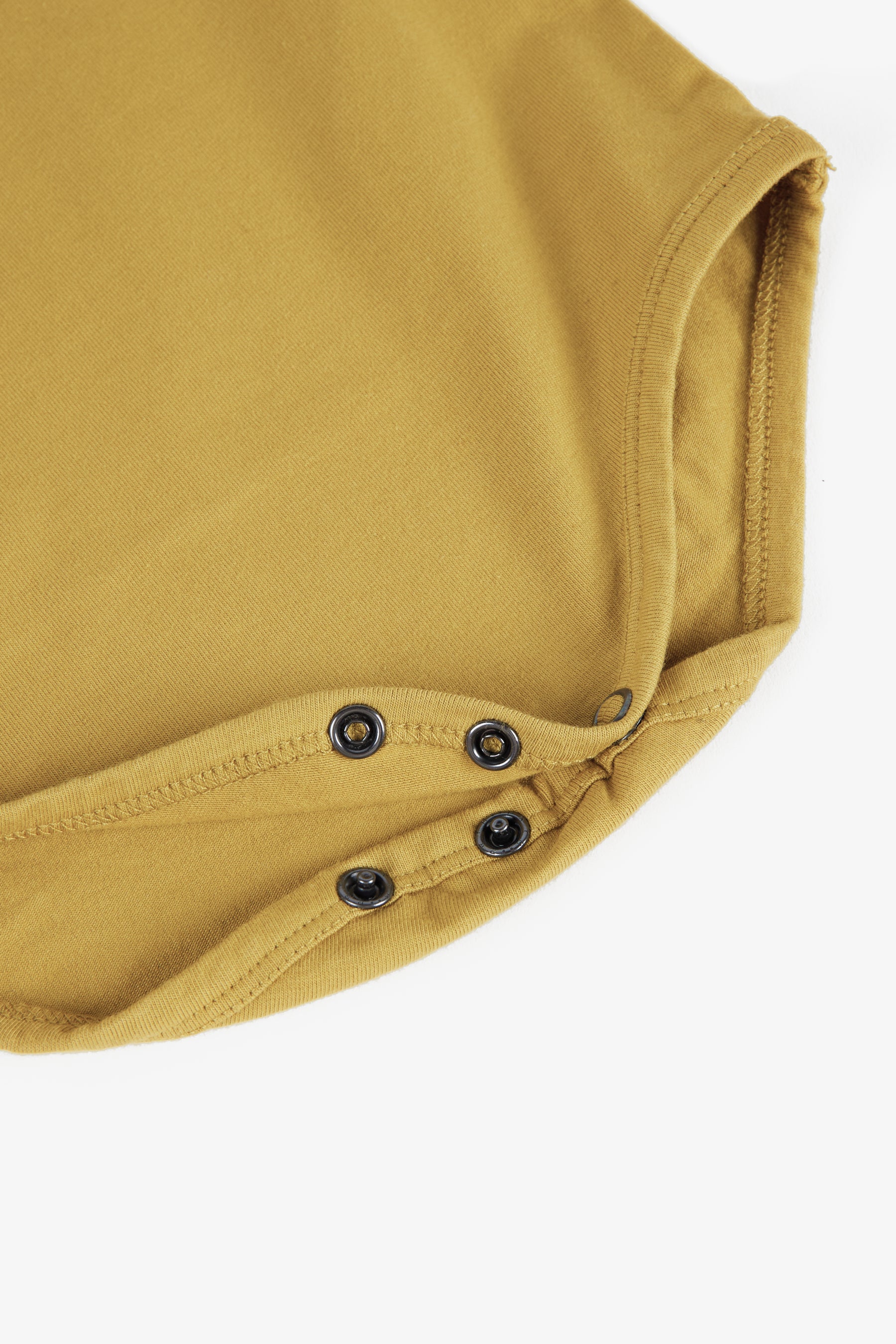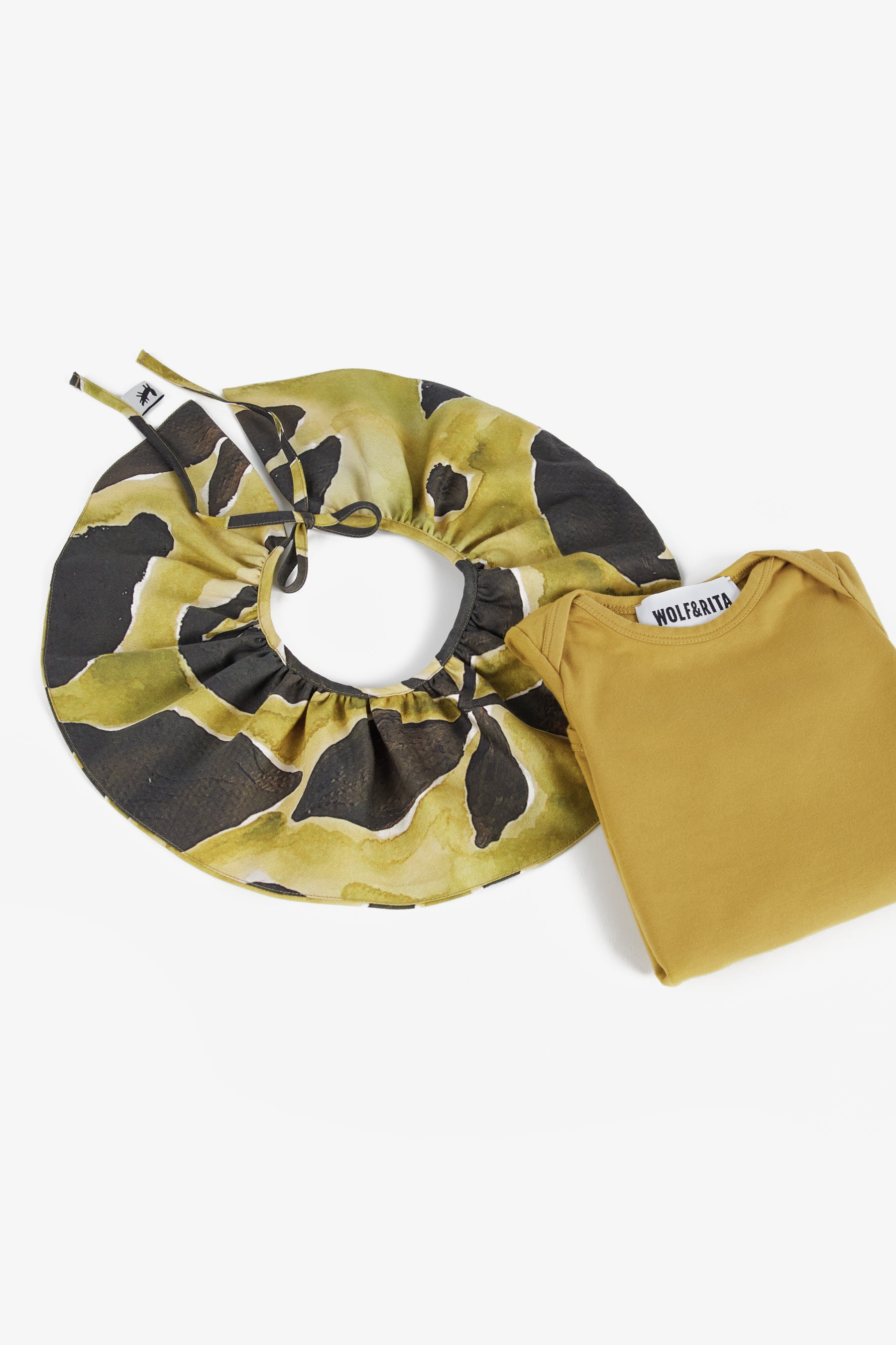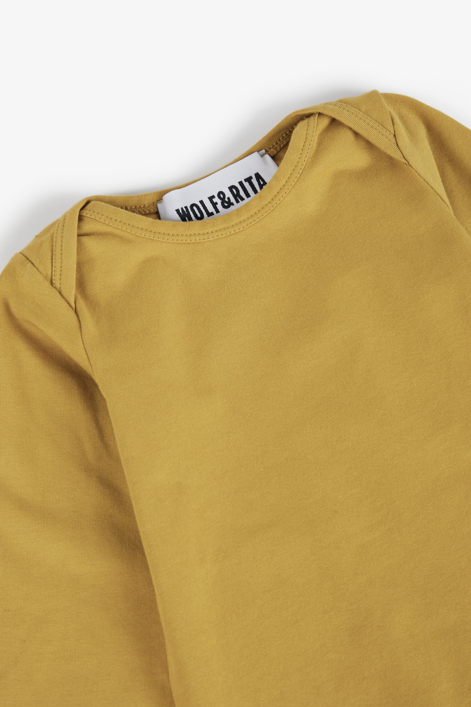 Long sleeved bodysuit with lap shoulders, snap buttons between the legs and removable collar