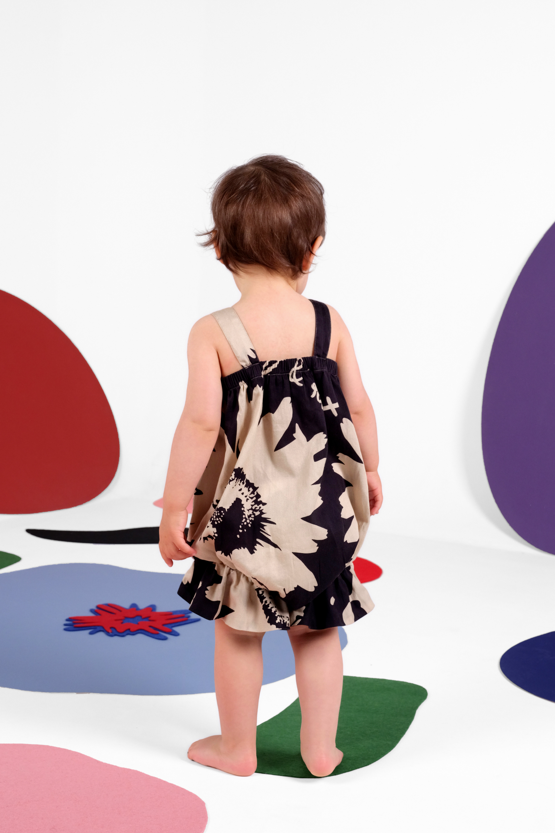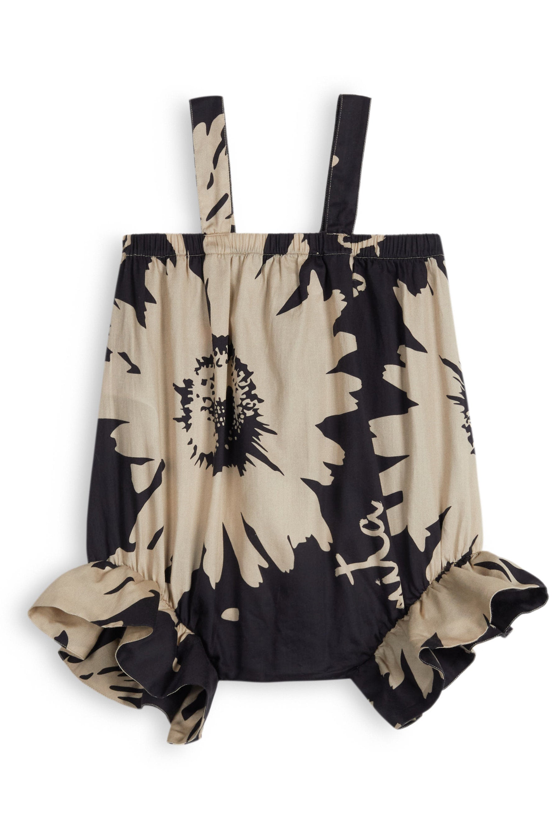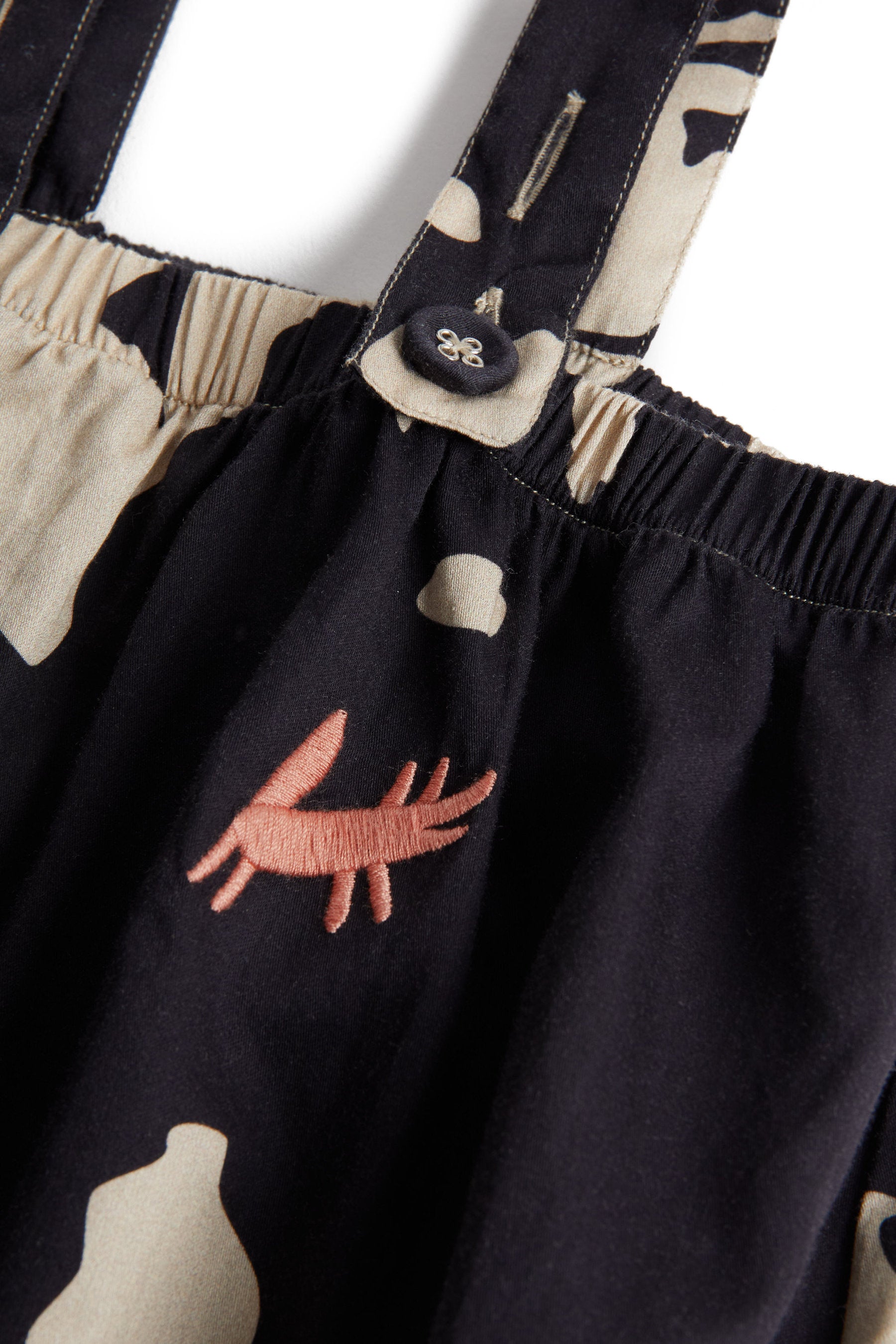 Sleeveless jumpsuit with frills on the legs, back button and snap buttons between the legs, with small mascot embroidery