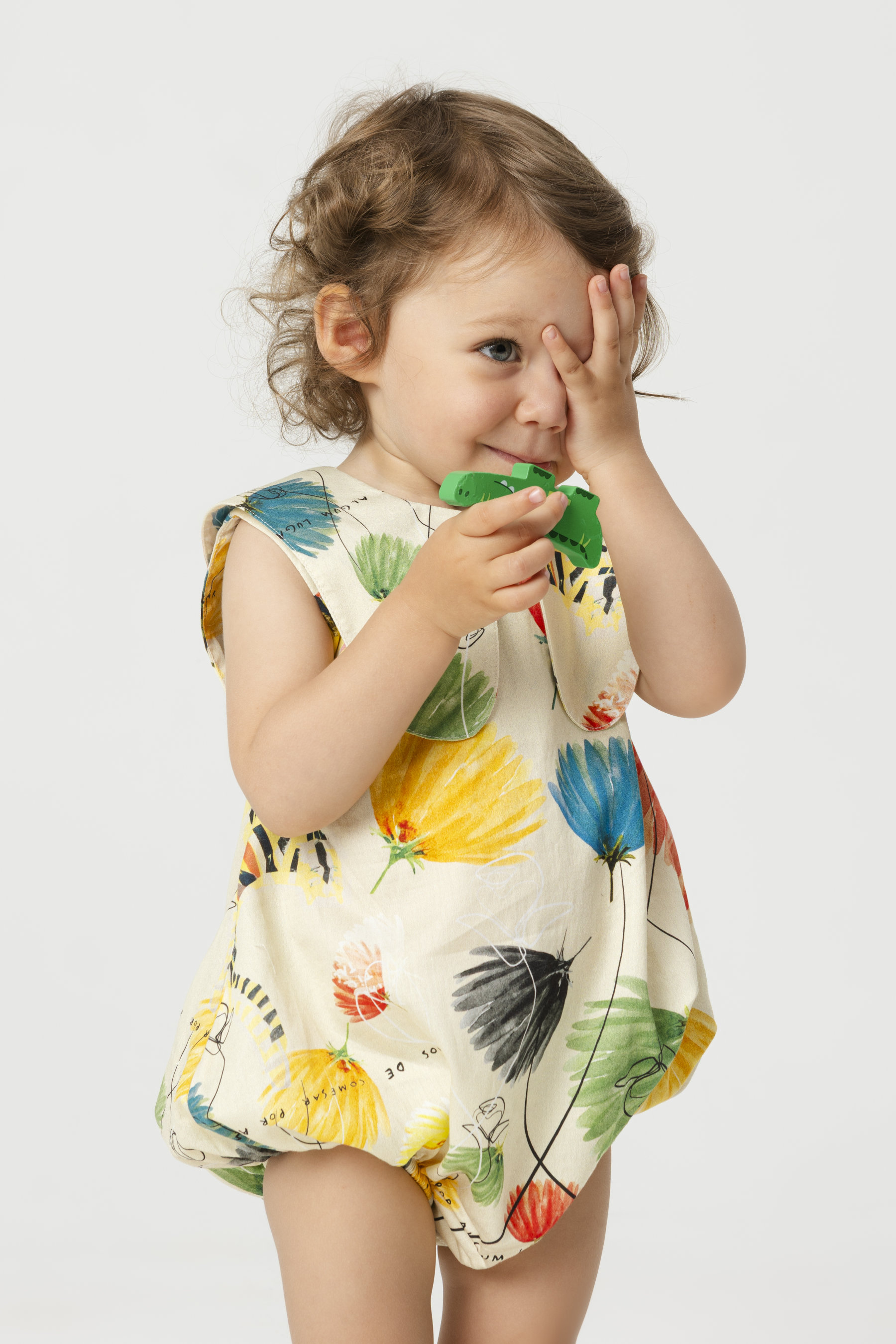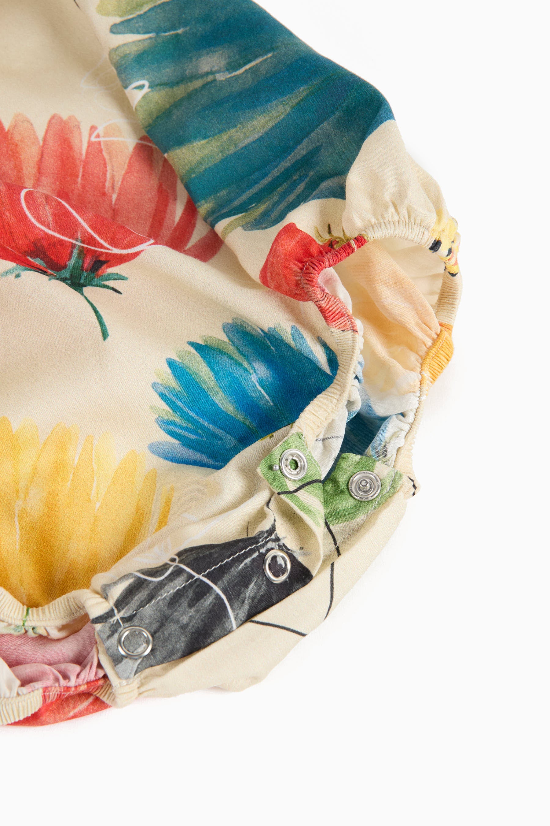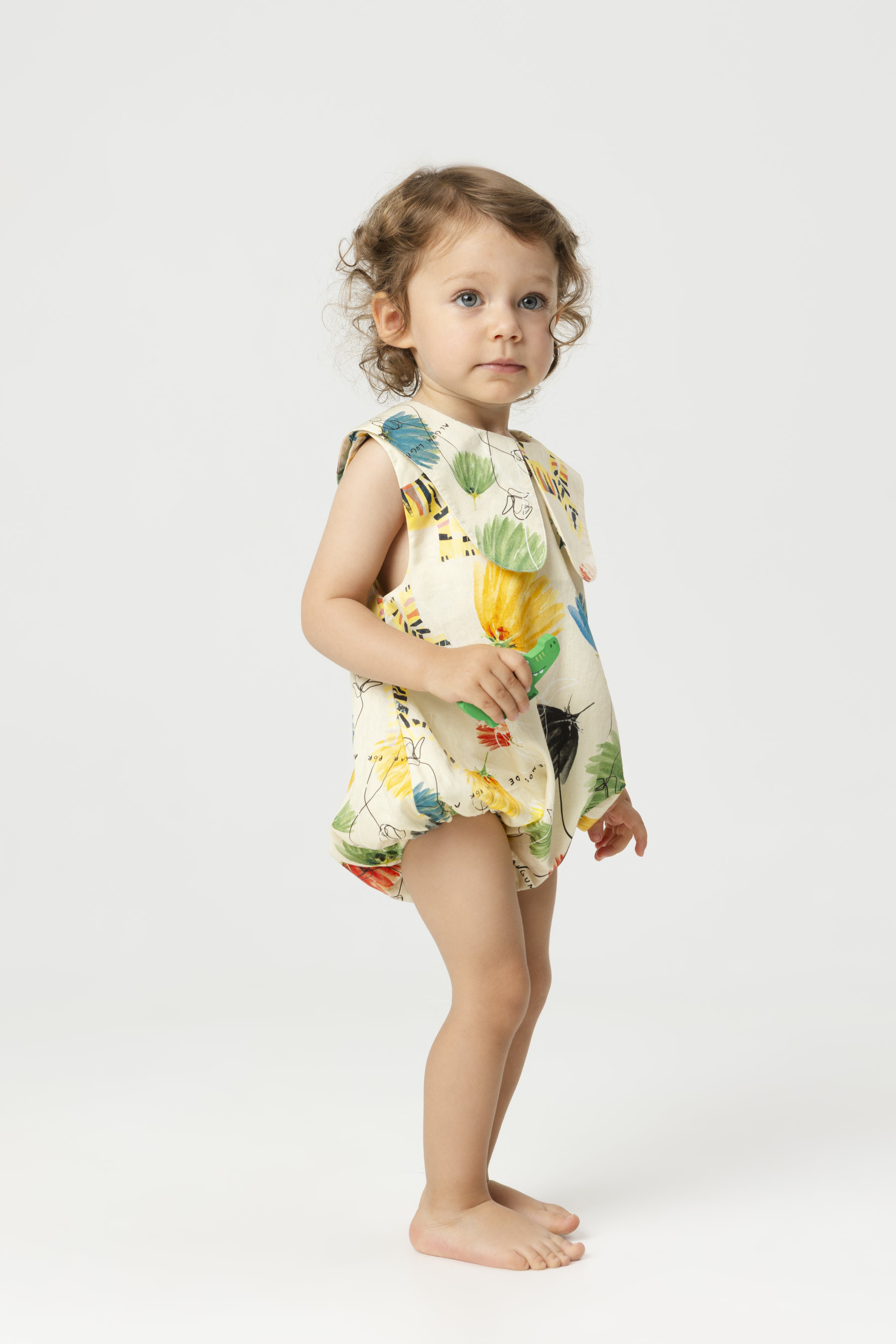 Sleeveless jumpsuit with pointed collar, back buttons and snap buttons between the legs