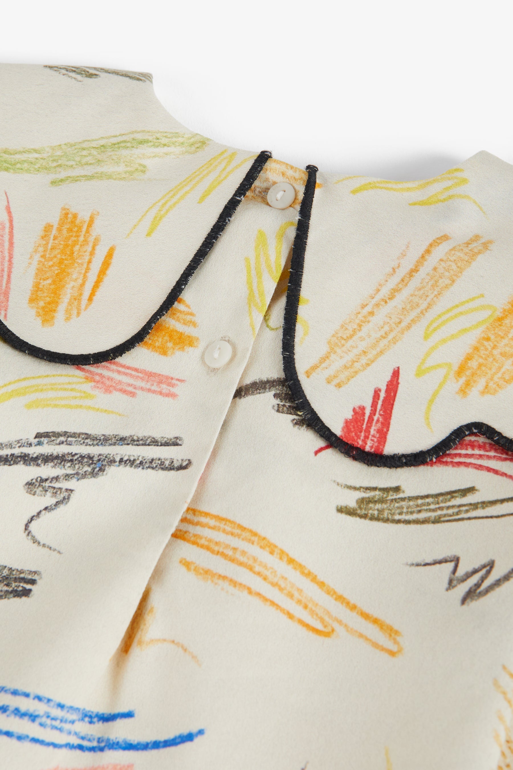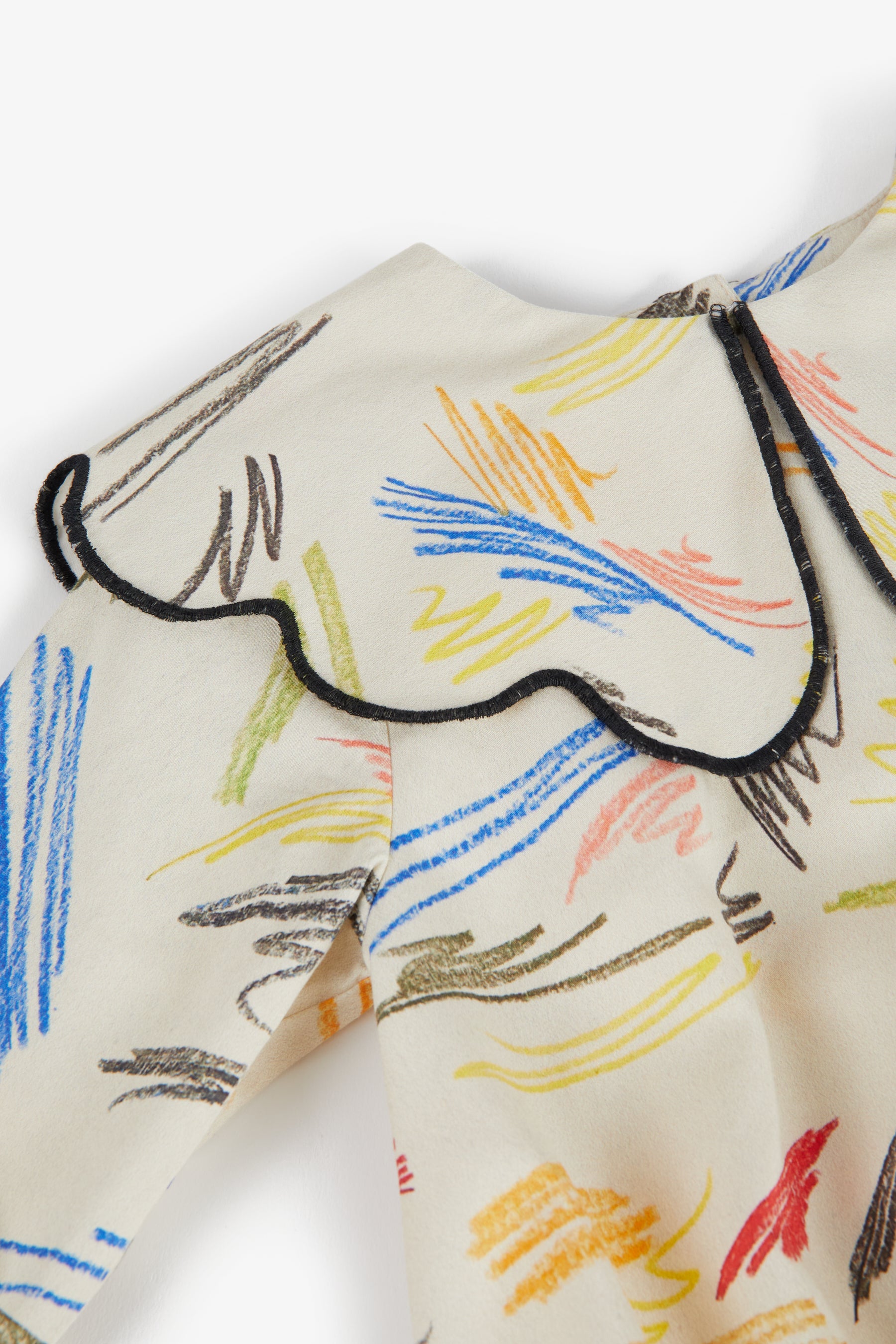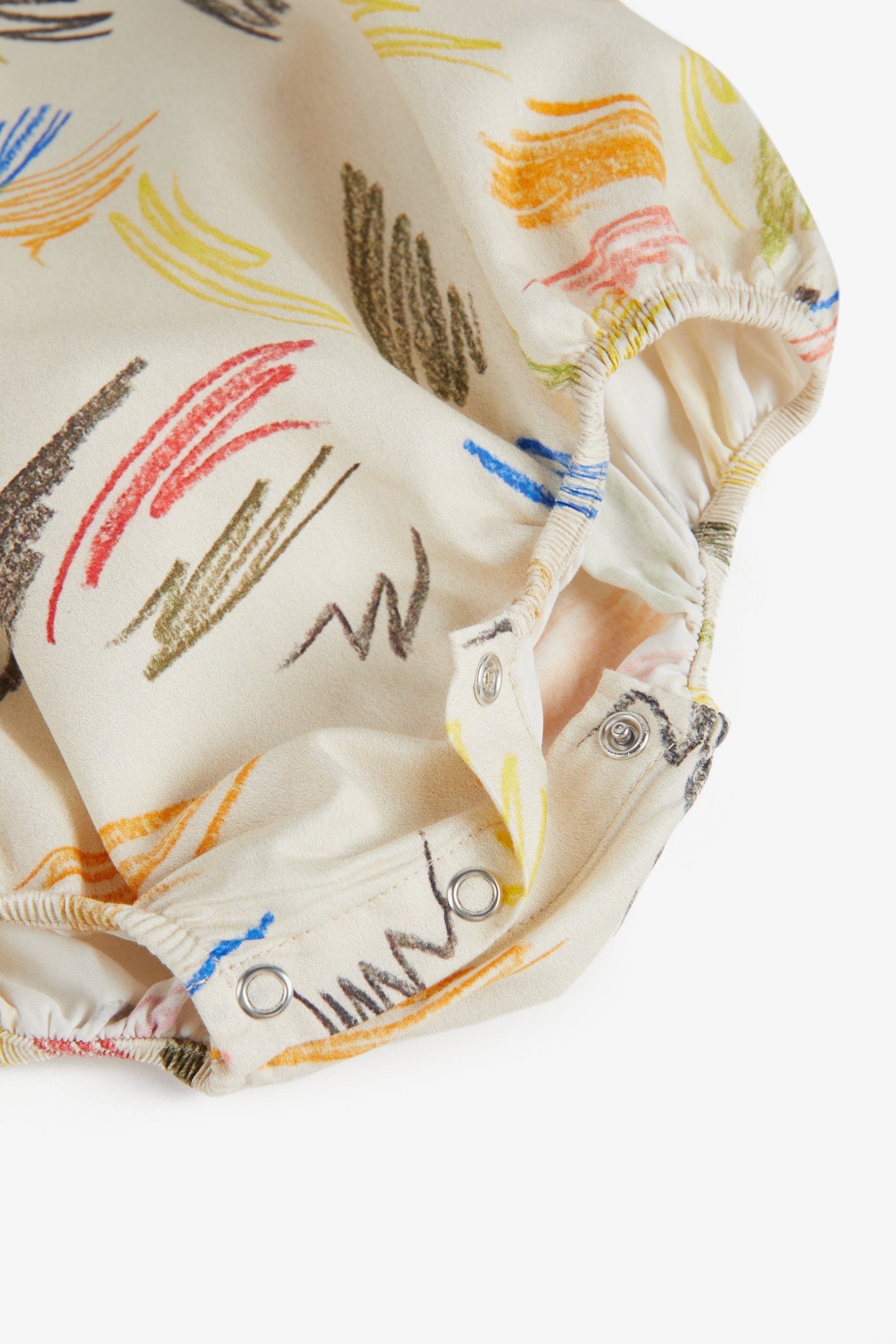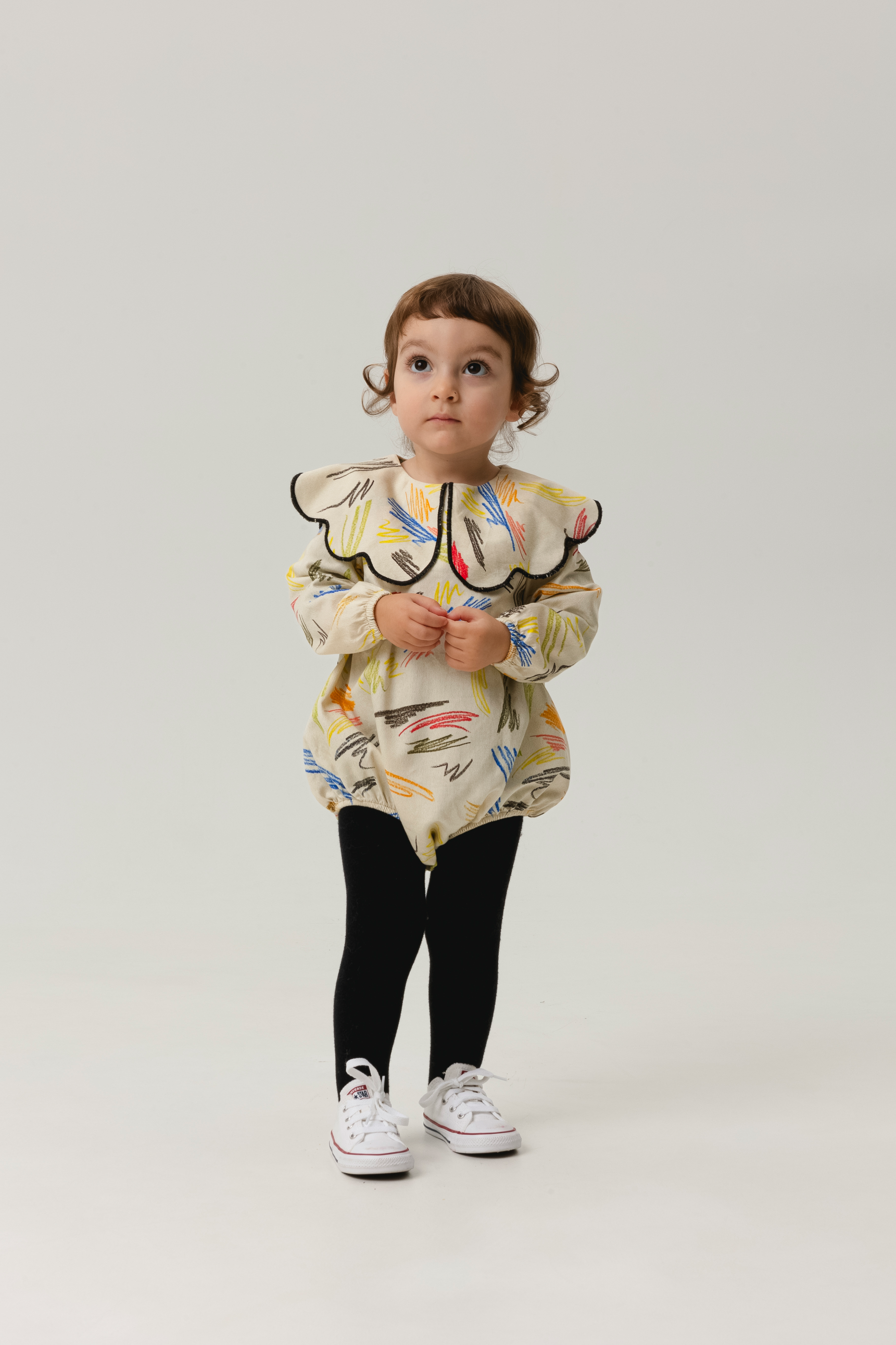 Long sleeved romper with scalloped collar, back buttons, snap buttons between the legs and elasticated cuffs