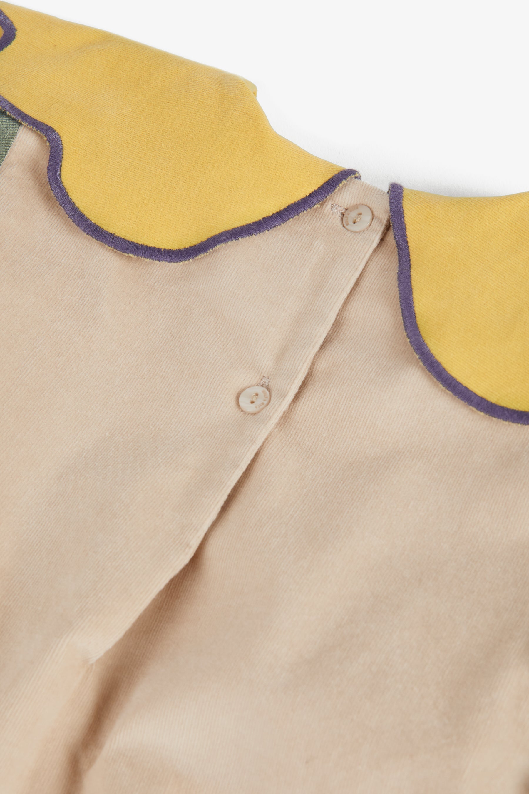 Long sleeved romper with contrasted sleeves, scalloped contrasted collar, back buttons, snap buttons between the legs and elasticated cuffs