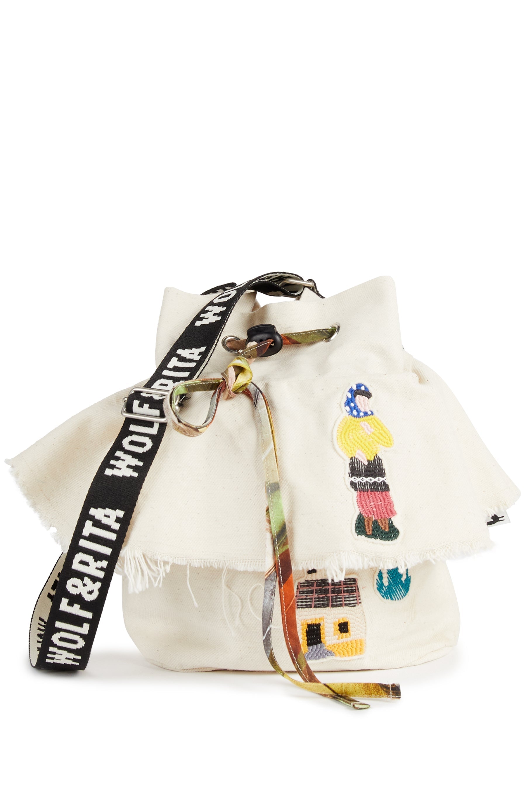 Denim bucket bag with contrasted lining, adjustable strap, frill with raw hem and patches