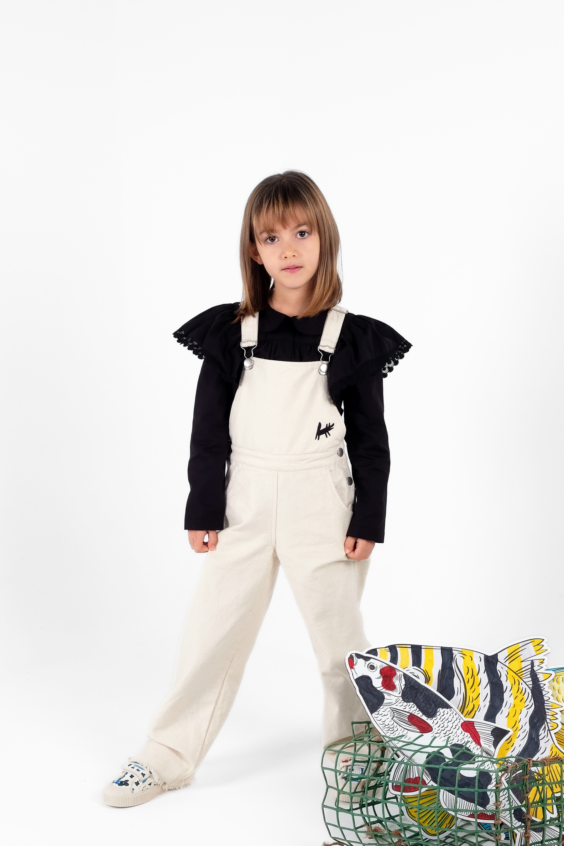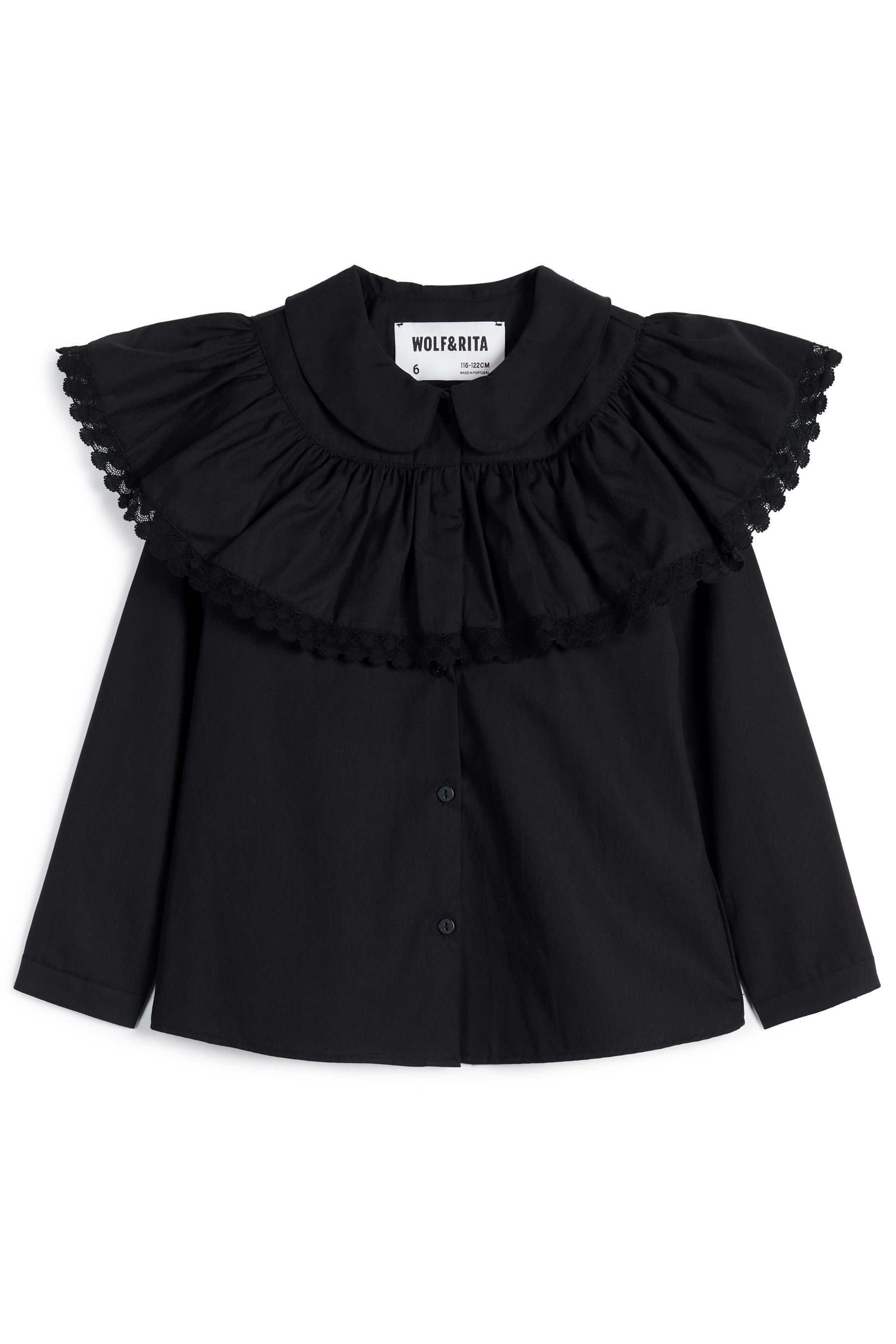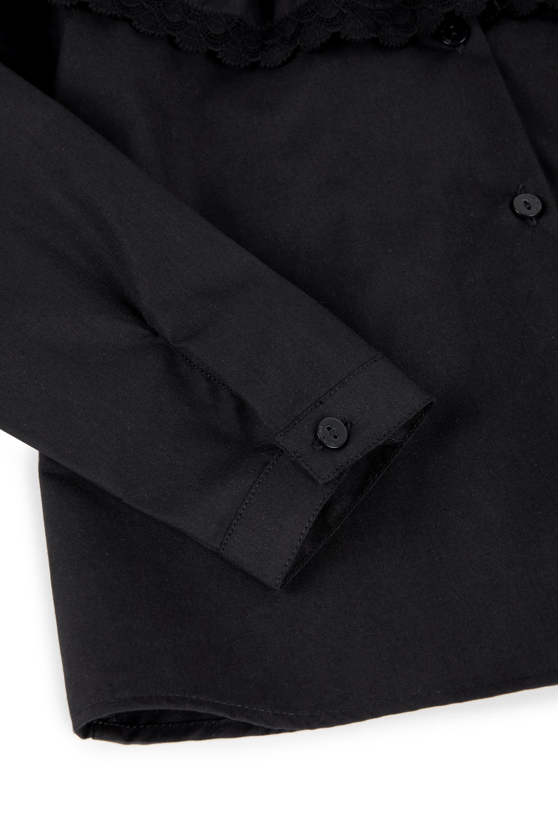 Long sleeved prairie blouse with front buttons, elasticated cuffs, round collar, ruffled lace details and cuff buttons