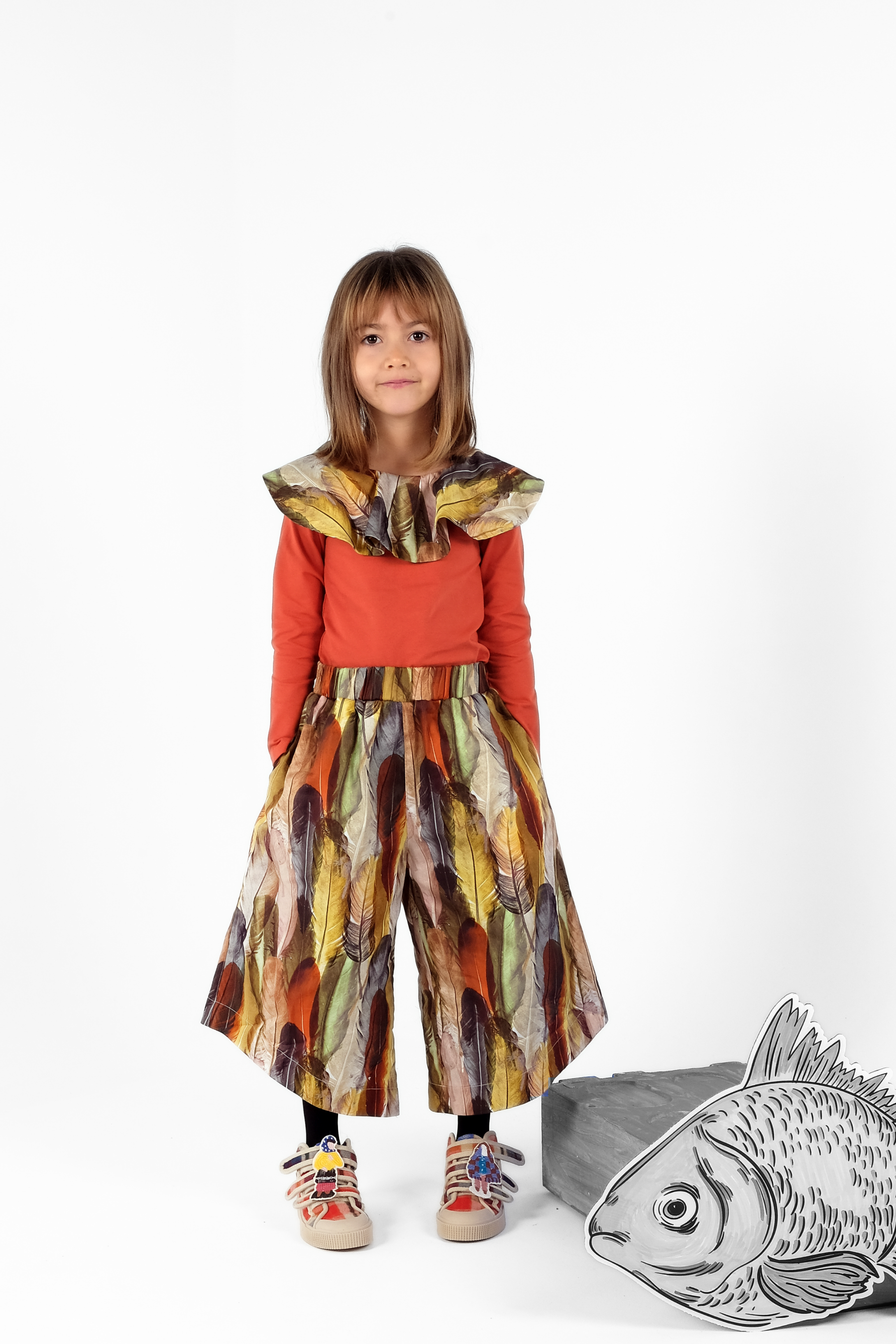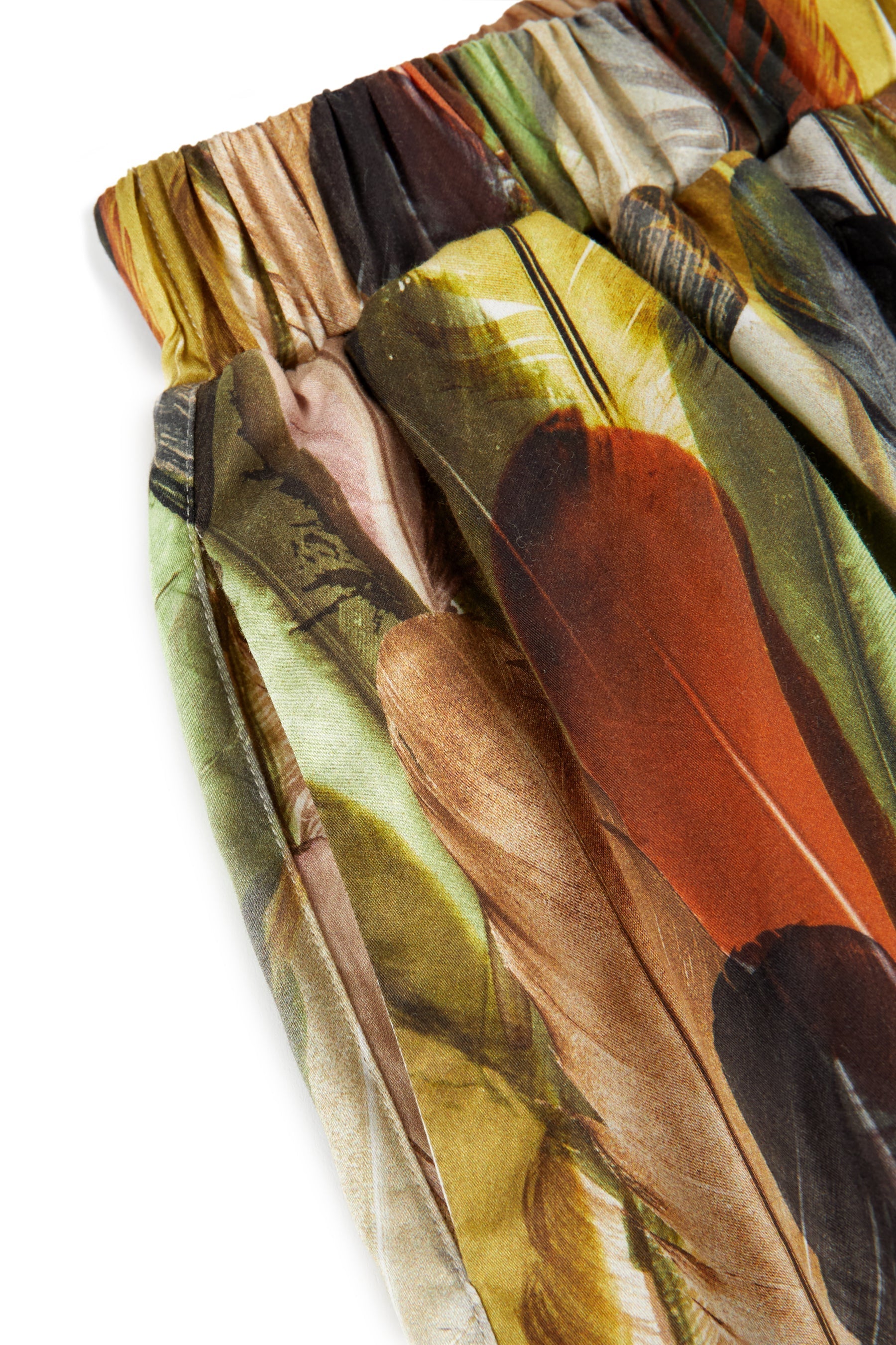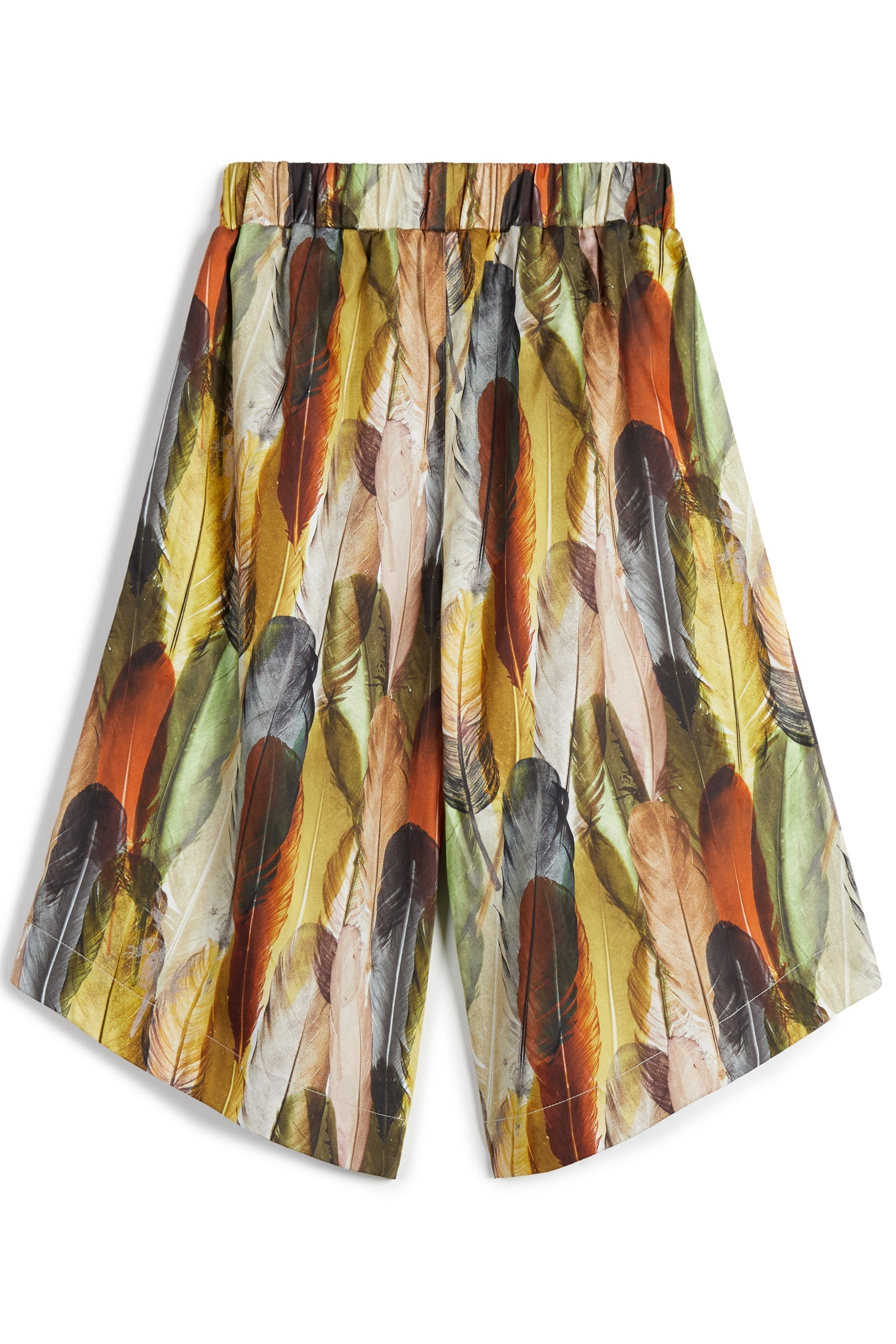 Cropped, asymmetric wide leg trousers with elastic waist and side pockets