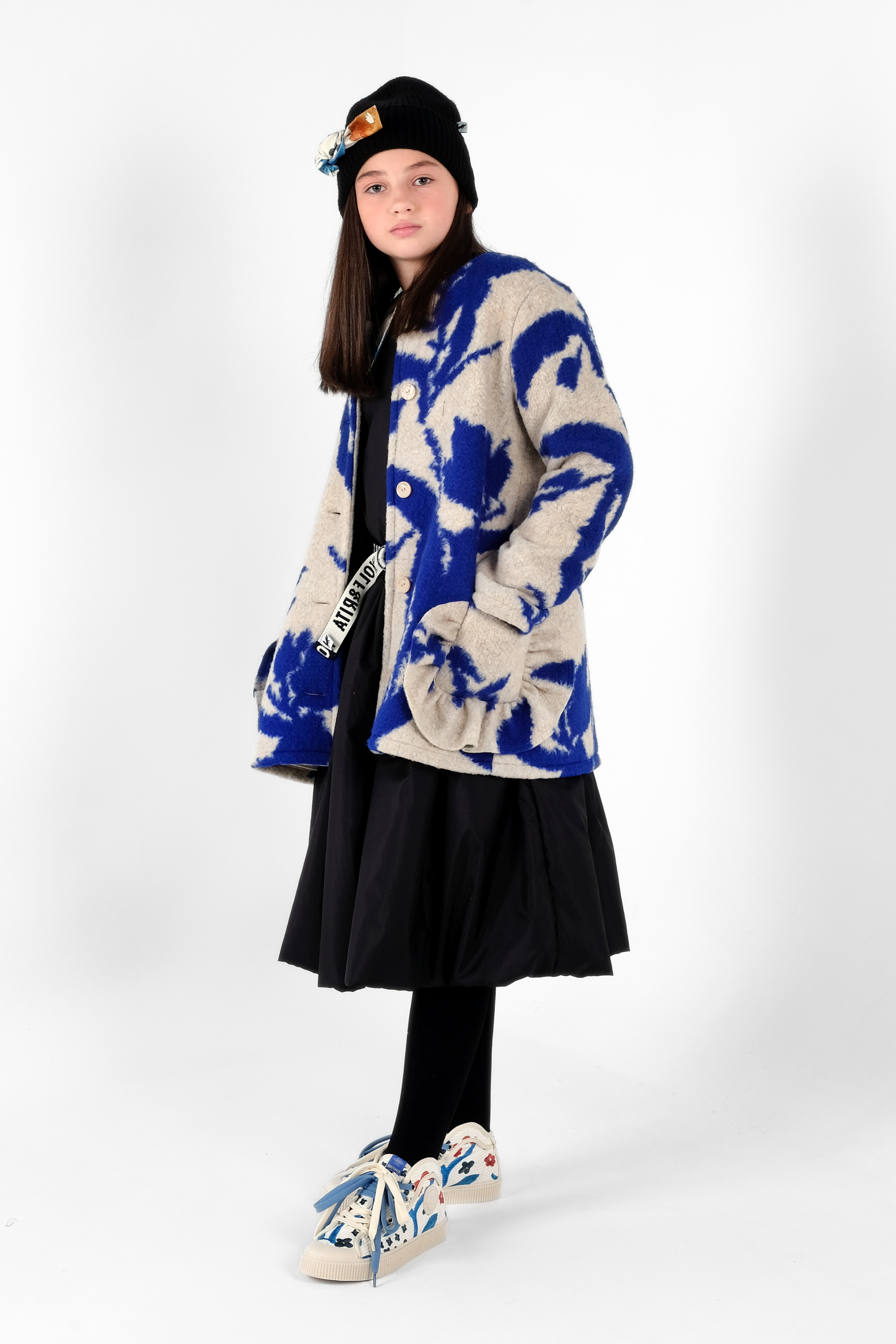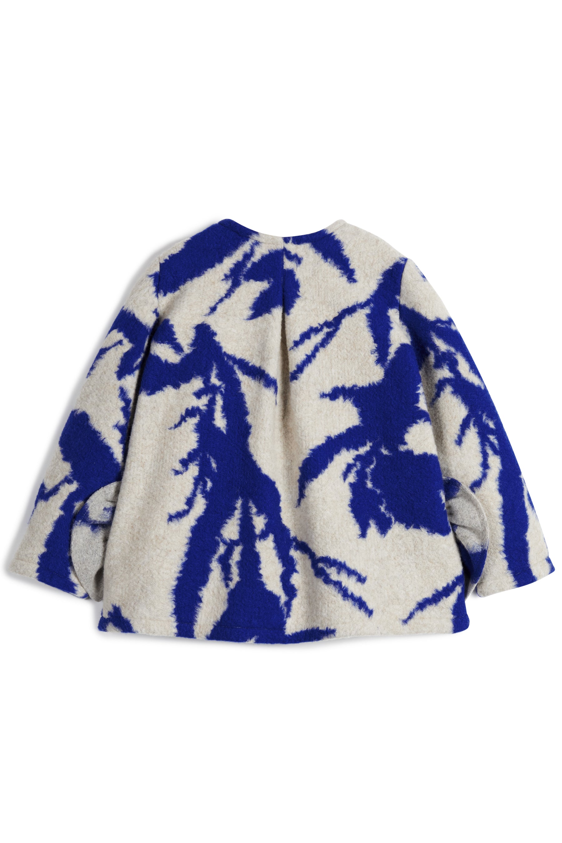 A-line coat with dart on the back, front pockets with frills and front buttons