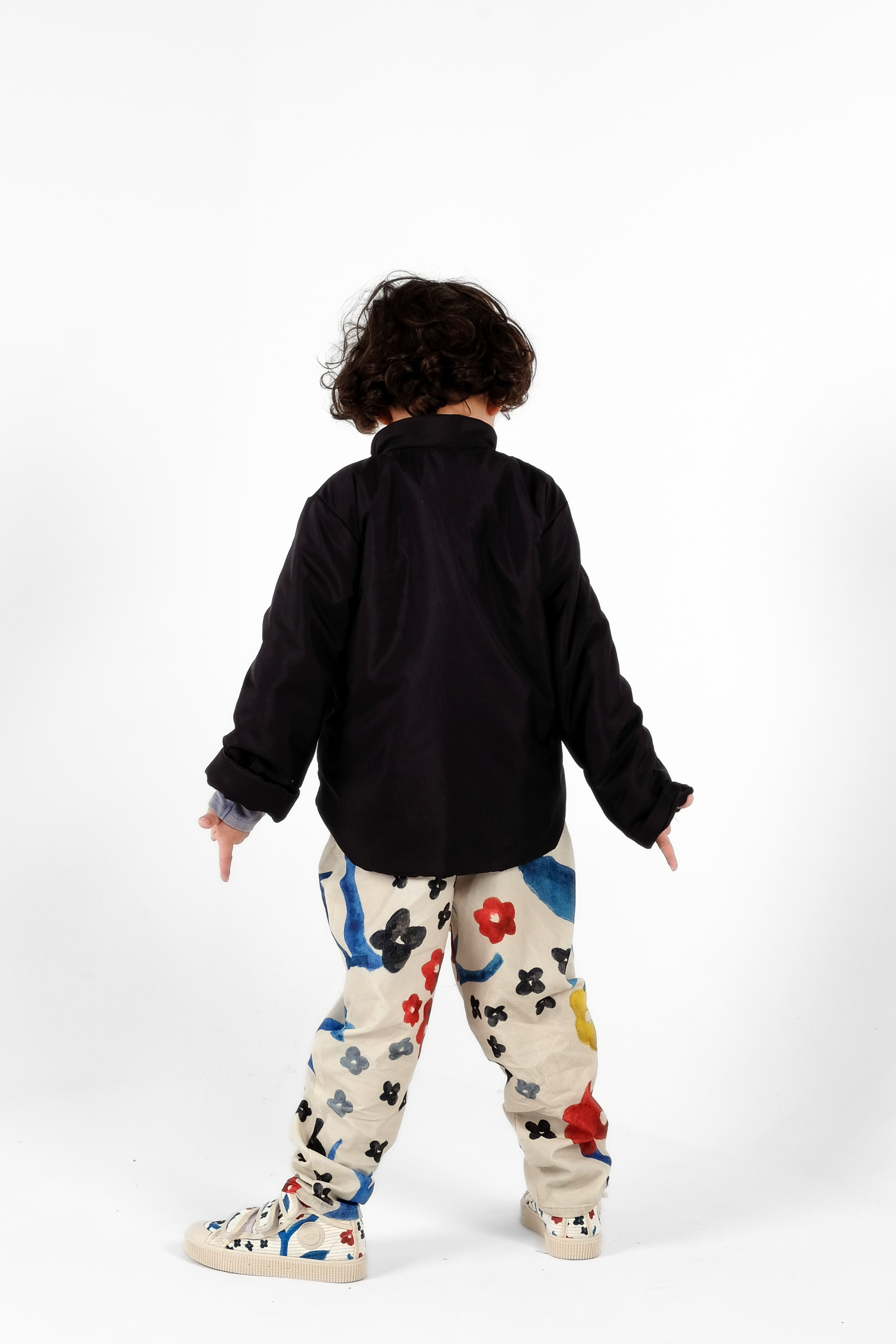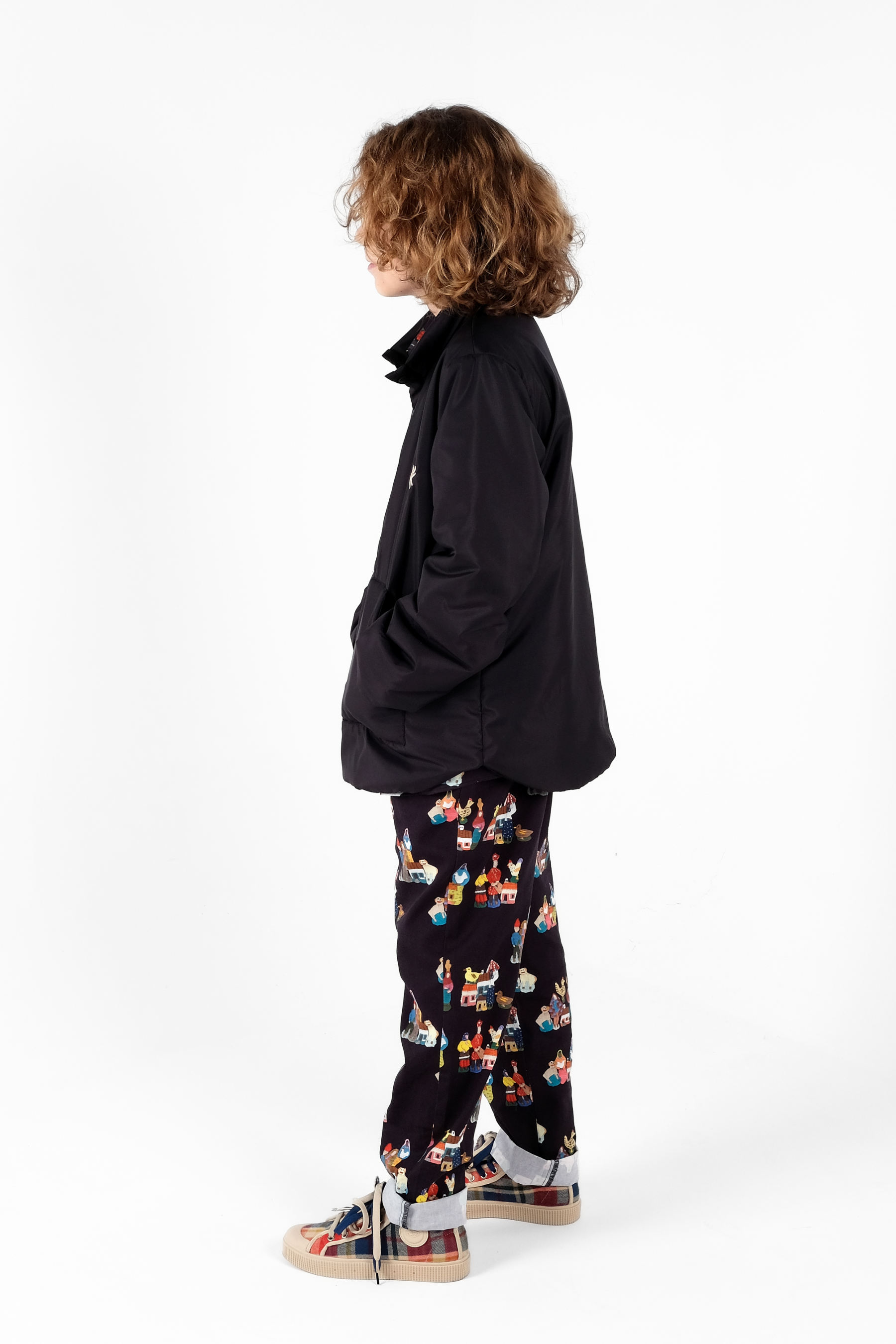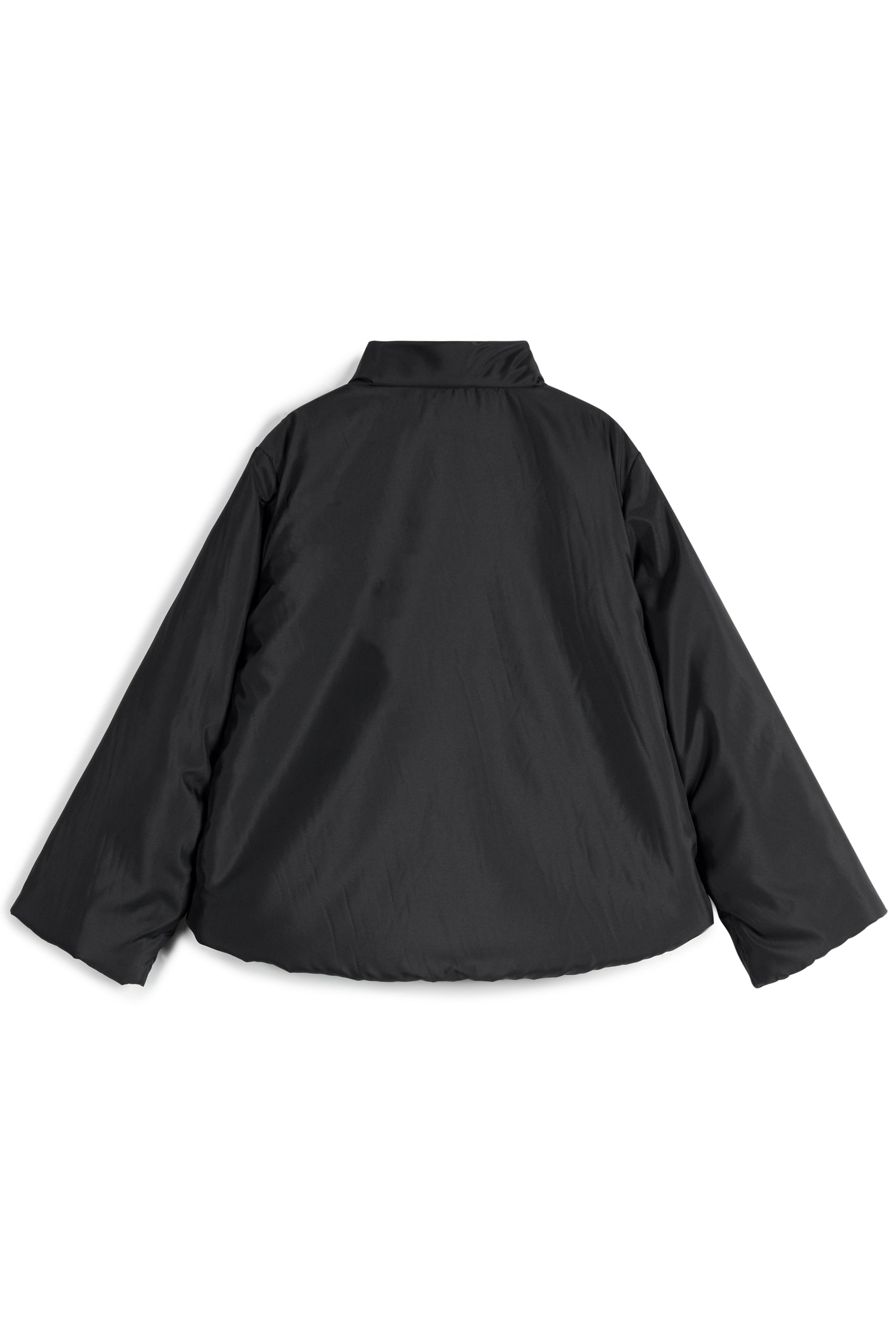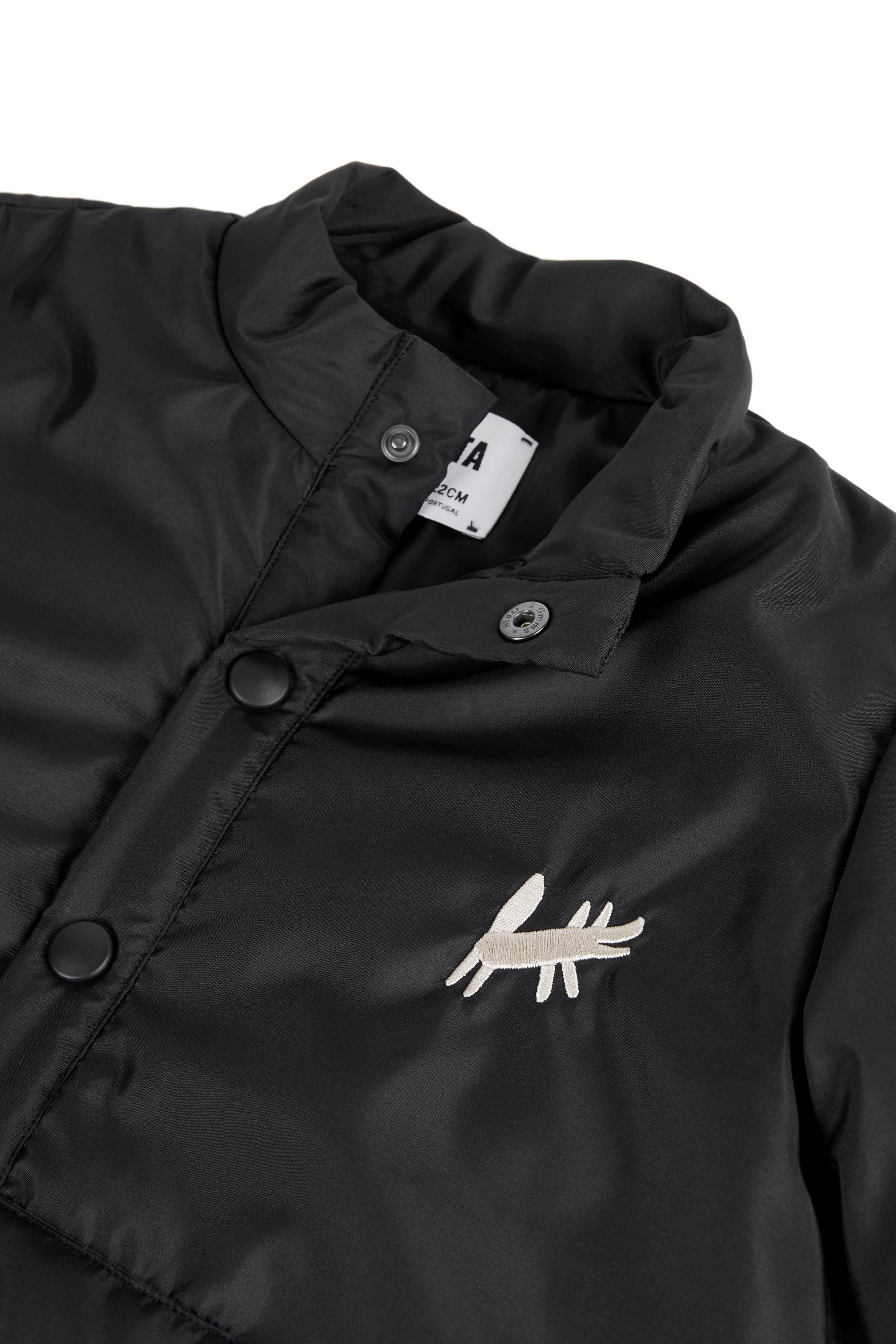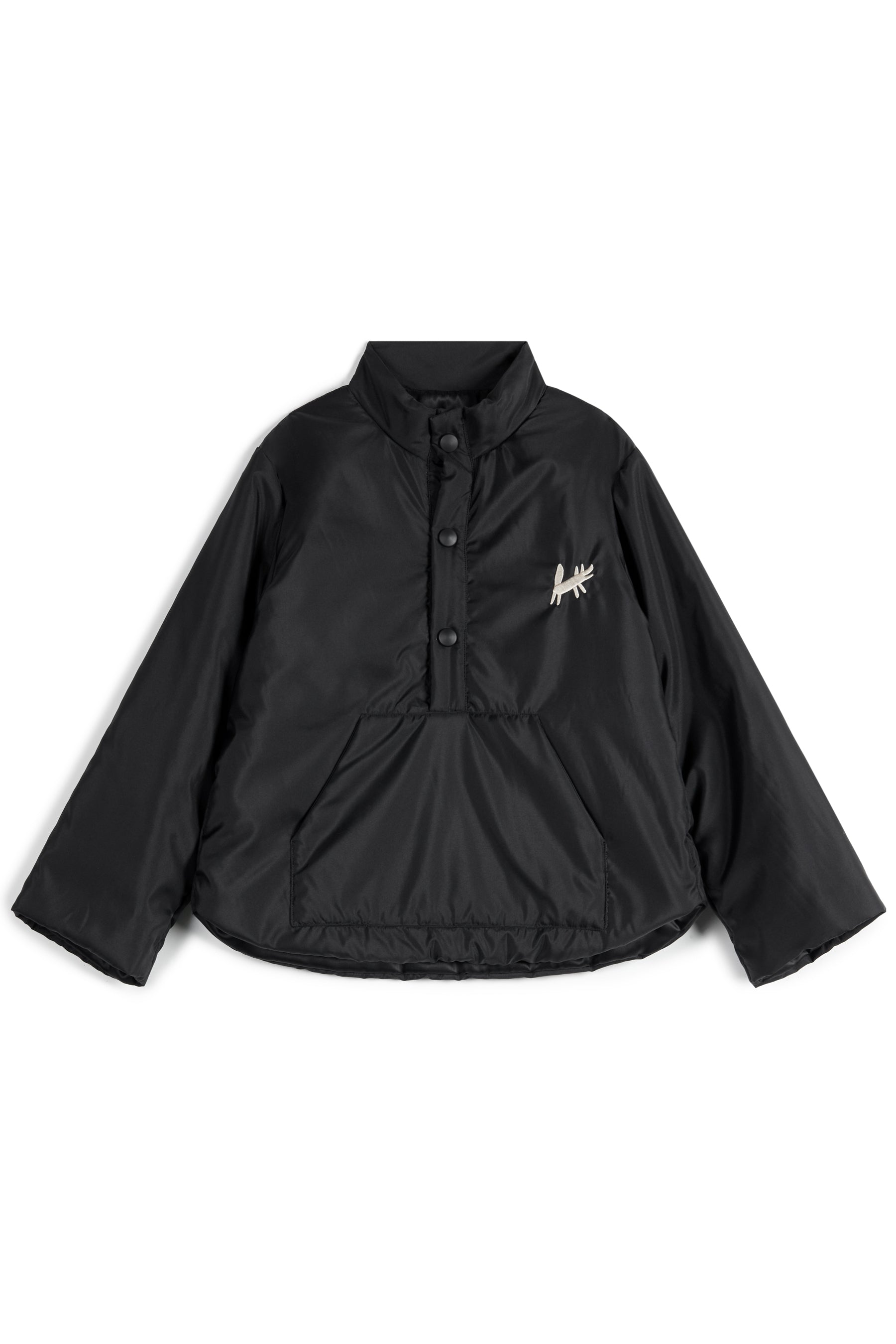 Padded anorak with canguru pocket, press buttons, round hem, imperial collar and small mascot embroidery