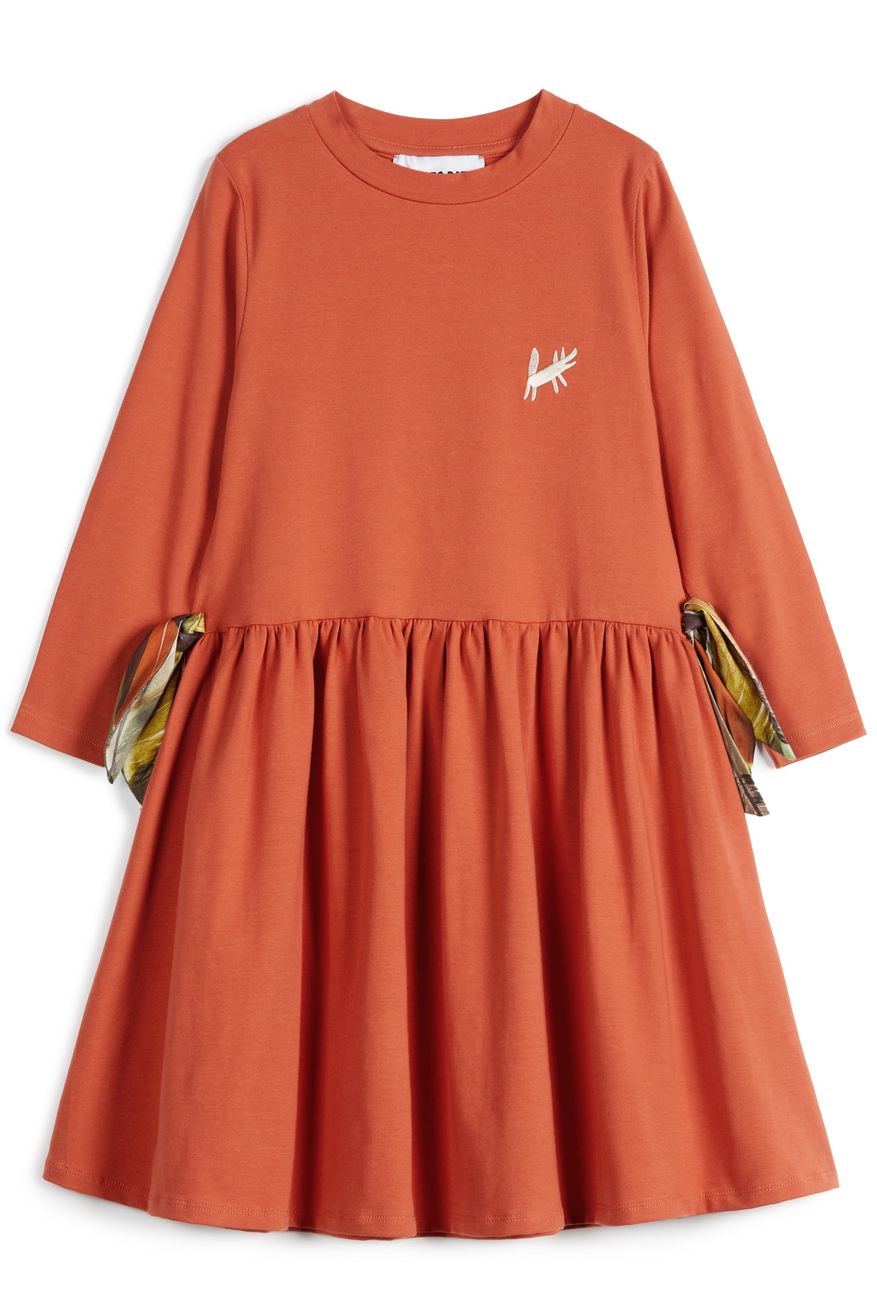 Mid length, long sleeved dress with gathered skirt, side bows and small mascot embroidery