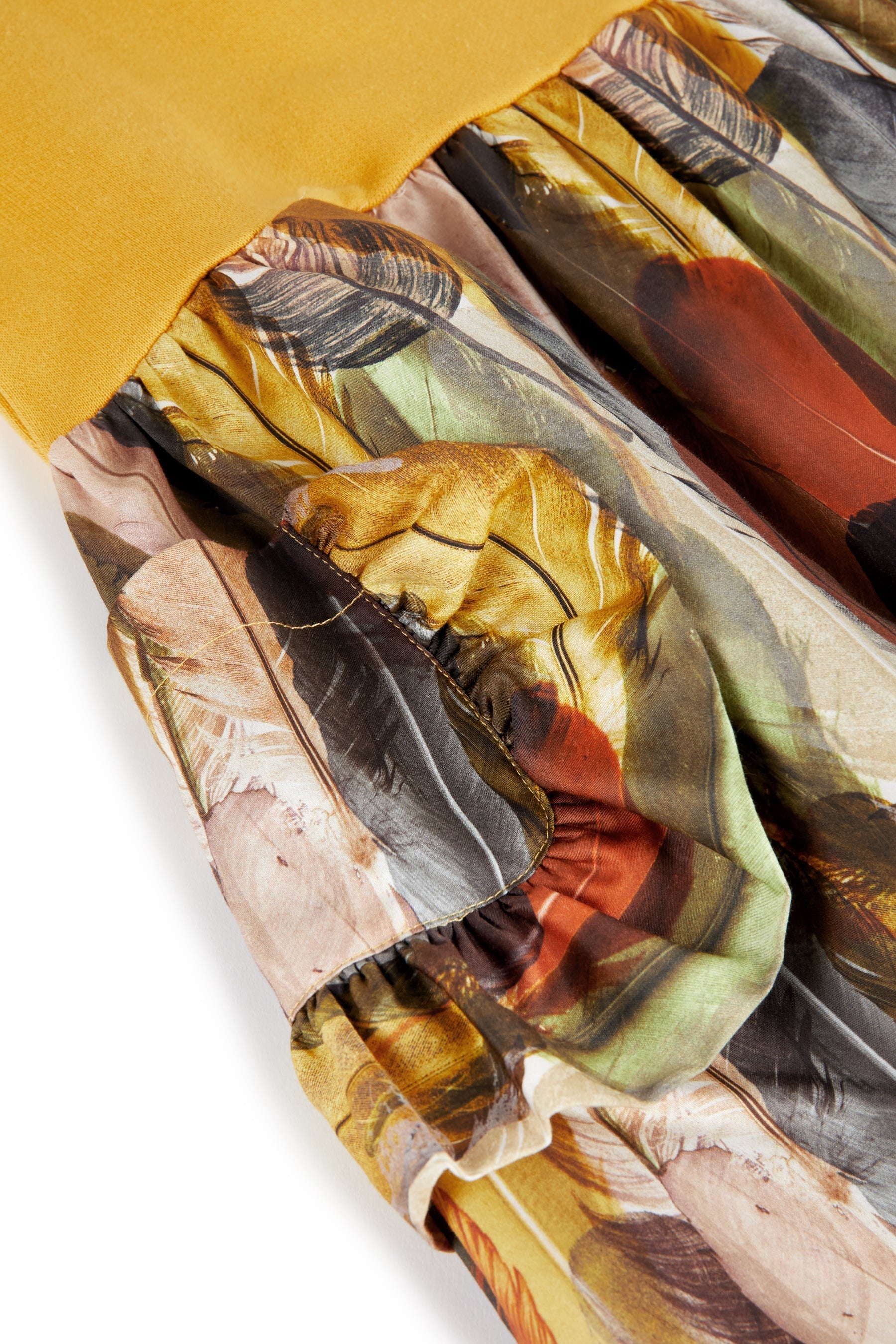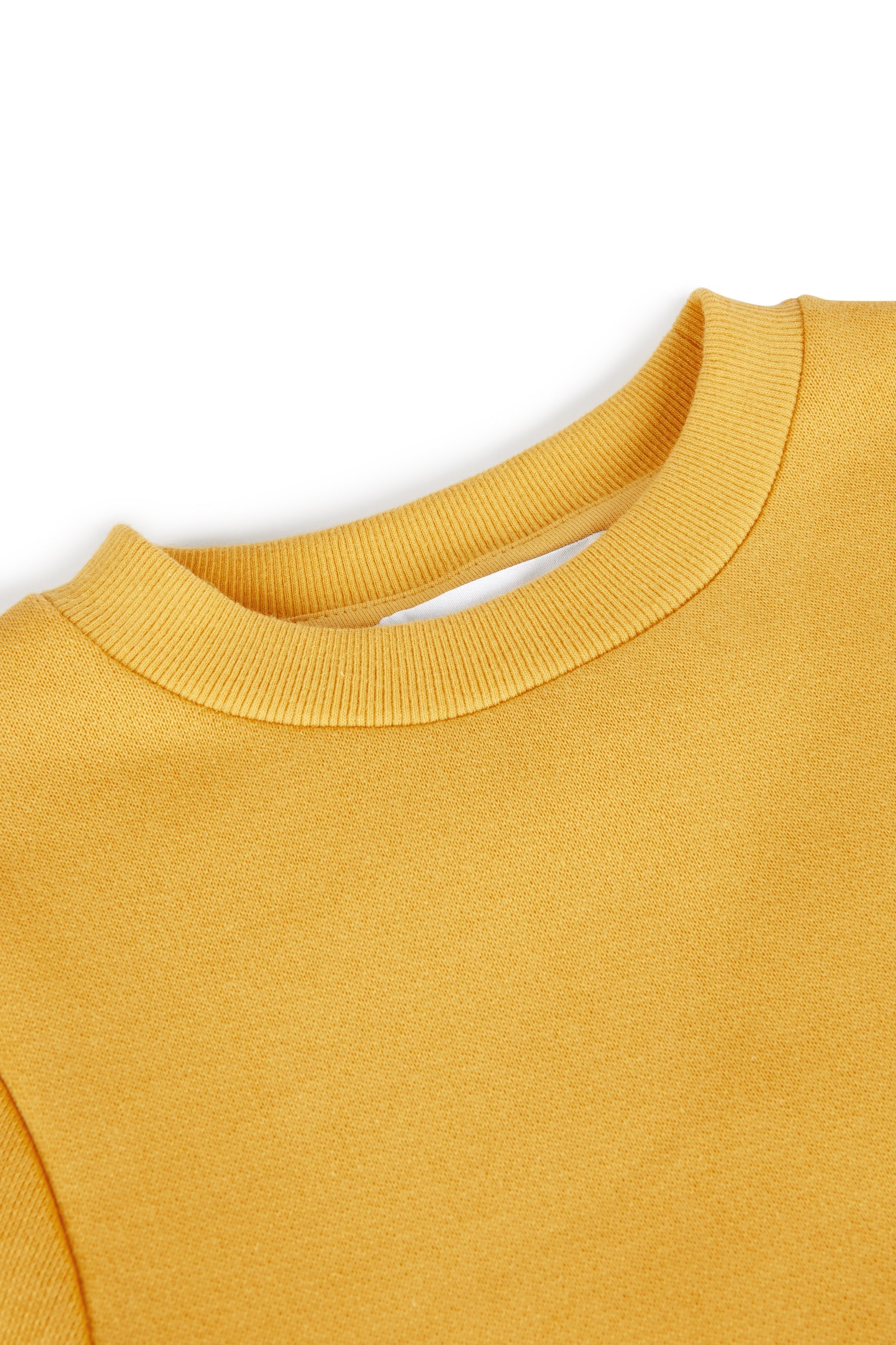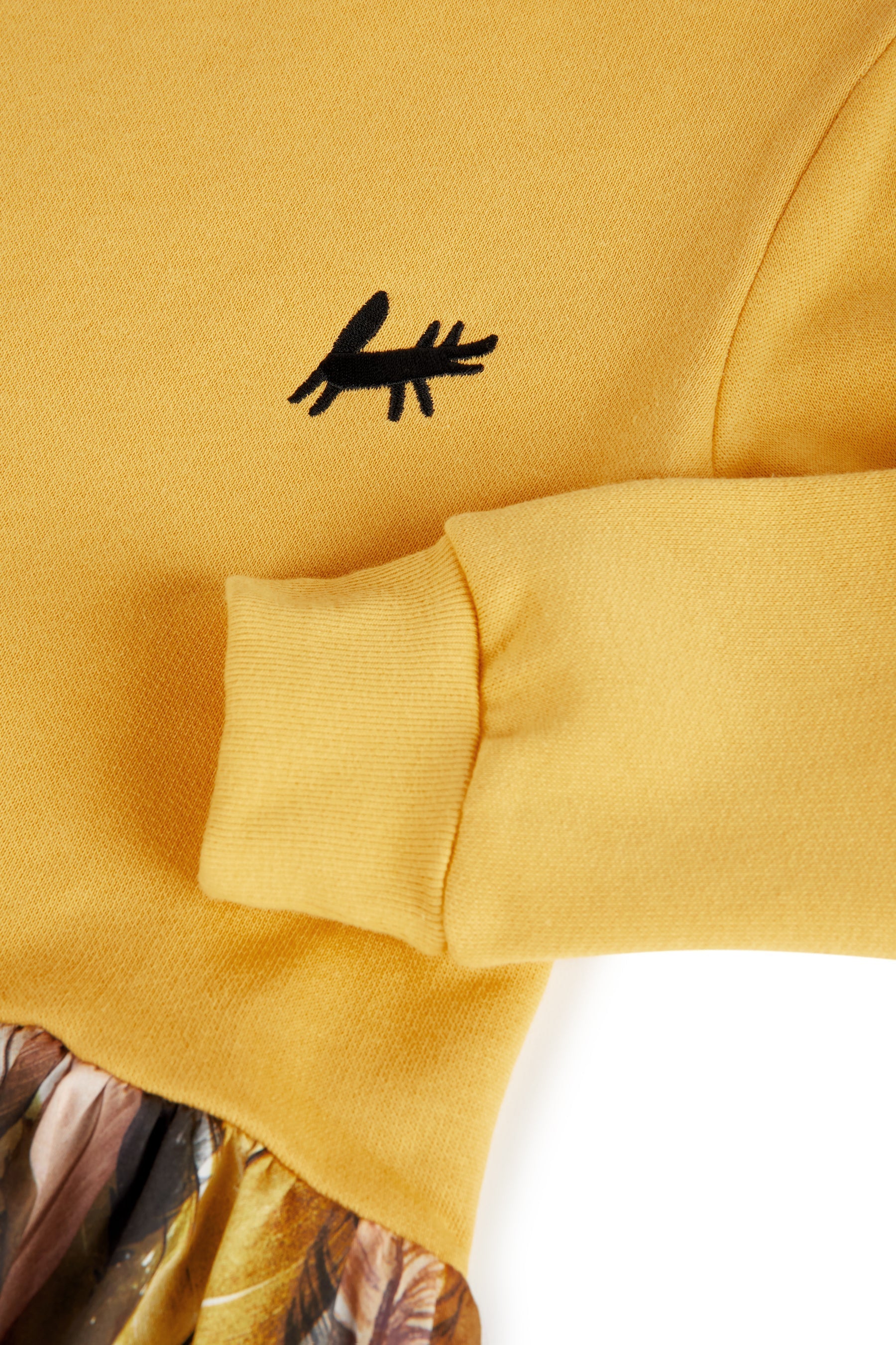 Long sleeved, knee length fleece dress with gathered contrast skirt, front pockets with frill detail and small mascot embroidery