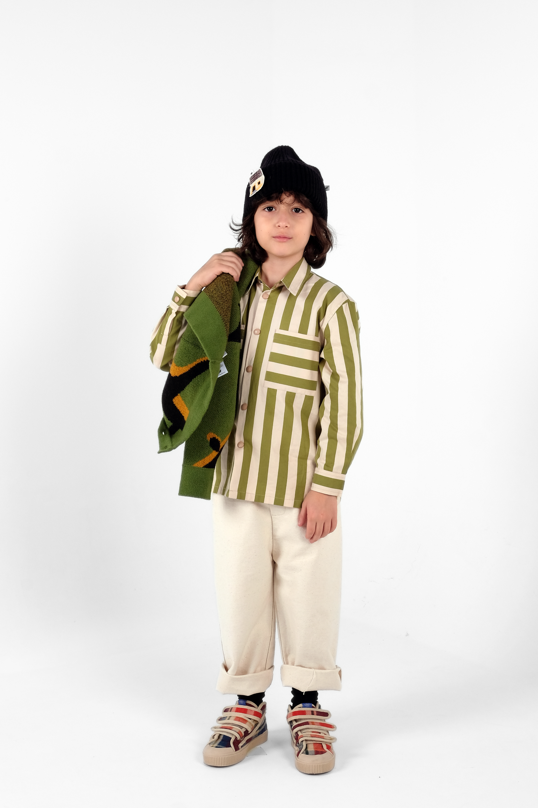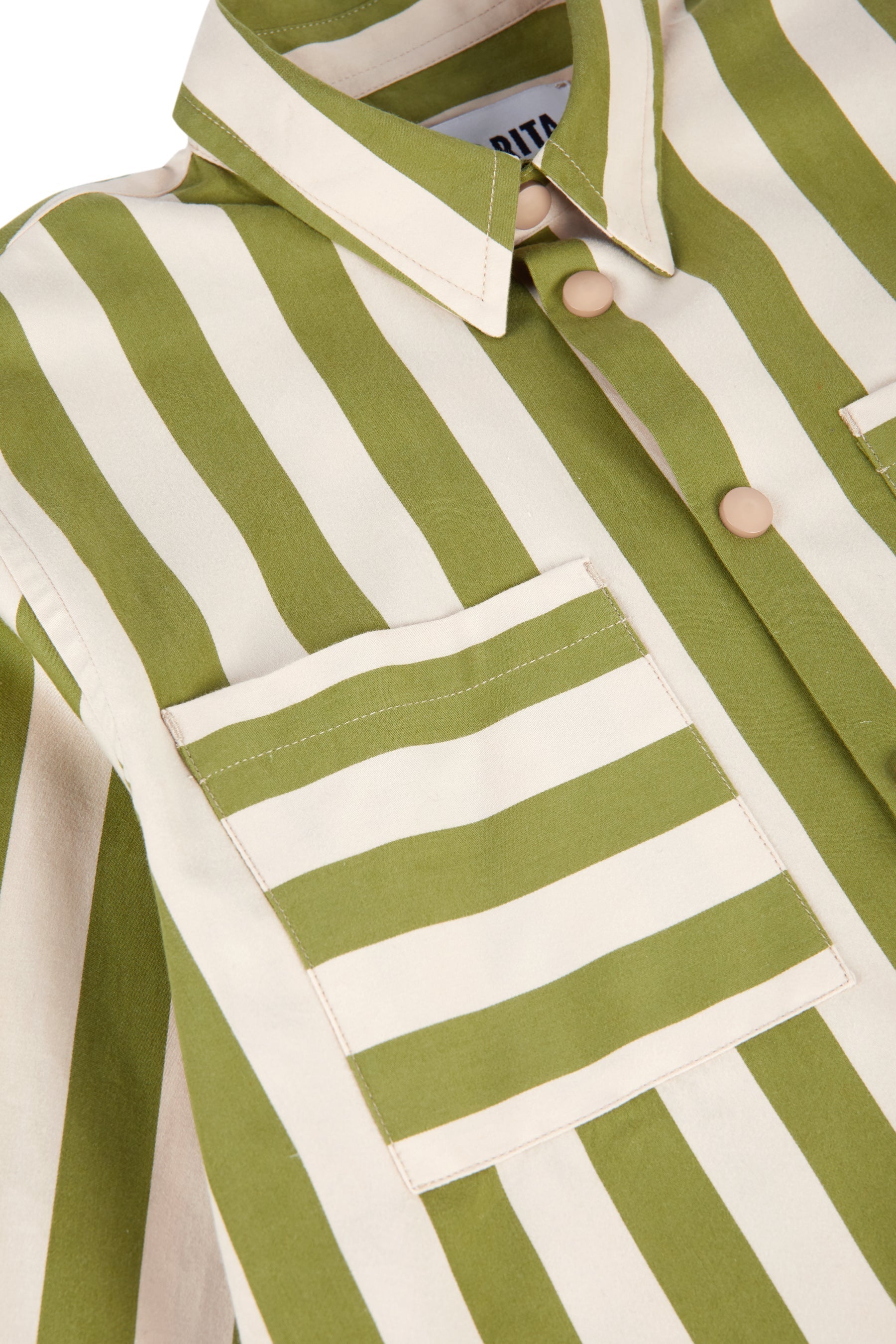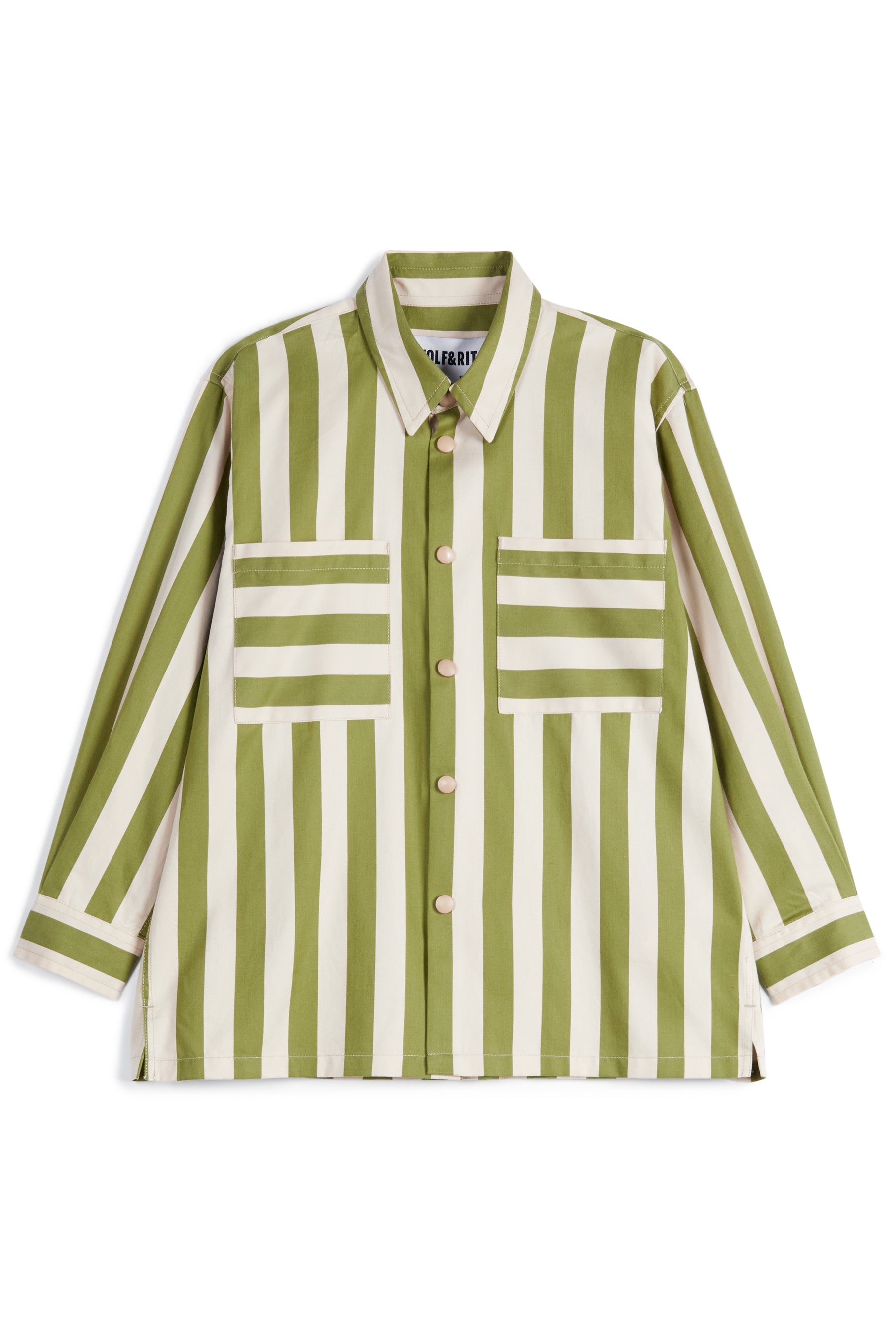 Long sleeved button-up shirt, loose fit, with front pockets, press buttons and center back pleat