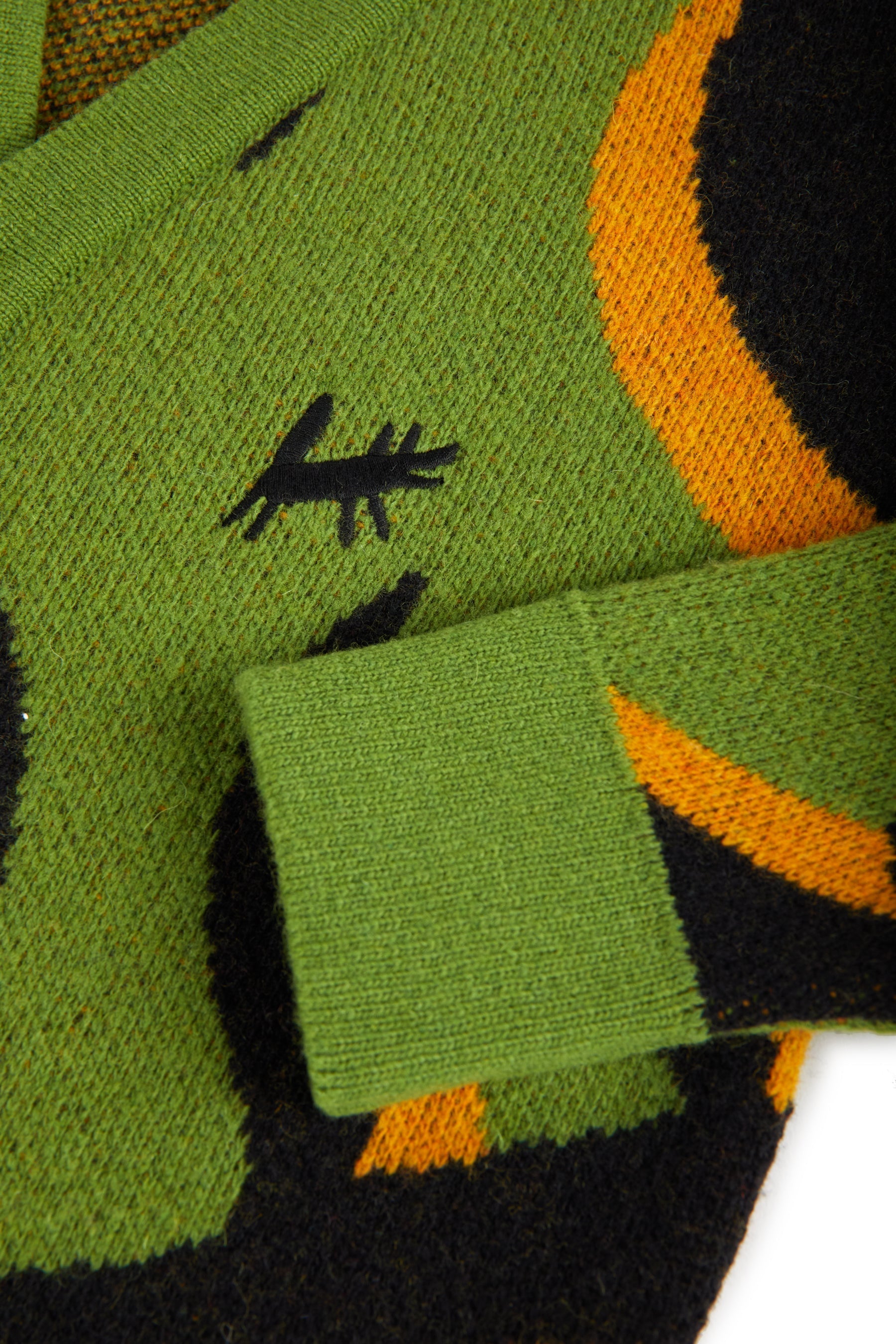 Knitted jacquard loose fit v-neck cardigan with front buttons and small mascot embroidery