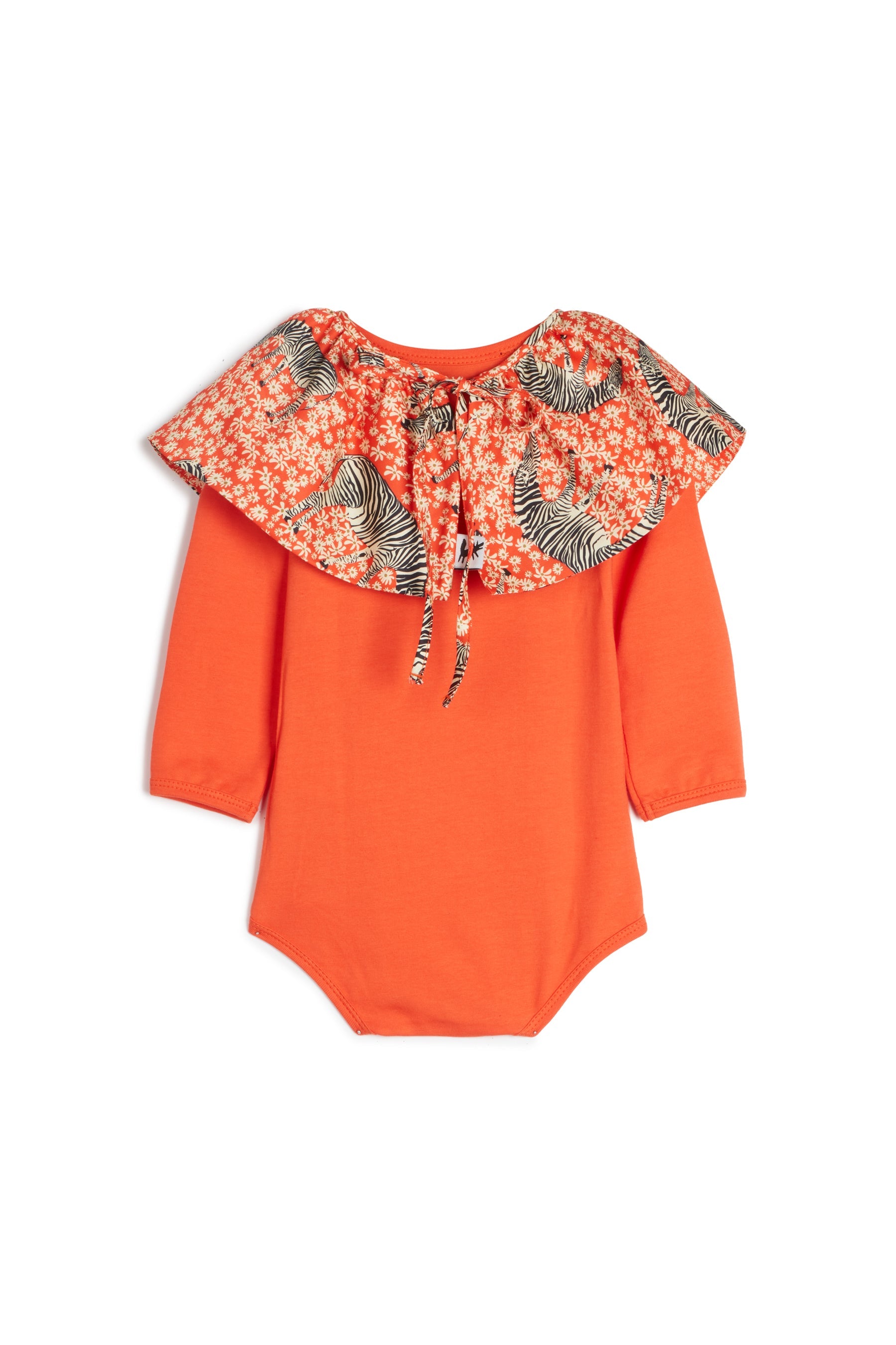 Long sleeved bodysuit with lap shoulders, snap buttons between the legs and with removable scalloped collar