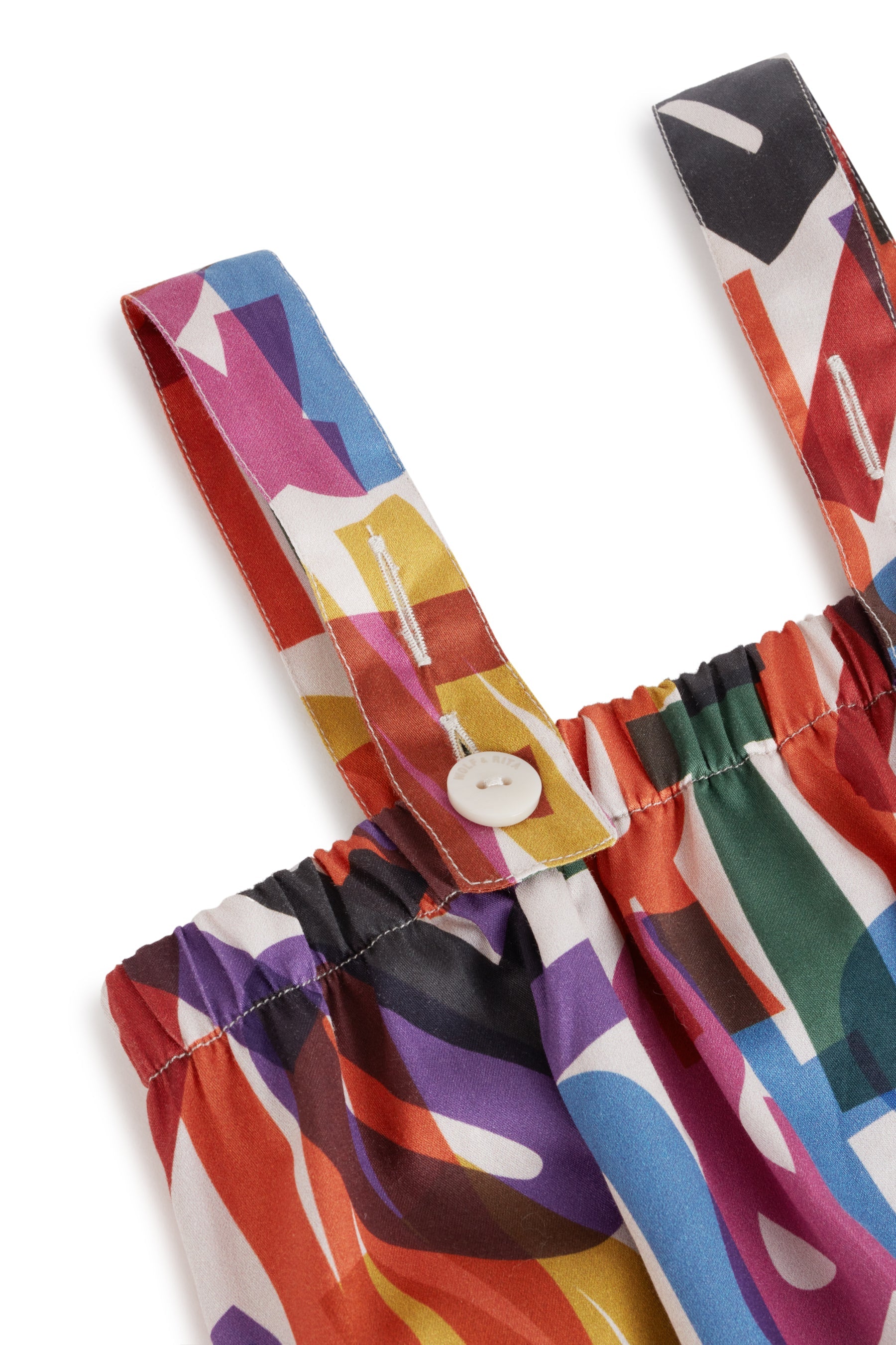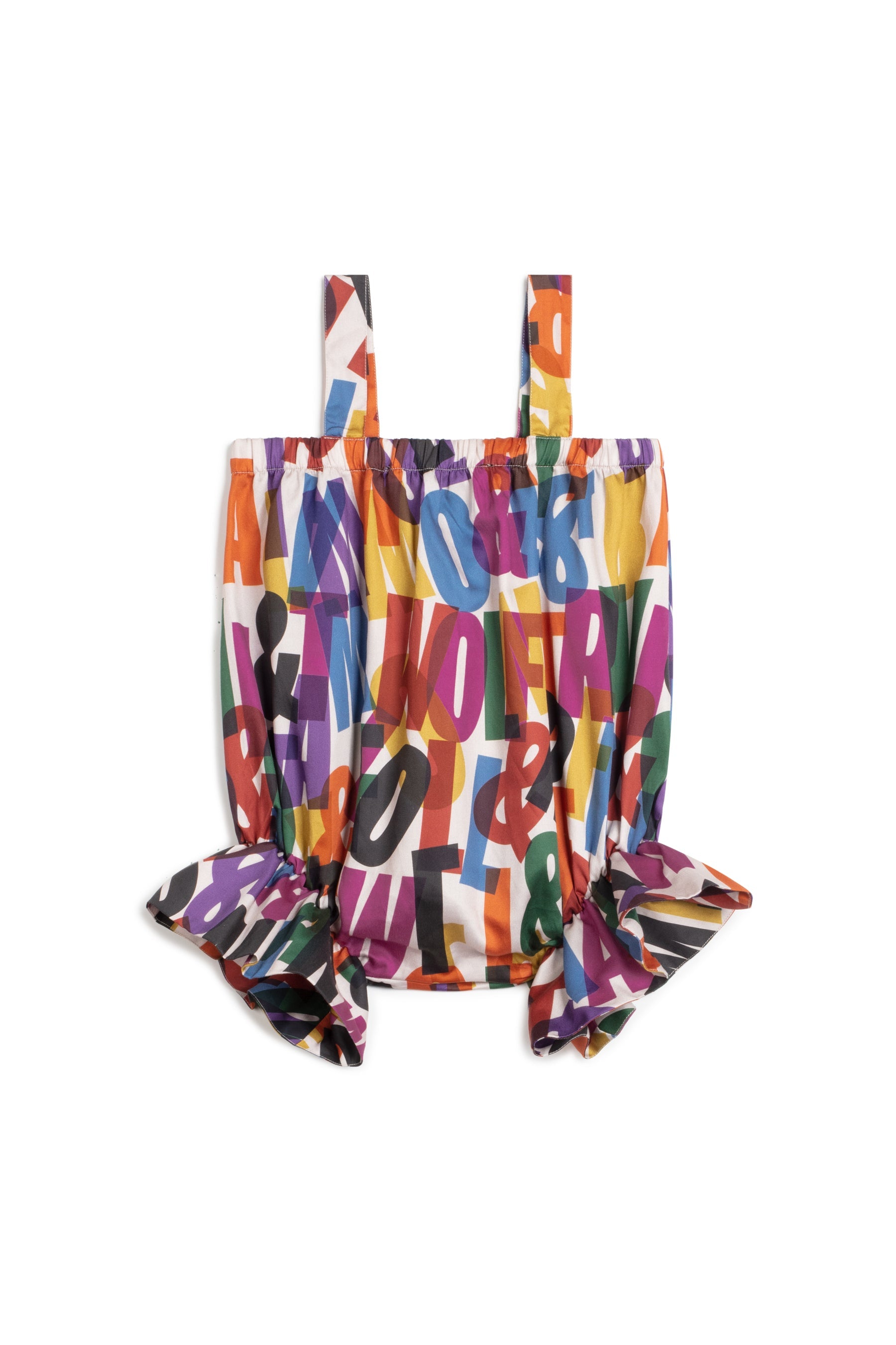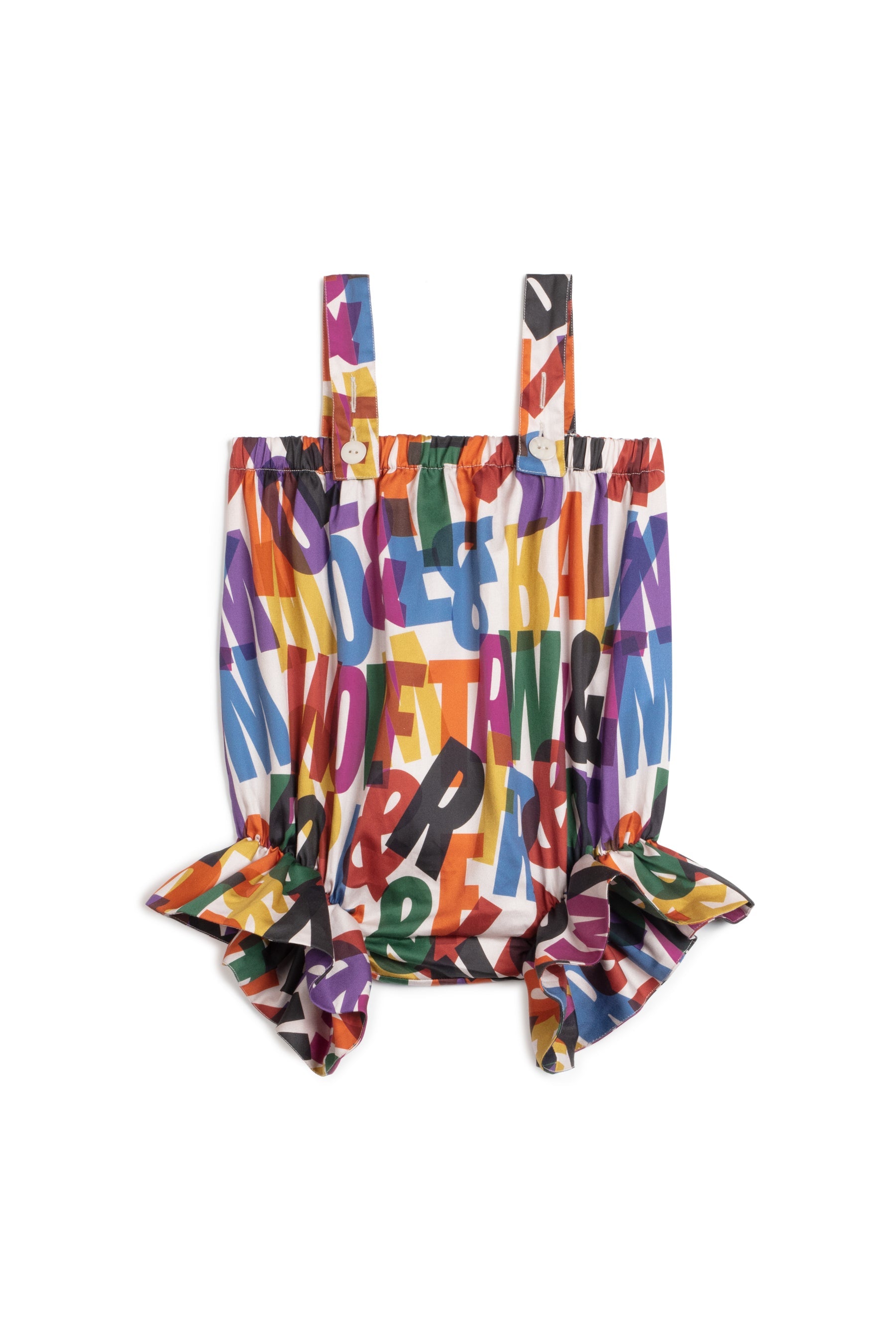 Sleeveless romper with adjustable straps, frill on legs and snap buttons between the legs