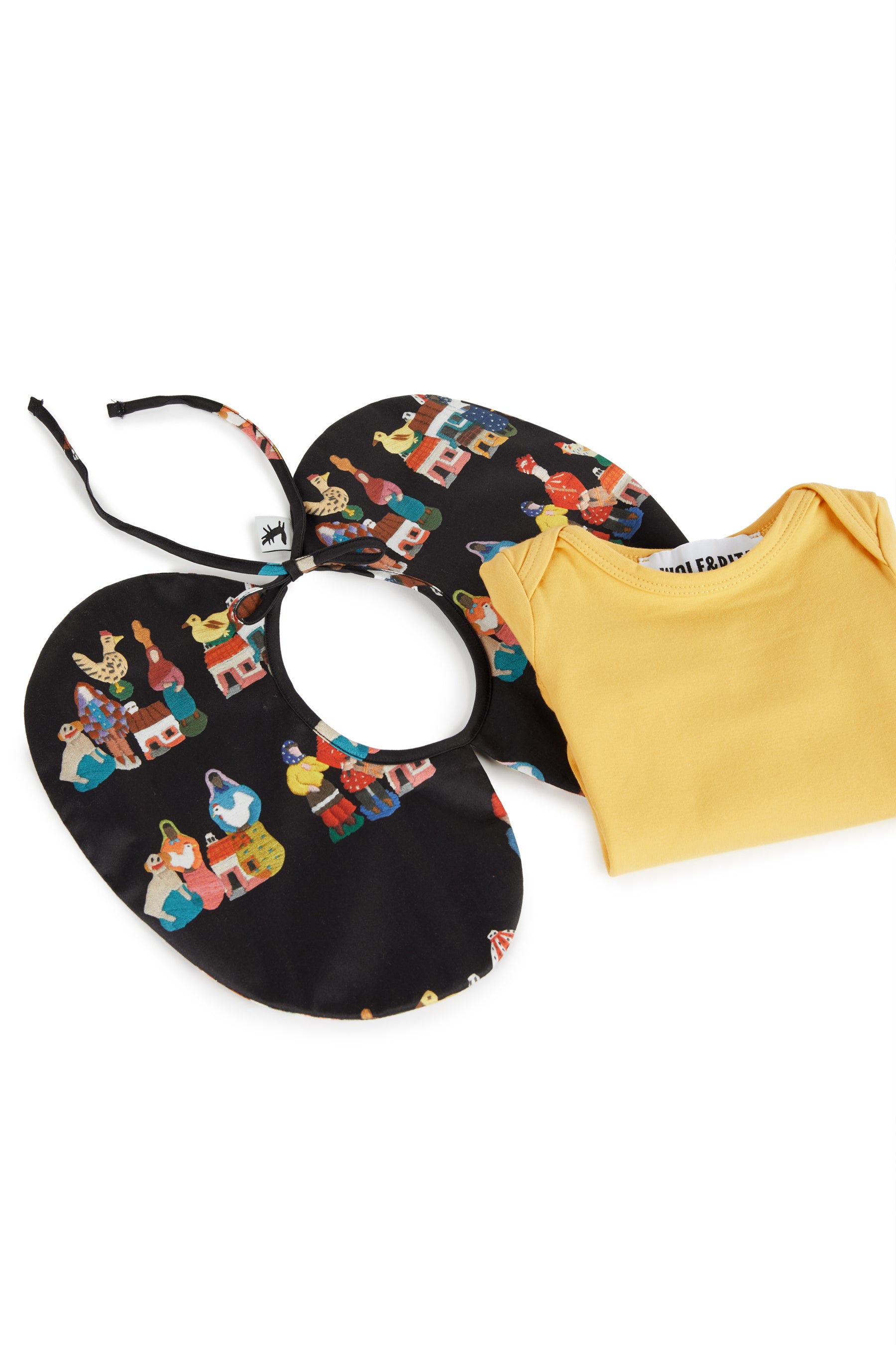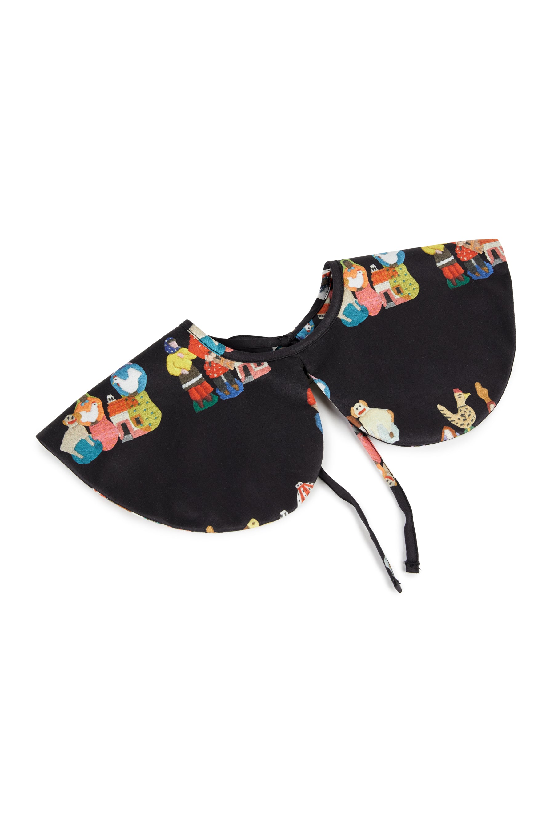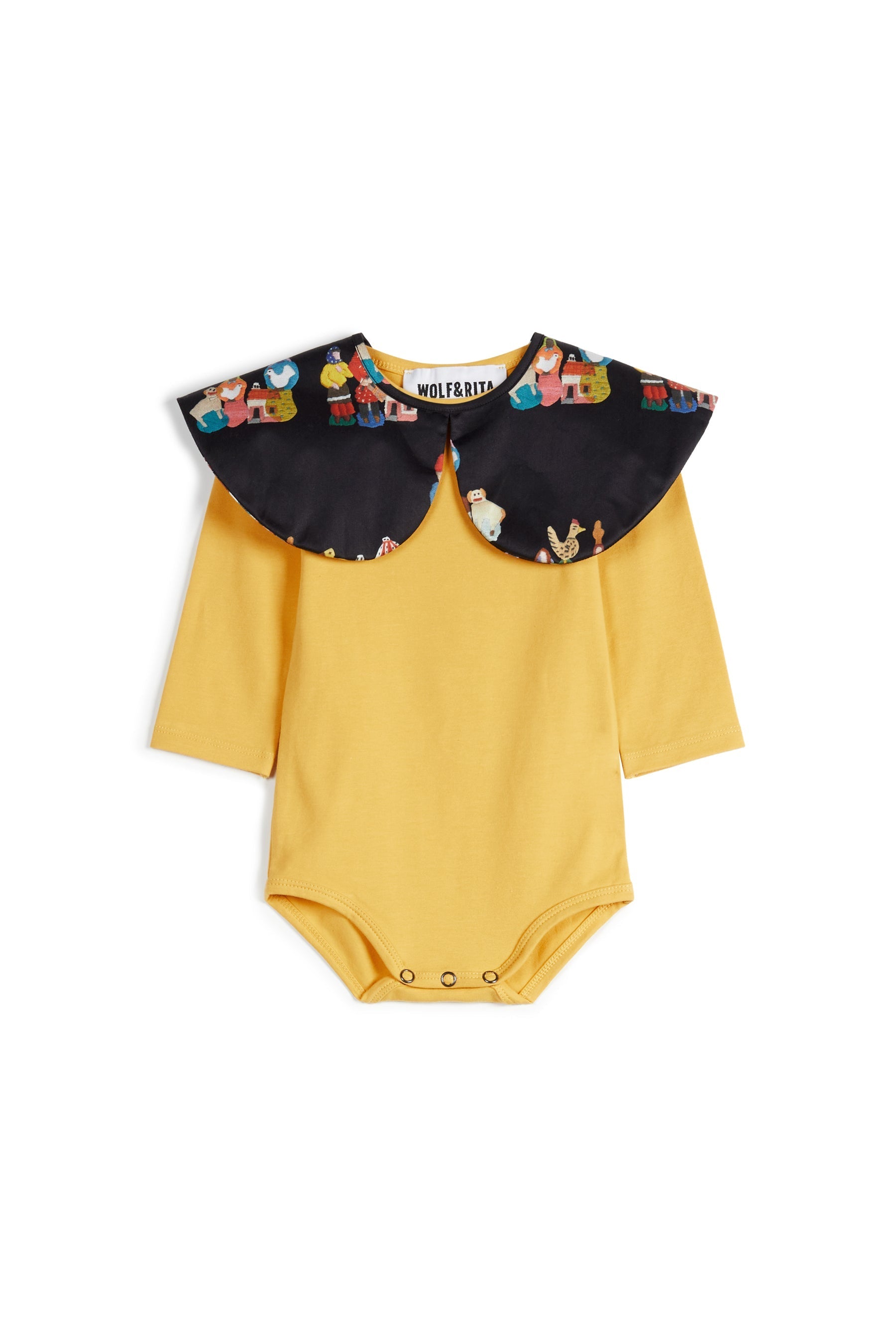 Long sleeved bodysuit with lap shoulders, snap buttons between the legs and removable collar