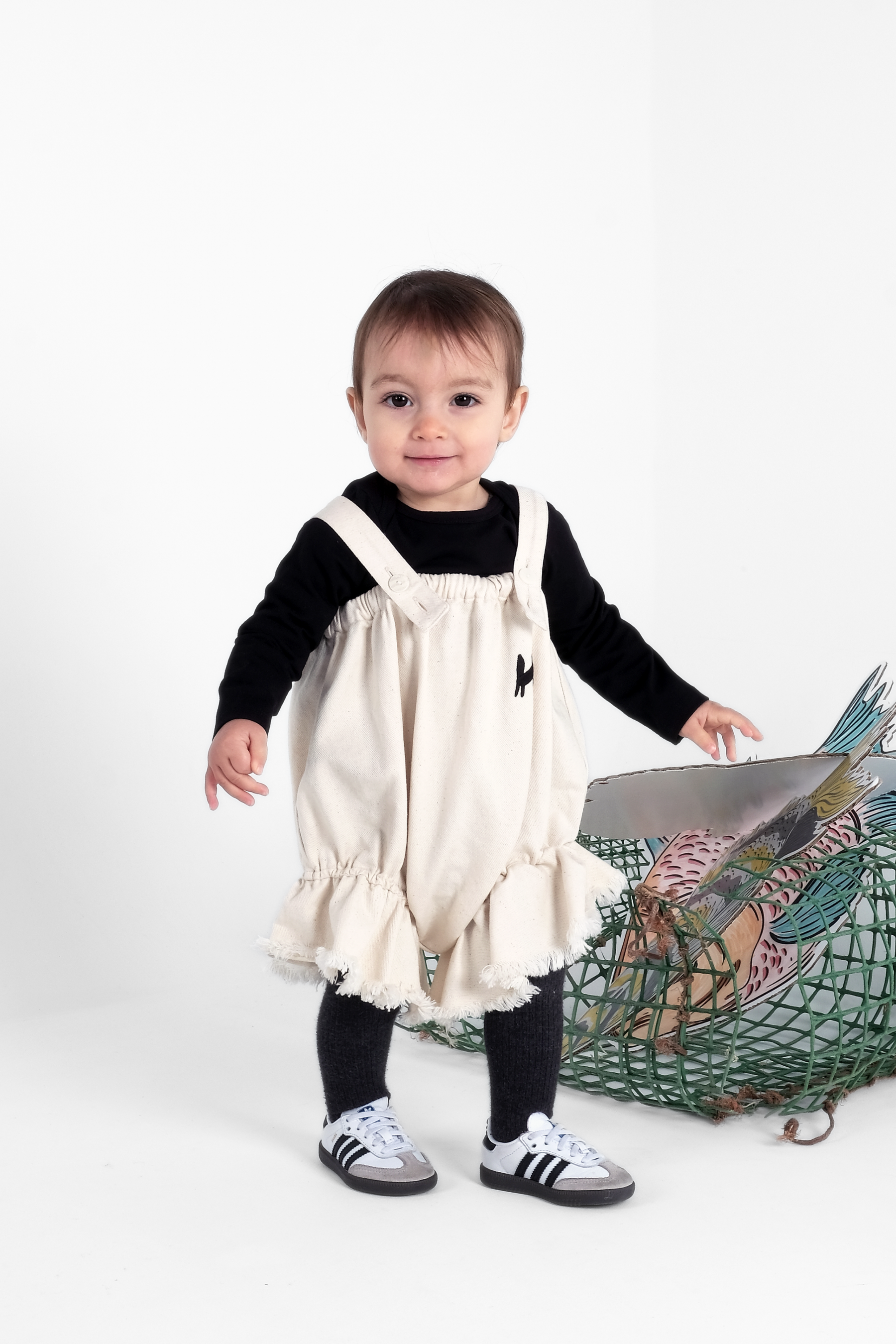 Sleeveless romper with adjustable straps, frill on legs with raw hems, snap buttons between the legs and small mascot embroidery