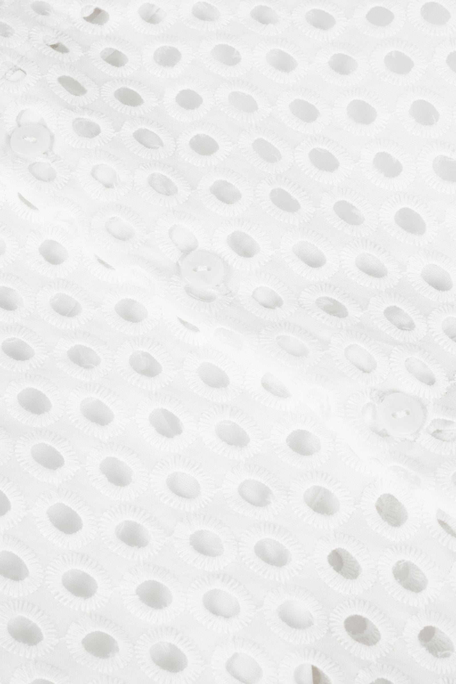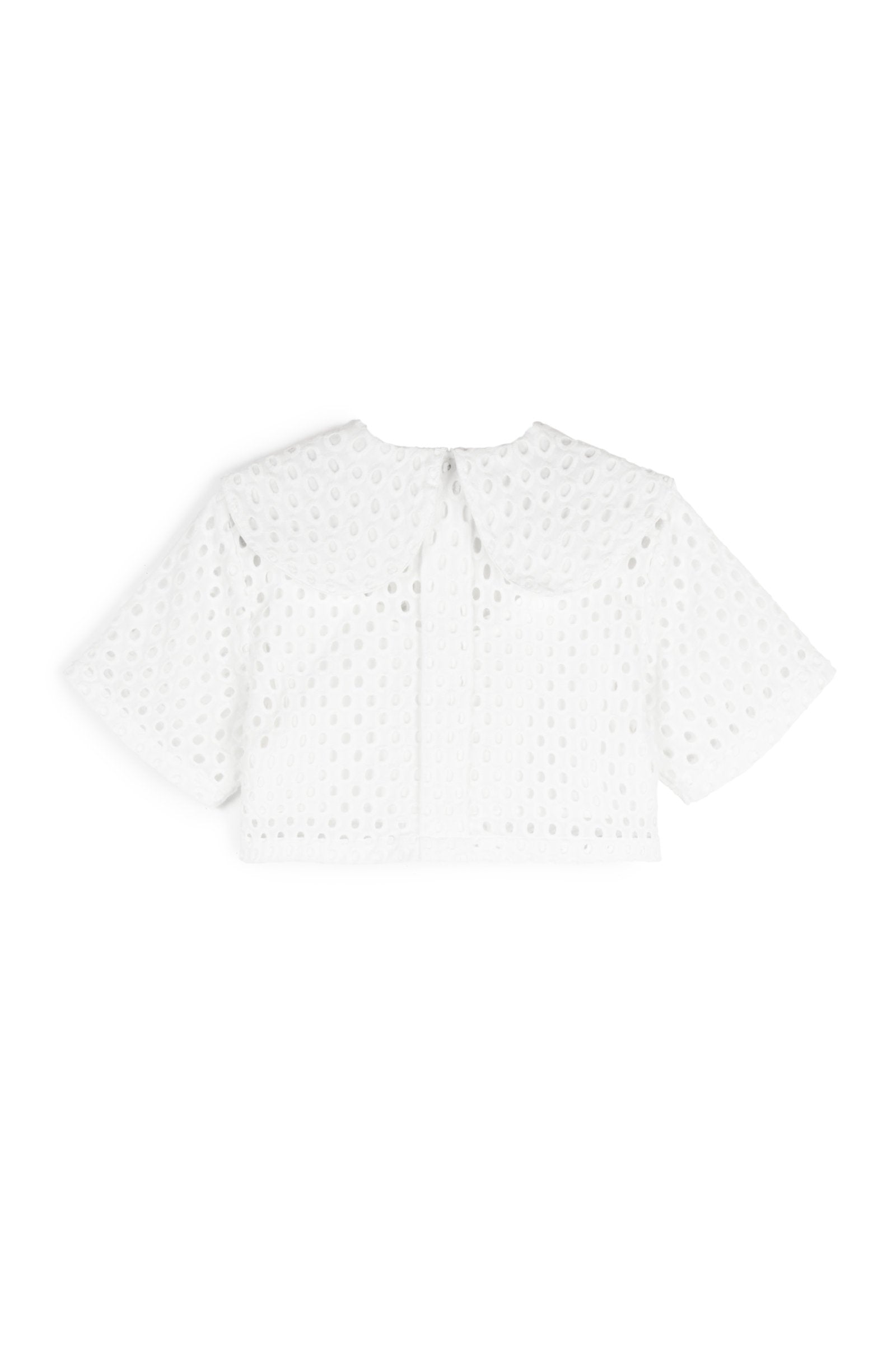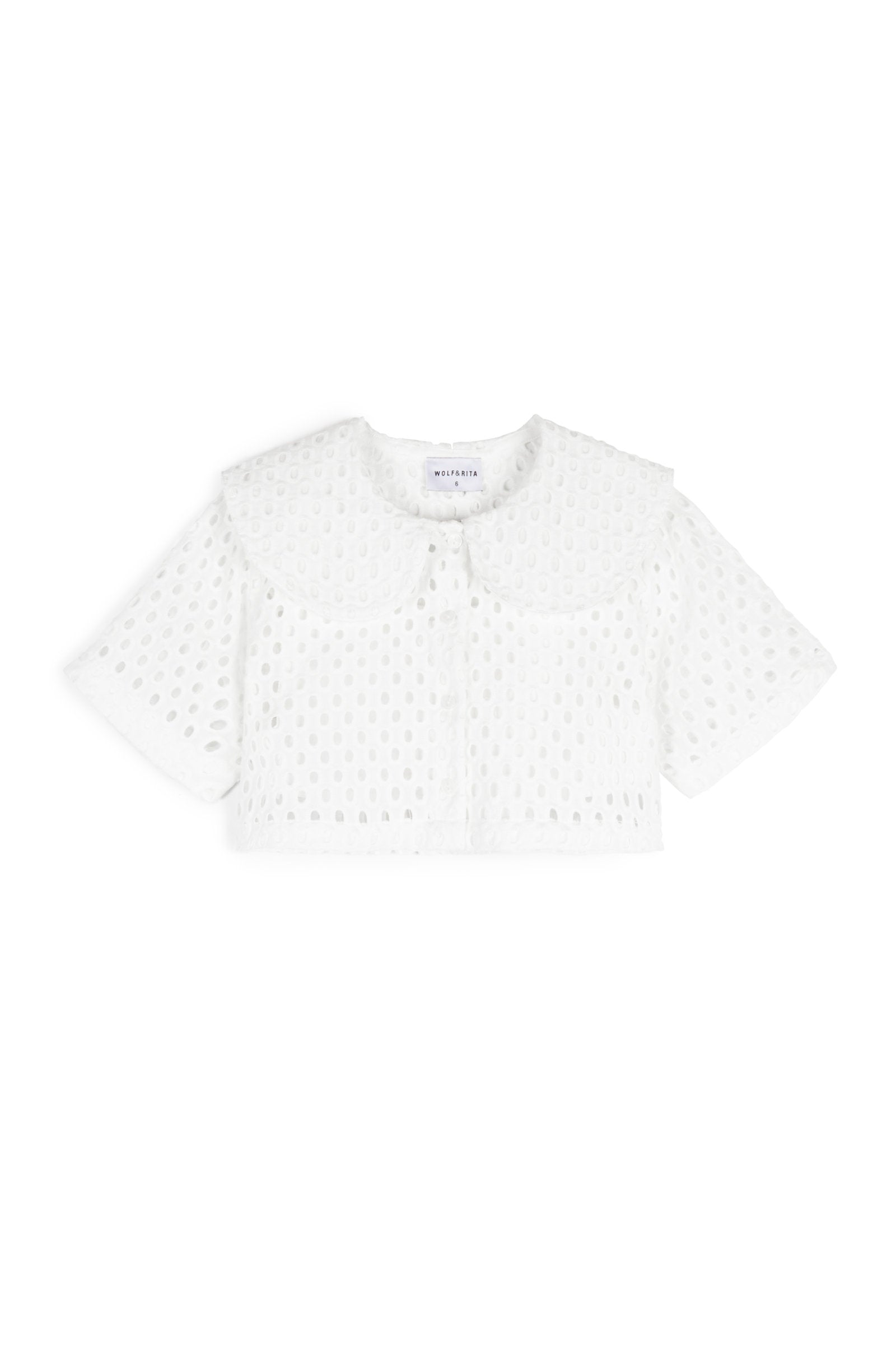 Embroidered (Broderie Anglaise) cropped blouse with short sleeves, round collar, back pleat, simple lining and front buttons