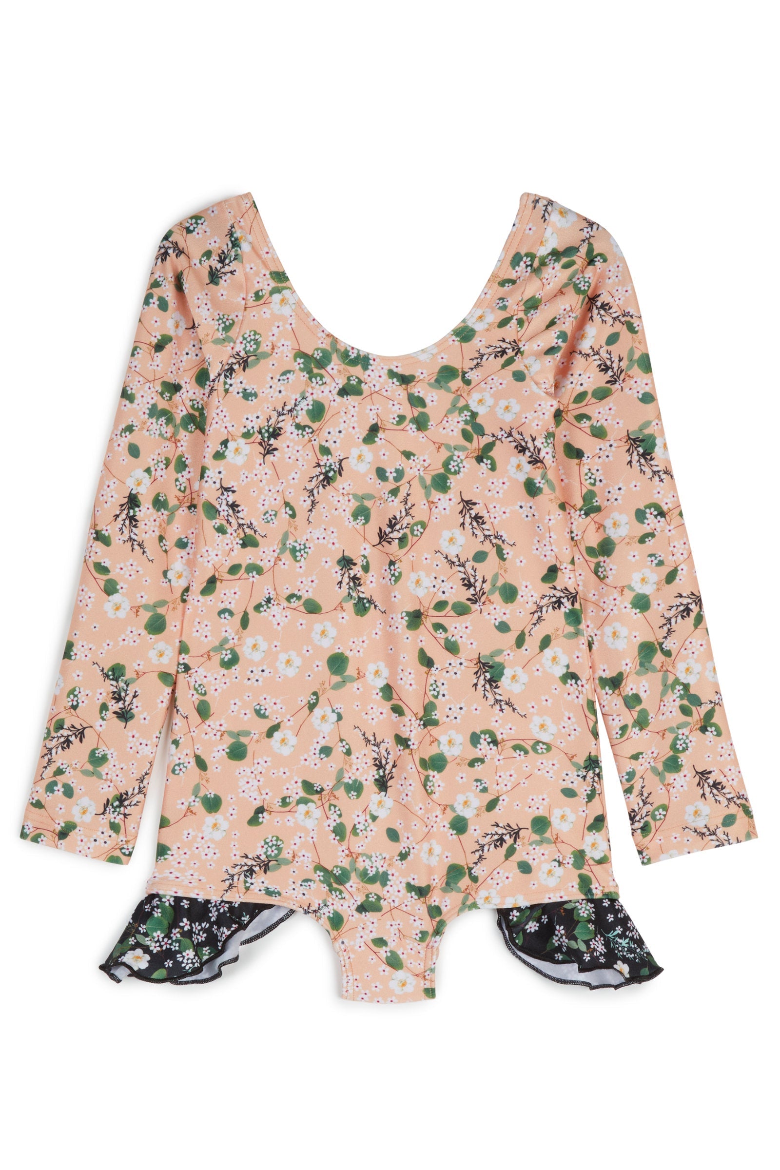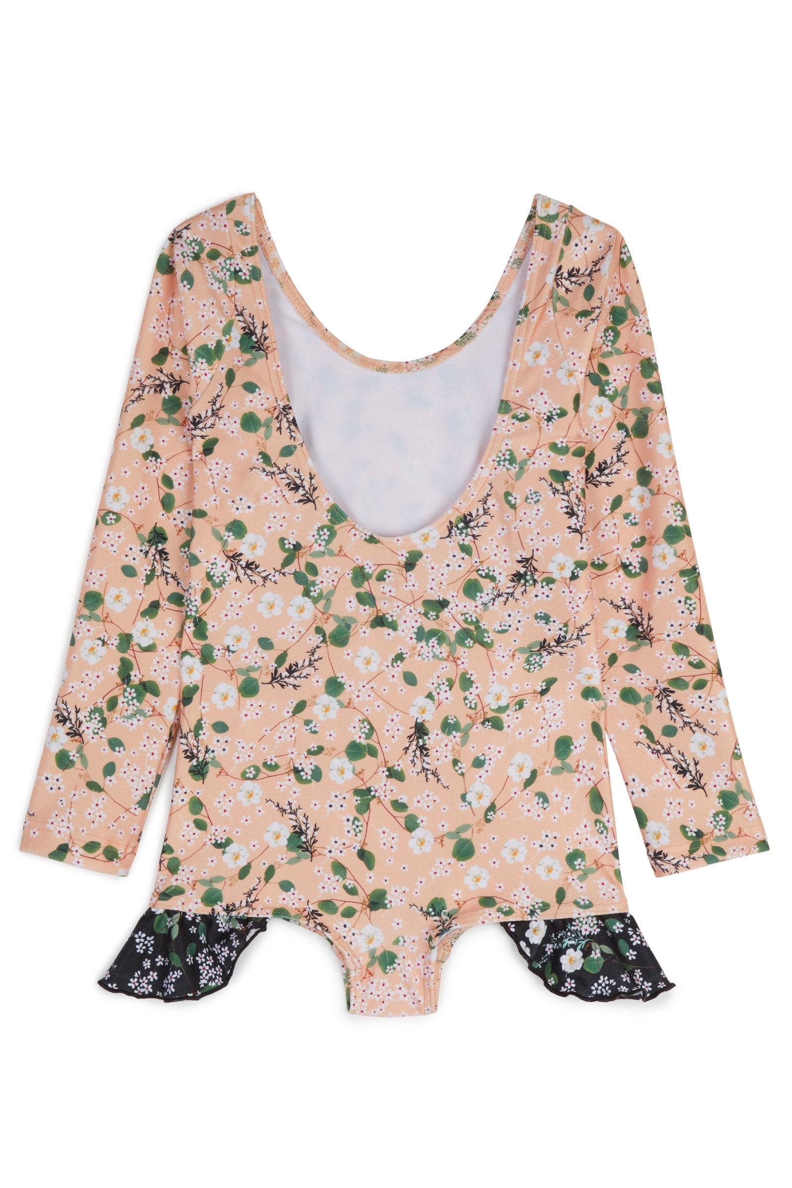 UV50+ long sleeved swimsuit with contrasted frills on legs